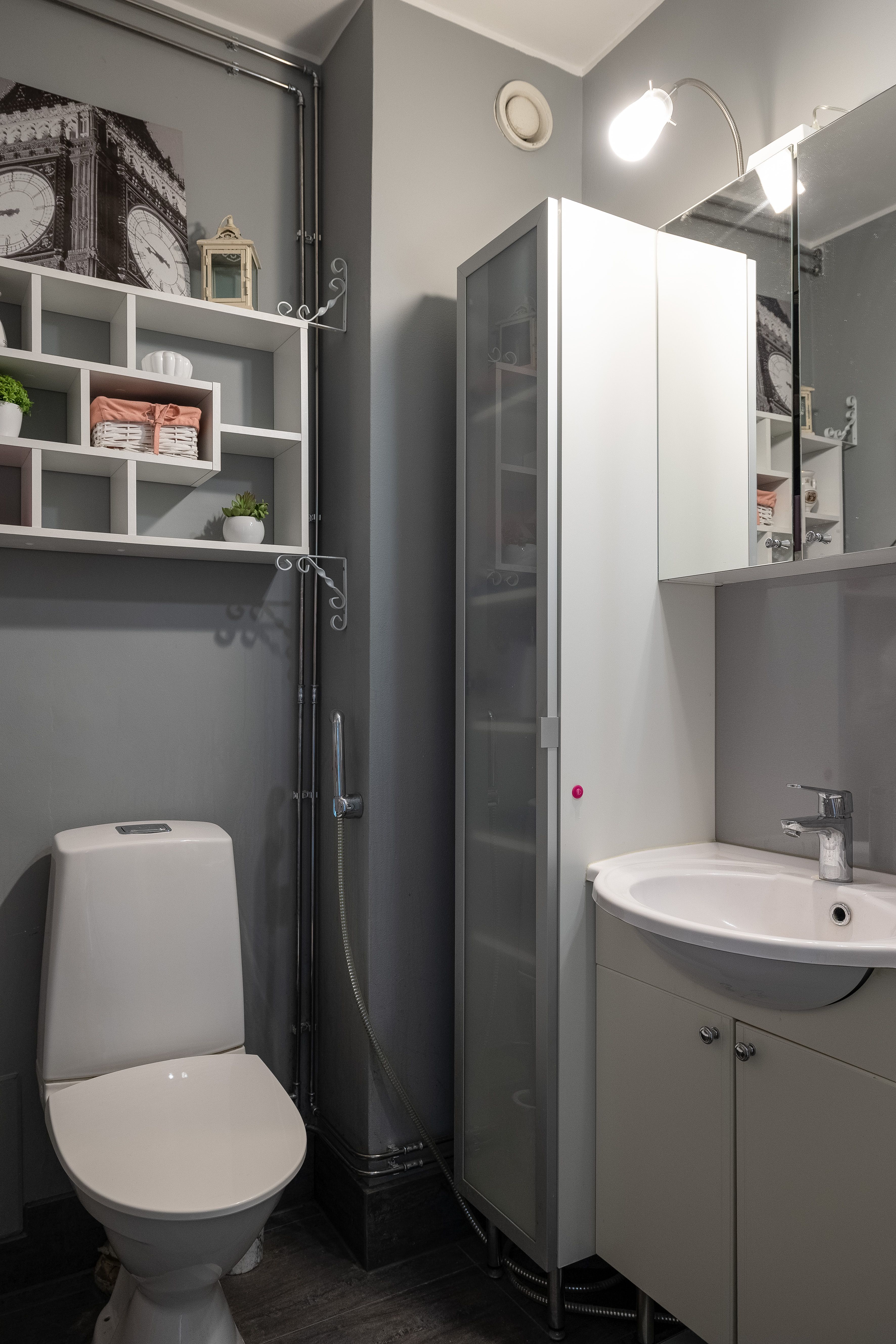 | WC-tilojen kuvaus | Lukumäärä: 1, WC-istuin, allaskaappi, pesuallas, peilikaappi ja bidee-suihku, seinät (Maali), lattiat (Laatta) |