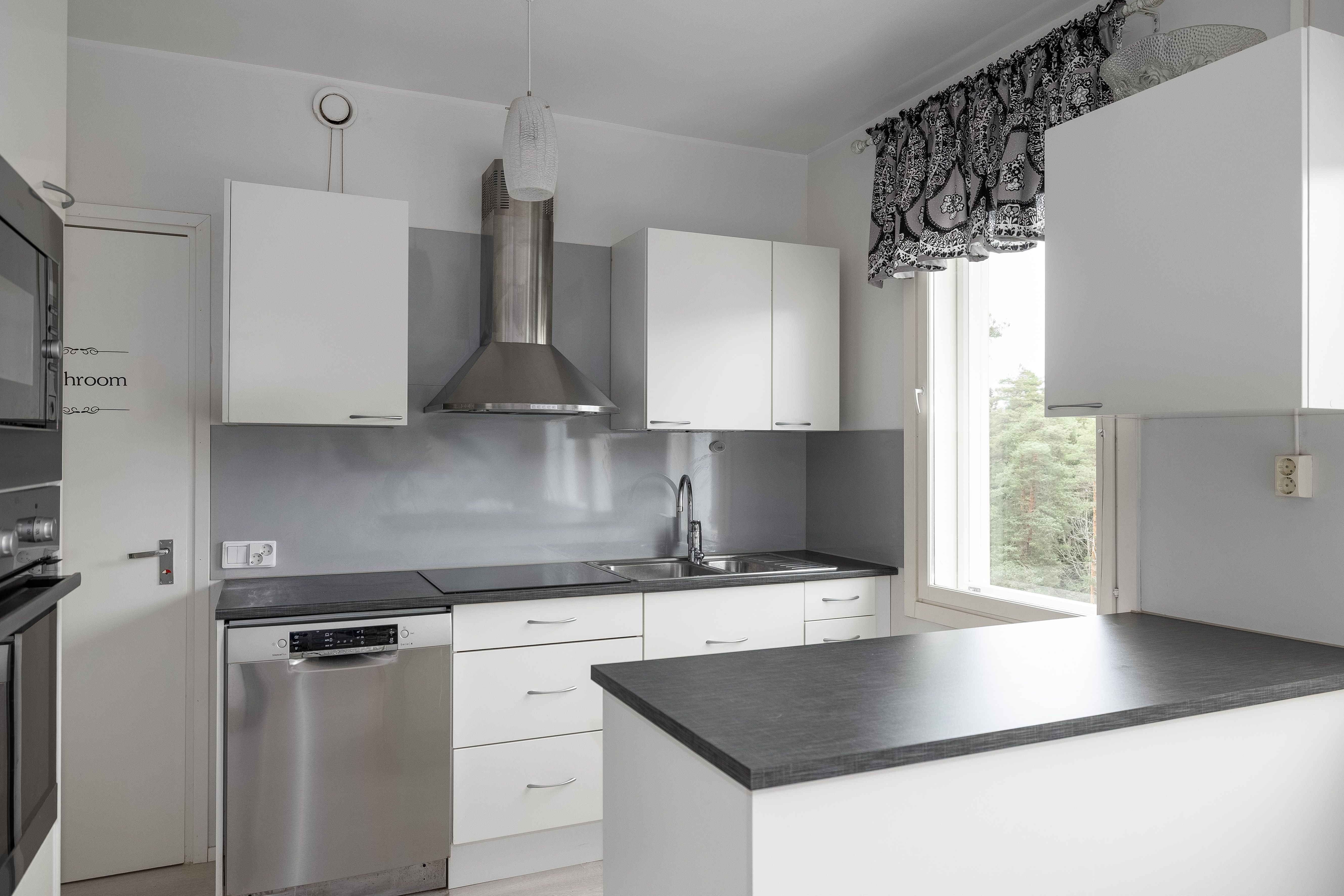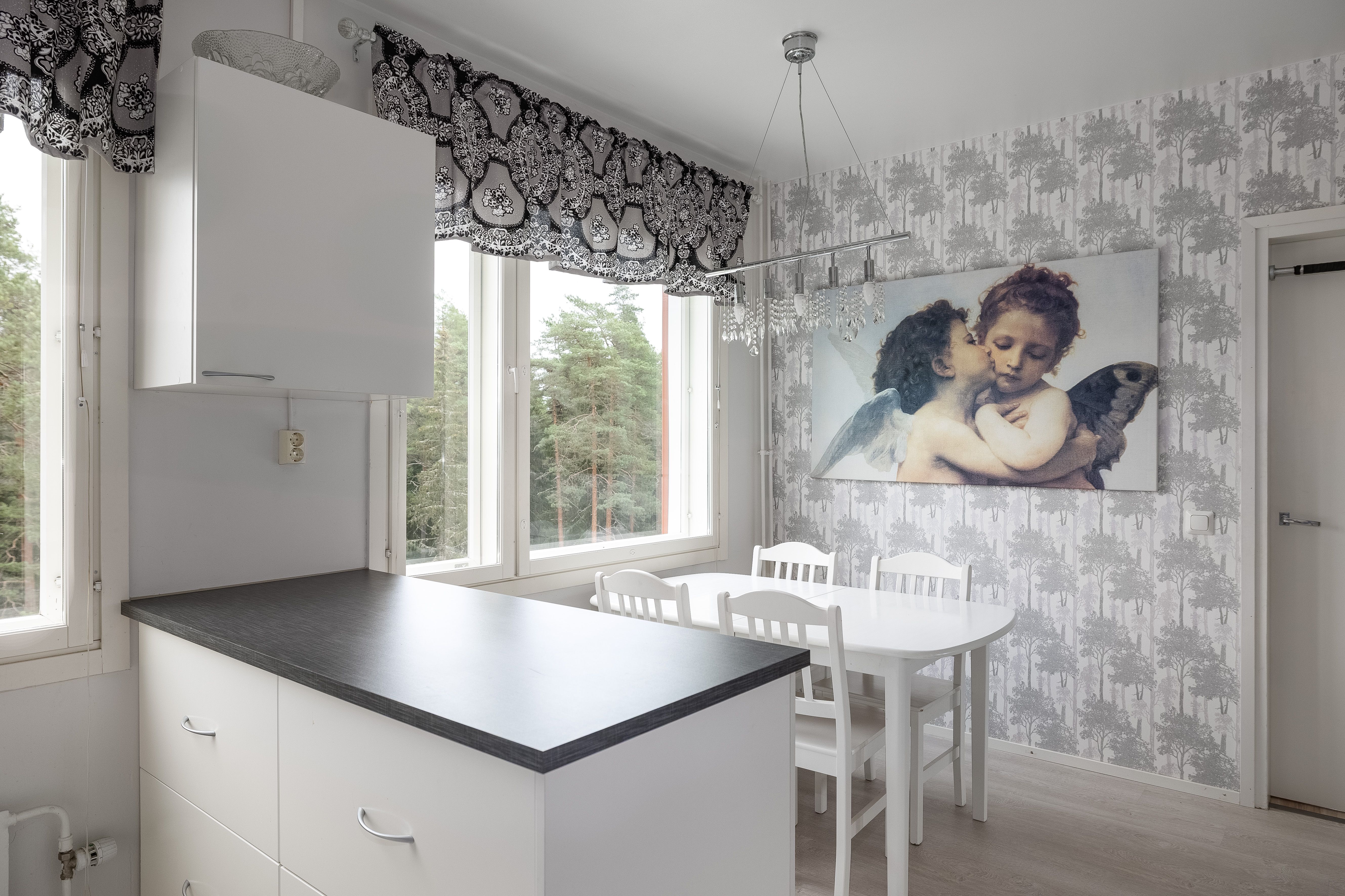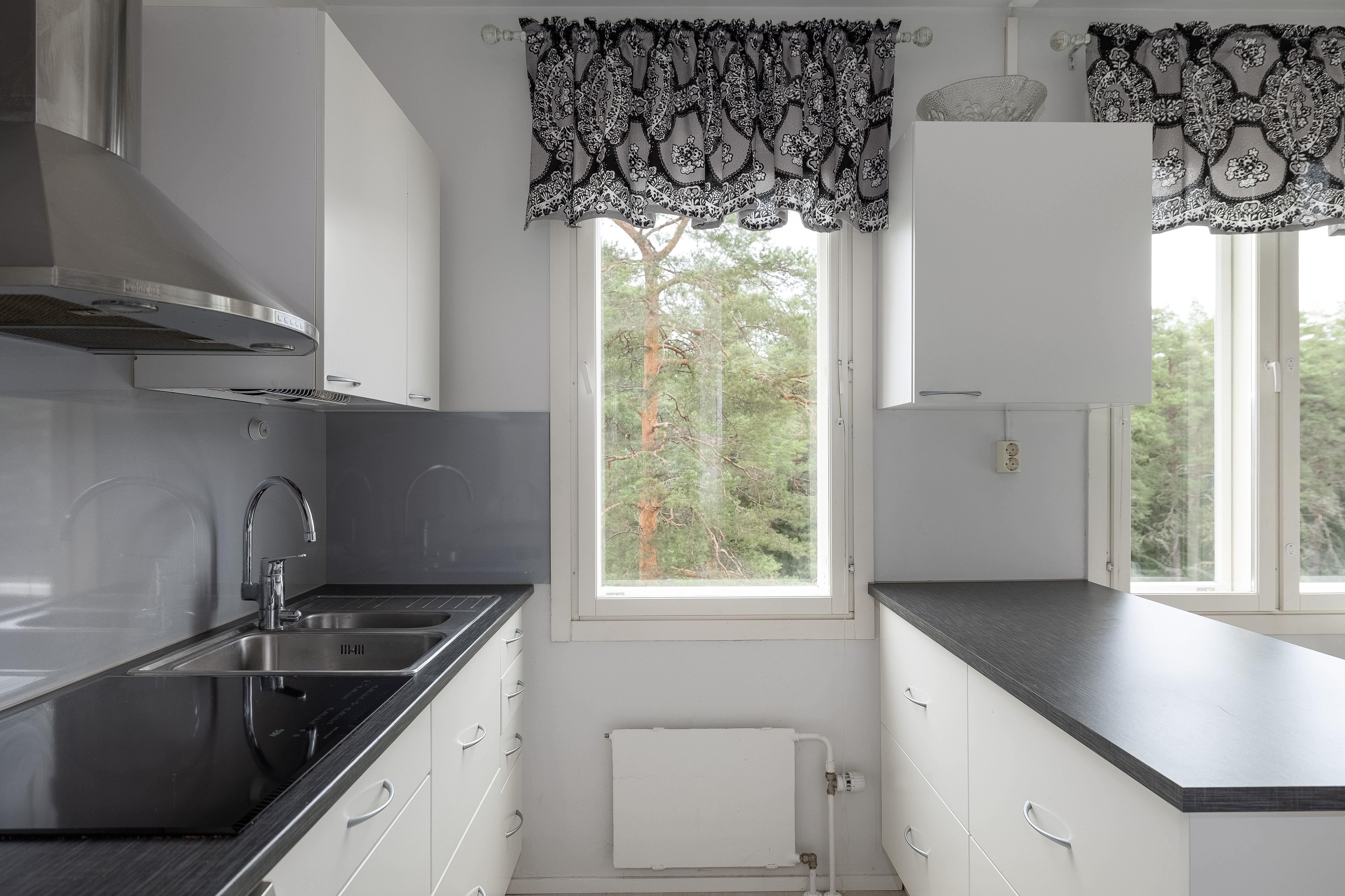 | Keittiön kuvaus | Liesi (Induktioliesi), työtasot (laminaatti), seinät (maali, tapetti ja muovilevy tiskialtaan takana.), lattiat (laminaatti), jääkaappipakastin, erillisuuni, astianpesukone, keittiösaareke, mikroaaltouuni, liesi ja liesituuletin |