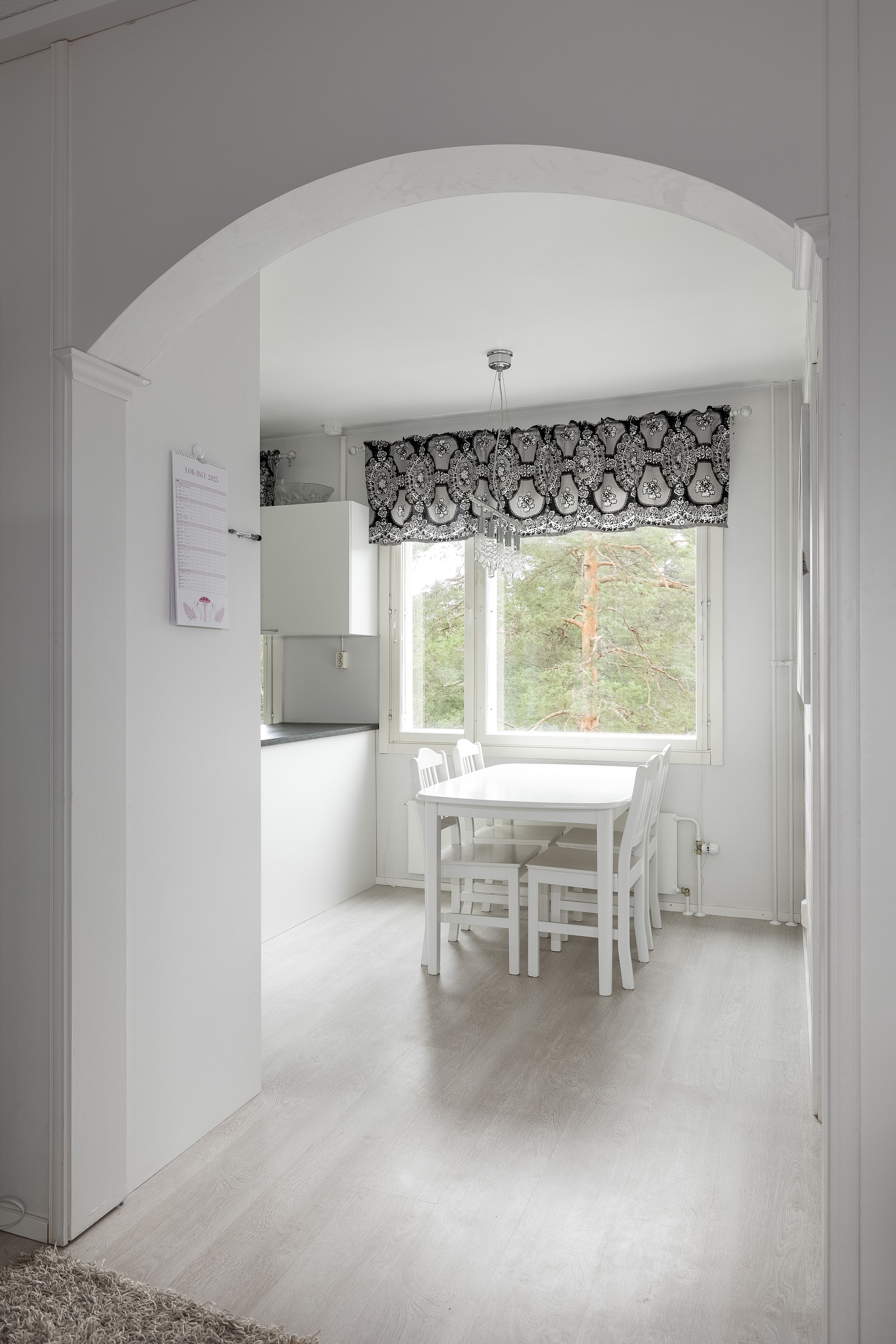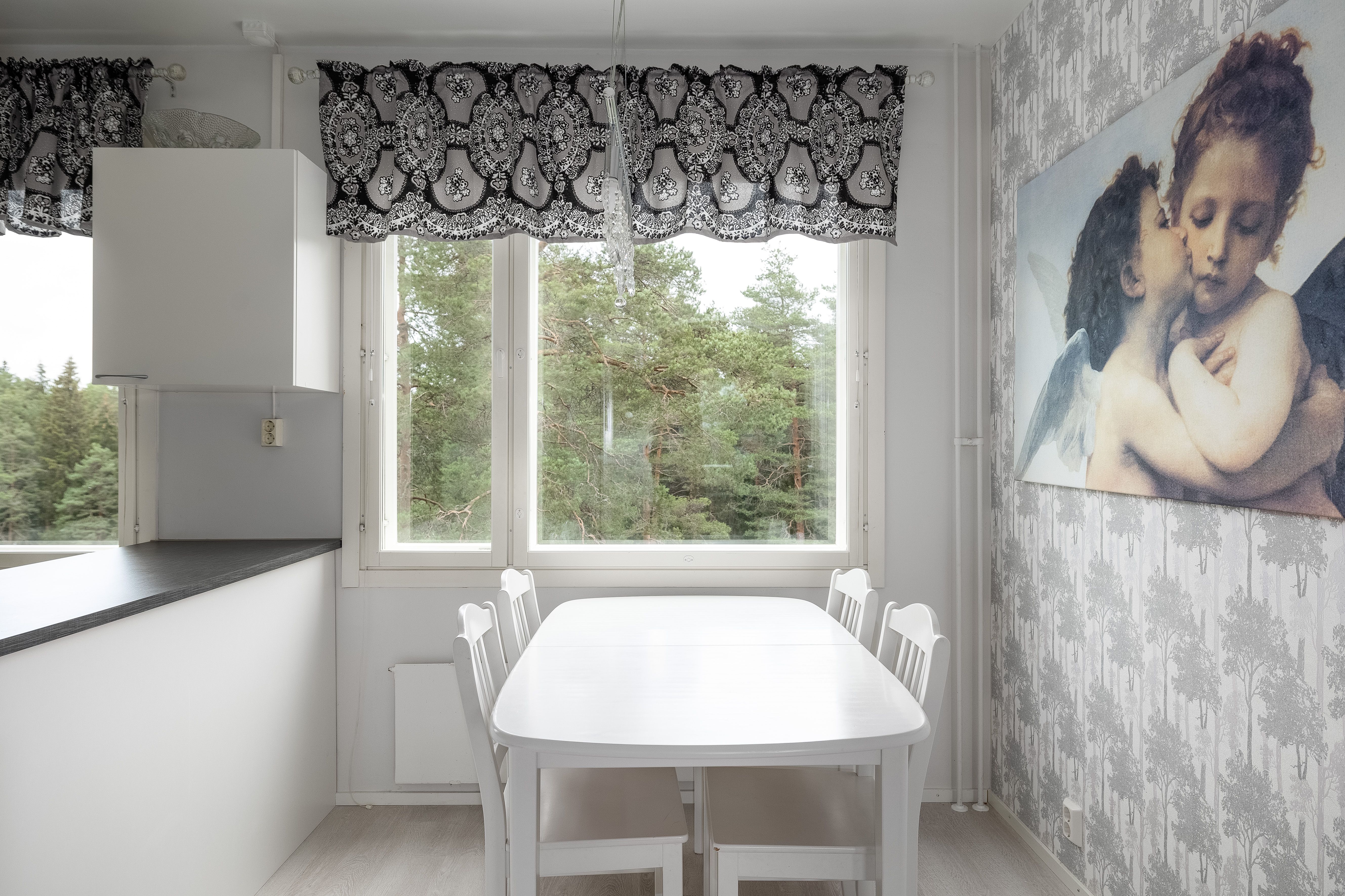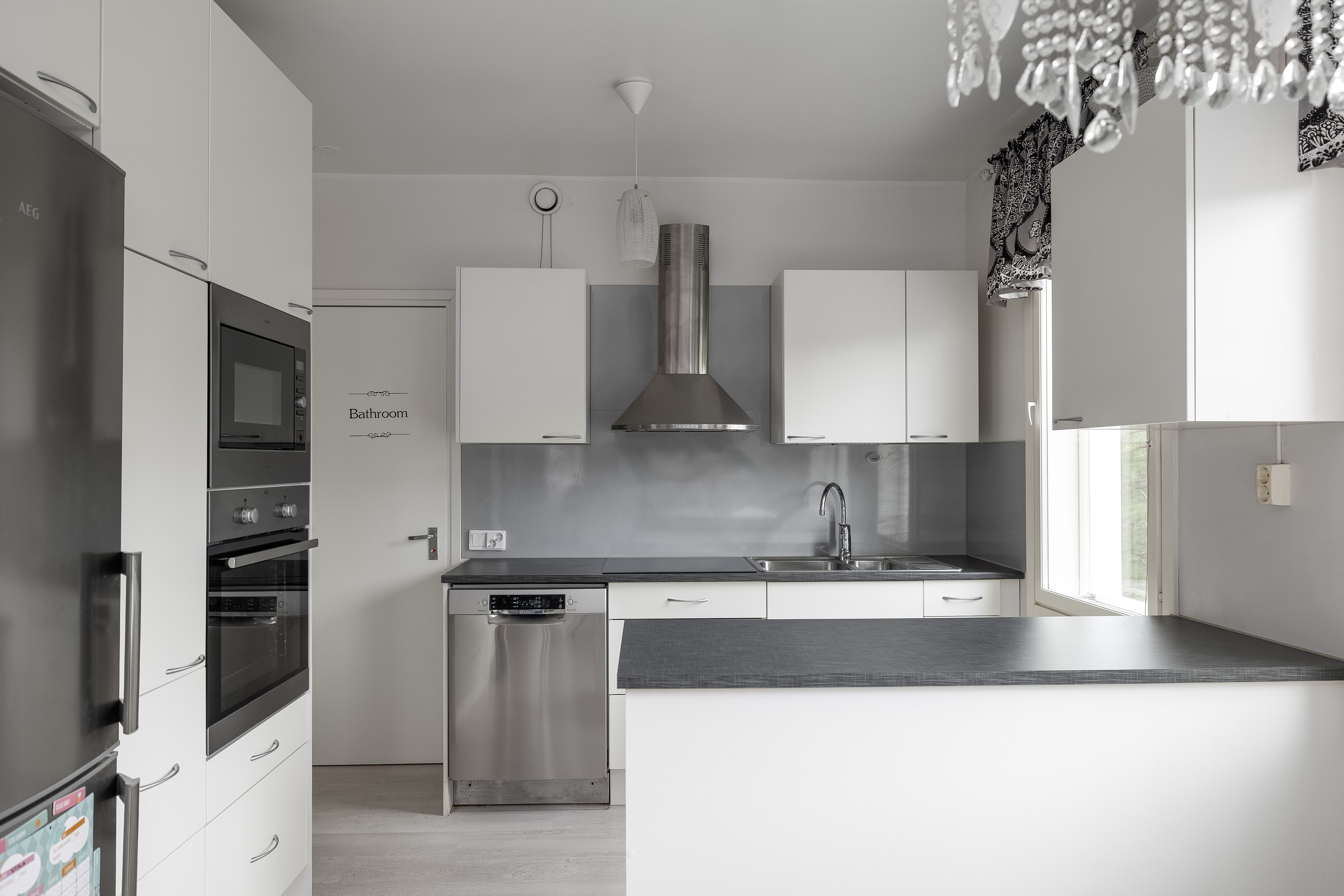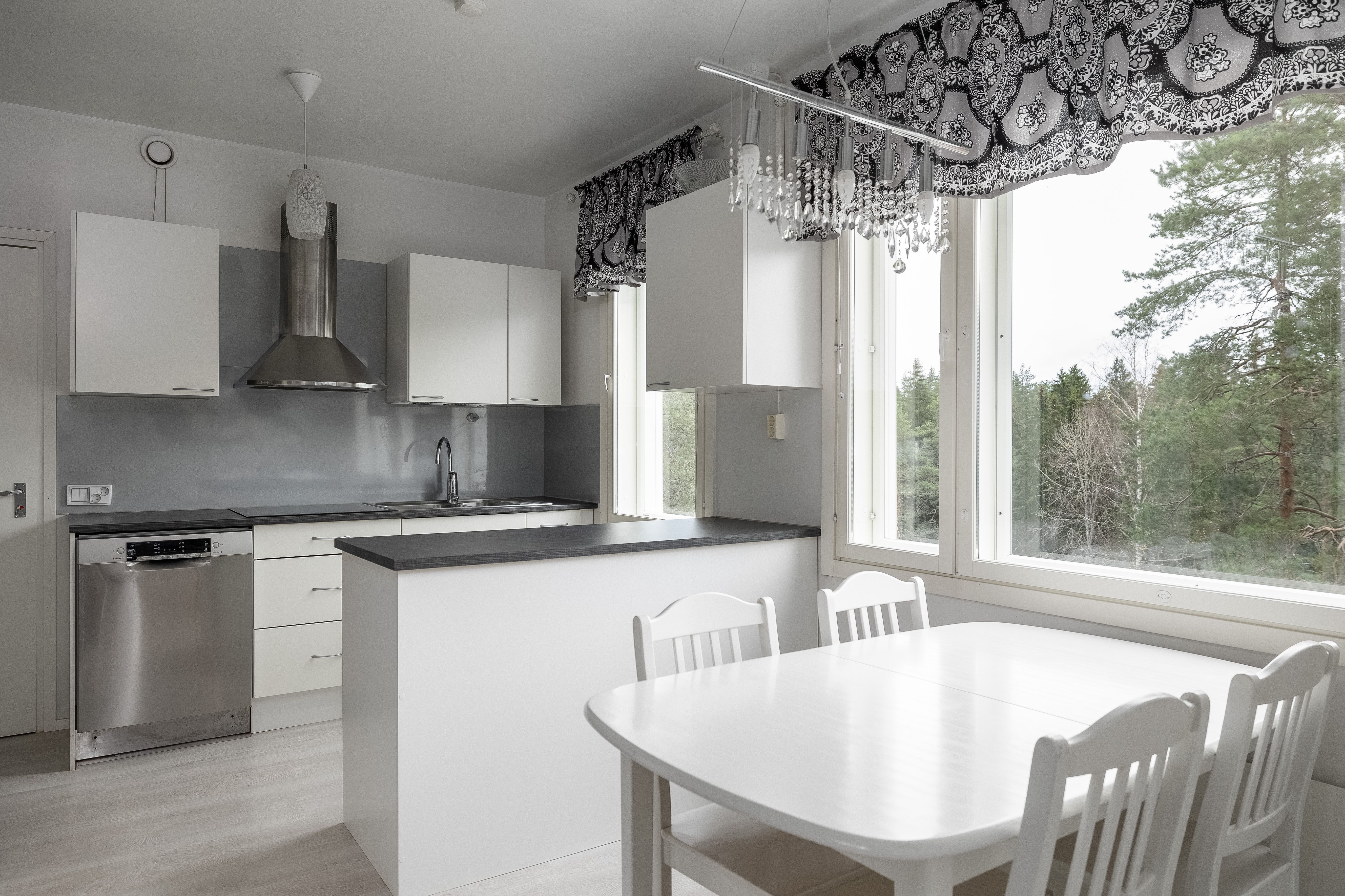 | Keittiön kuvaus | Liesi (Induktioliesi), työtasot (laminaatti), seinät (maali, tapetti ja muovilevy tiskialtaan takana.), lattiat (laminaatti), jääkaappipakastin, erillisuuni, astianpesukone, keittiösaareke, mikroaaltouuni, liesi ja liesituuletin |