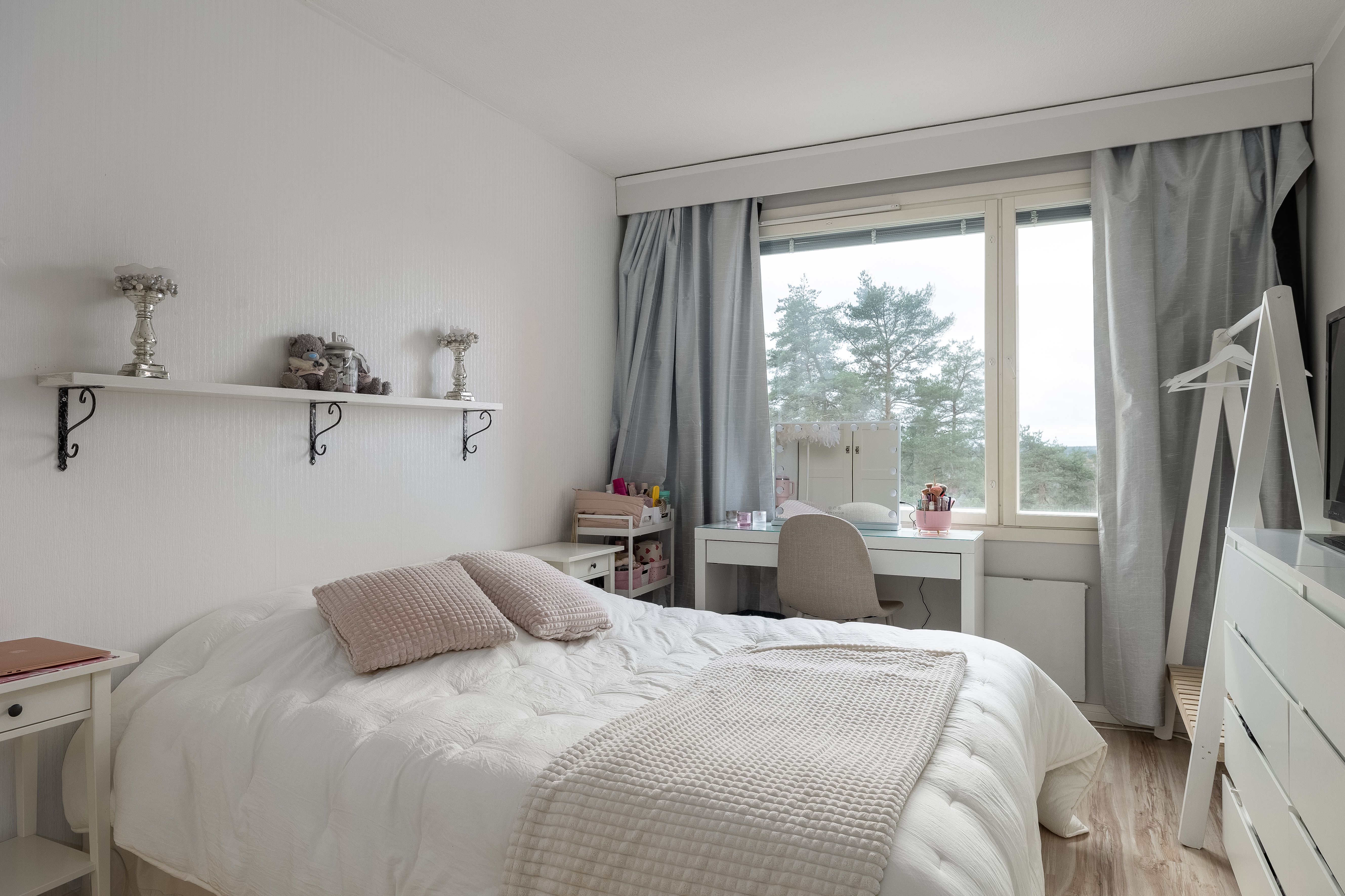 | Makuuhuoneen kuvaus | Lukumäärä: 3, seinät (maali ja tapetti), lattiat (laminaatti), Käynti lasitetulle parvekkeelle. |