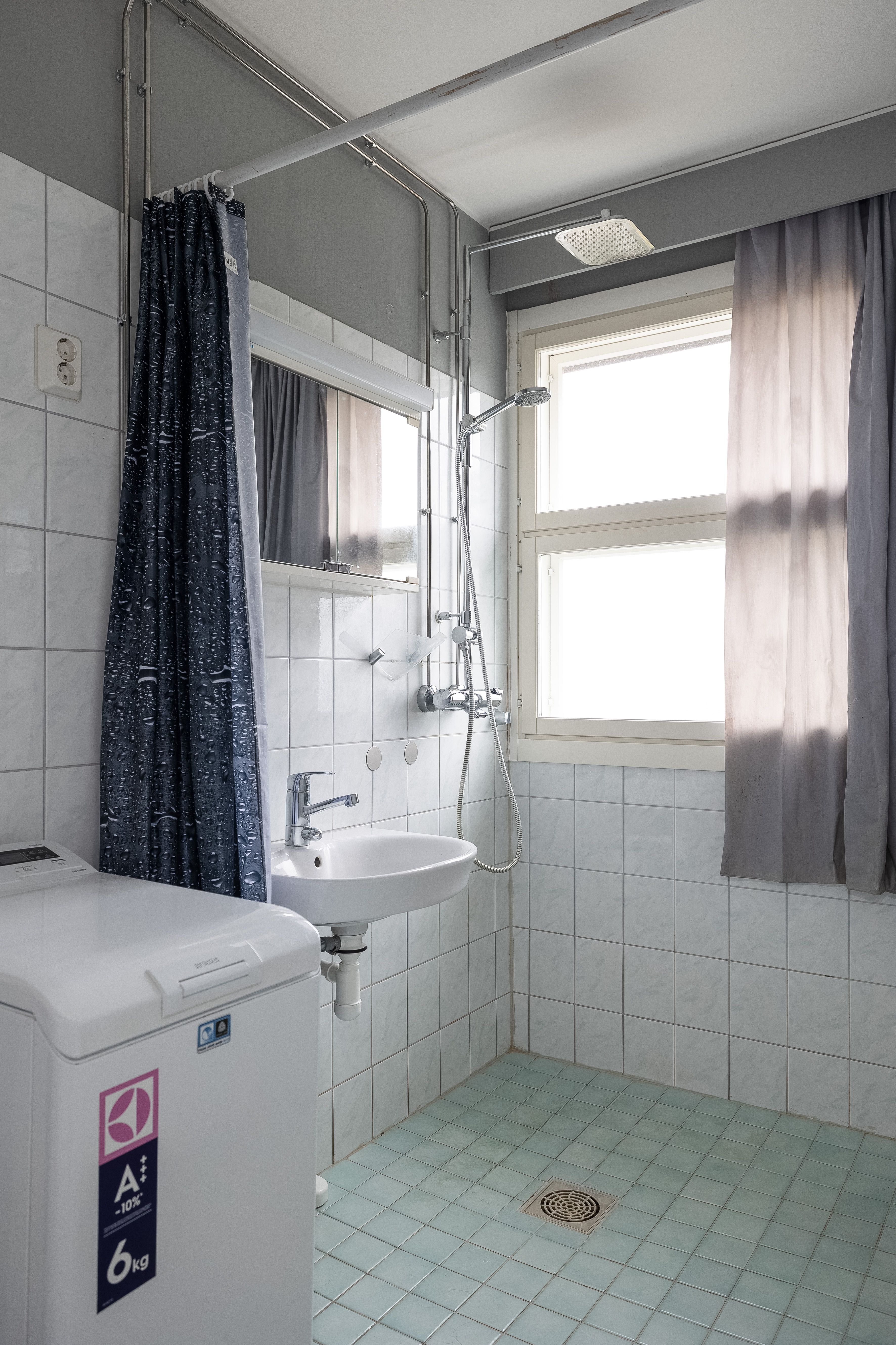 | Kylpyhuoneen kuvaus | Suihku, pesukoneliitäntä, pesuallas ja peilikaappi, seinät (maali ja osalaatoitus), lattiat (laatta) |