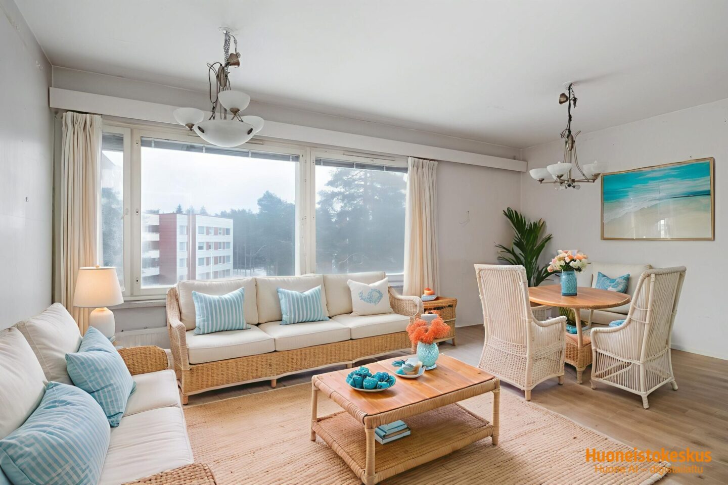 | Olohuoneen kuvaus | Seinät (maali), lattiat (laminaatti), Tilava olohuone isoilla ikkunoilla joissa kauniit ikkunalaudat , maalatut seinät, |