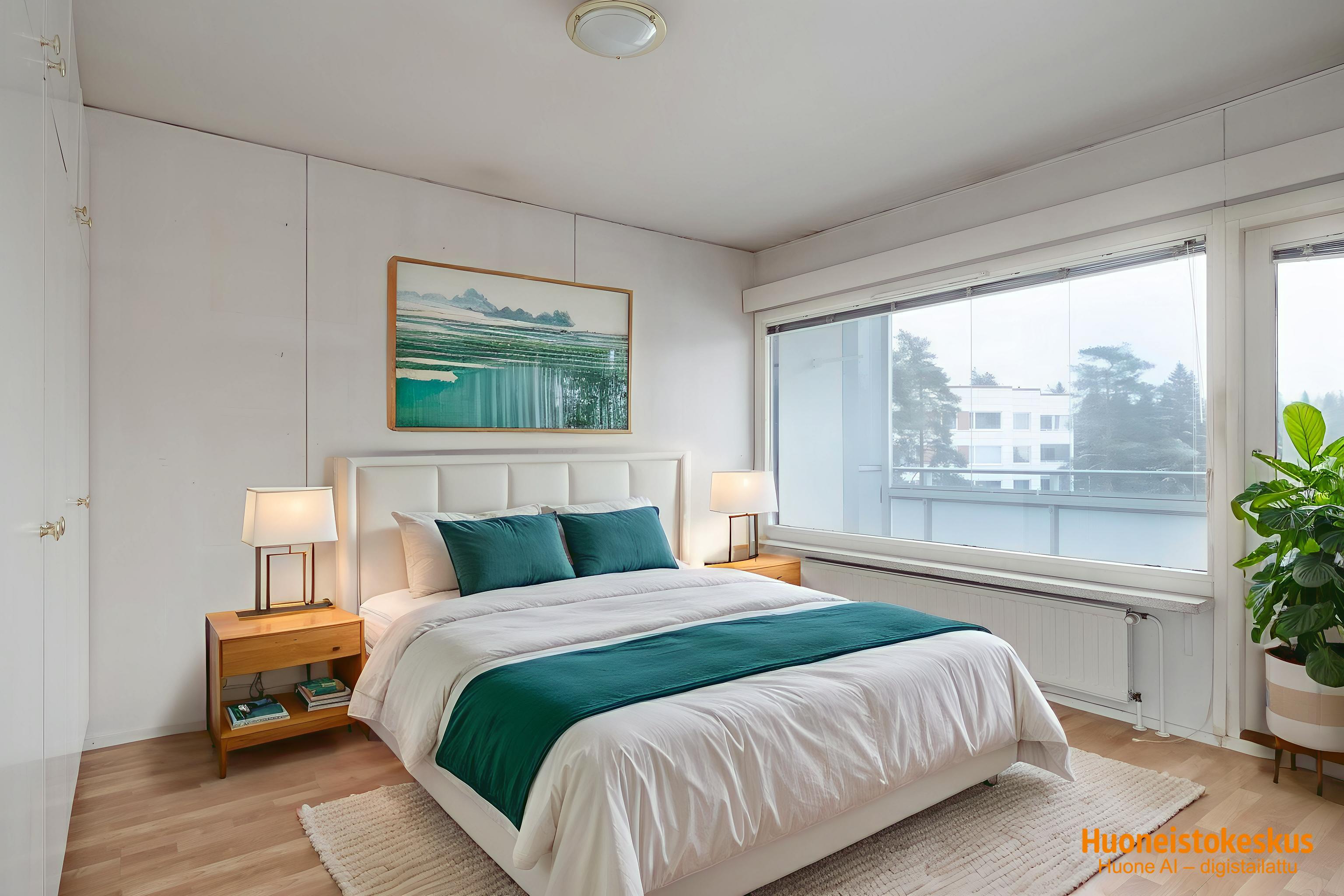 | Makuuhuoneen kuvaus | Lukumäärä: 1, seinät (maali), lattiat (laminaatti), Makuuhuoneesta pääsy koko huoneen levyiselle lasitetulle parvekkeelle. |