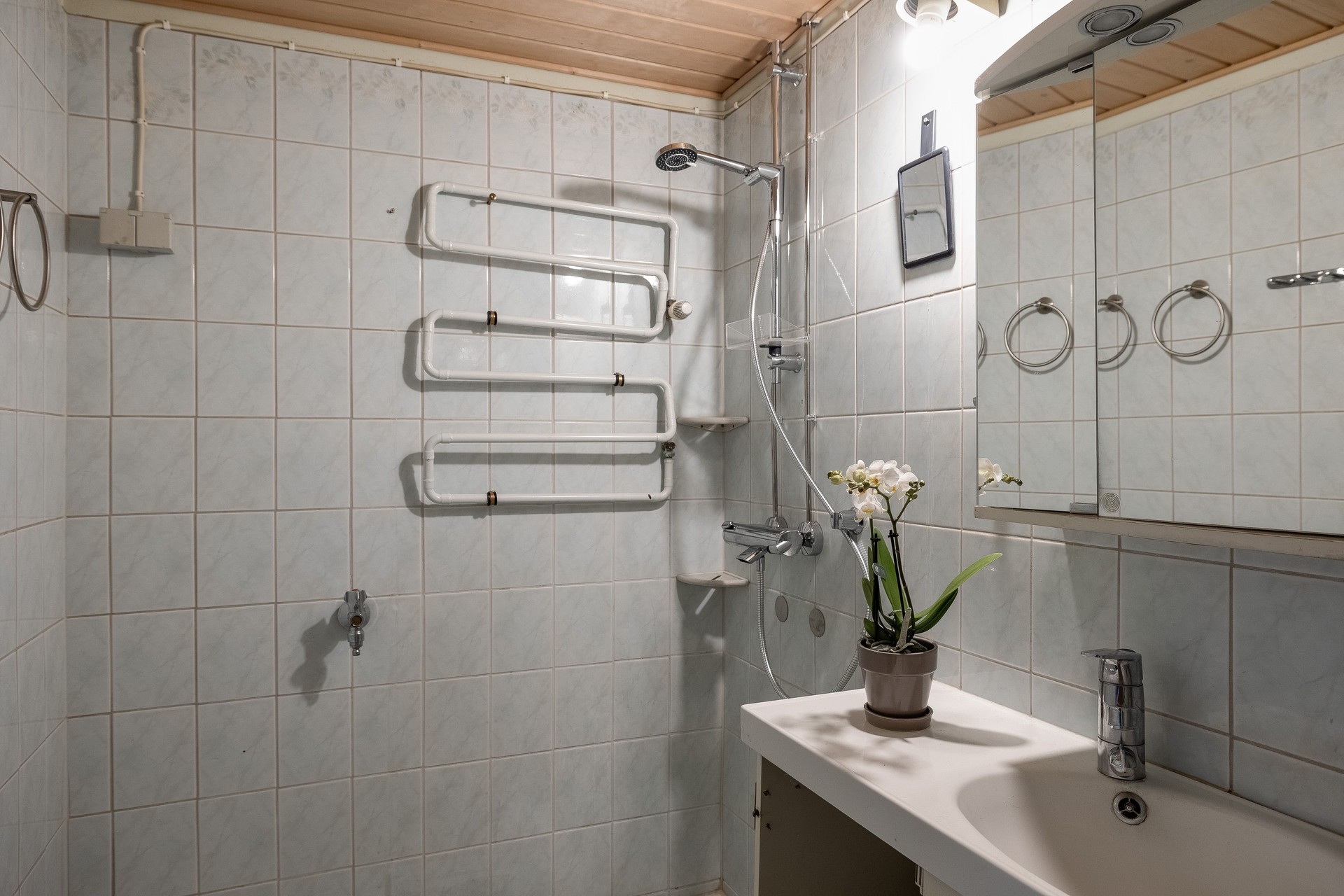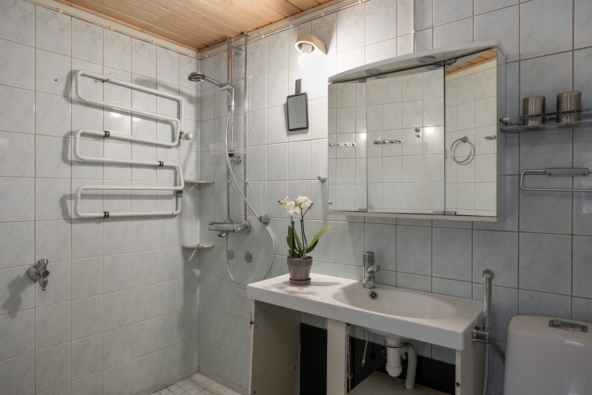 | Kylpyhuoneen kuvaus | WC-istuin, suihku, pesukoneliitäntä, bidee-suihku, pesuallas ja peilikaappi, seinät (kaakeli), lattiat (laatta) |