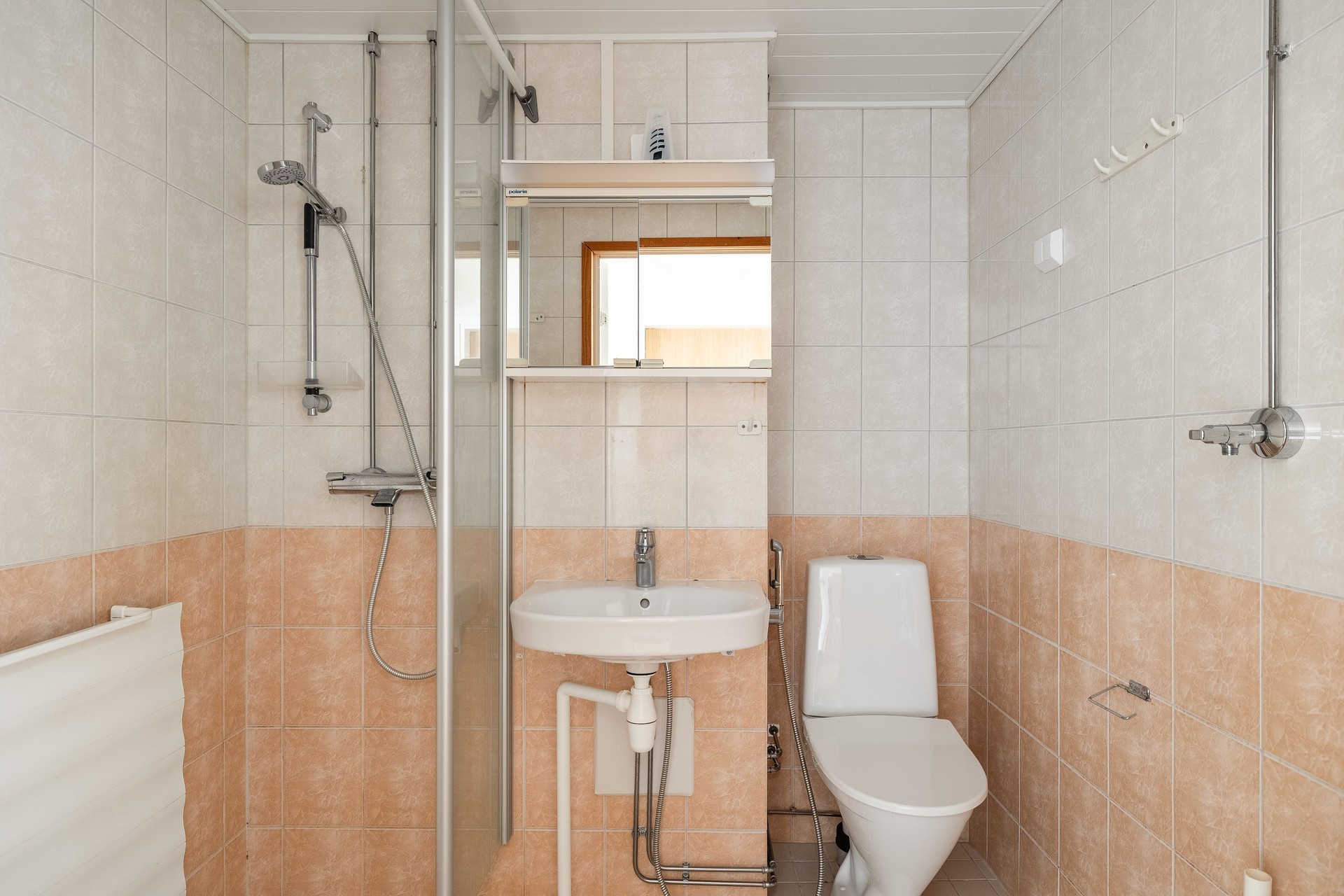 | Kylpyhuoneen kuvaus | WC-istuin, suihku, suihkuseinä, pesukoneliitäntä, peilikaappi ja bidee-suihku, seinät (kaakeli), lattiat (laatta) |