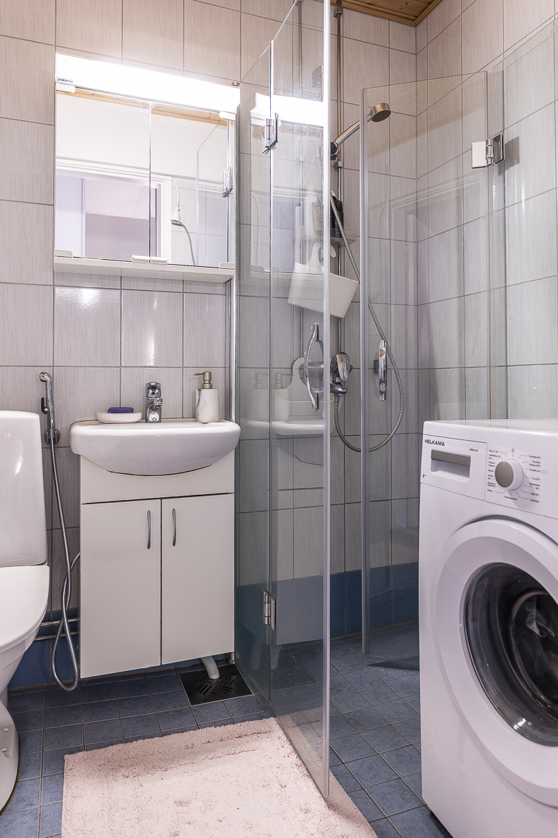 | Kylpyhuoneen kuvaus | Suihkuseinä, pesukoneliitäntä, wc-istuin, peilikaappi, suihku ja allaskaappi, seinät (kaakeli), lattiat (laatta) |
