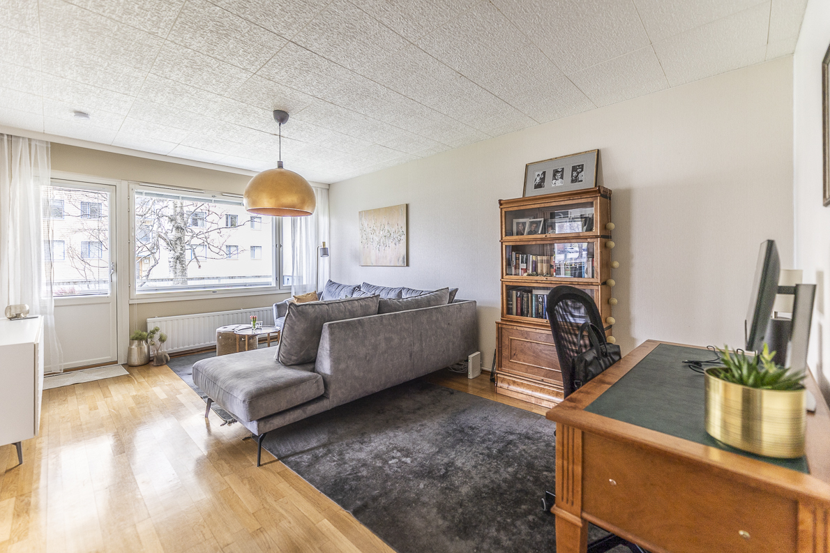 Lasitettu parveke lännen suuntaan avautuu vehreään näkymään. Asunto sijaitsee kadun puoleisessa päädyssä ilman seinänaapureita makuuhuoneiden kohdalla, ja ikkunat on hyvin äänieristetty. Säilytystilaa tässä kodissa on runsaasti: koko seinän levyiset liukuovikaapistot eteisessä ja kahdessa makuuhuoneessa sekä oma kellari- ja vinttikomero.
