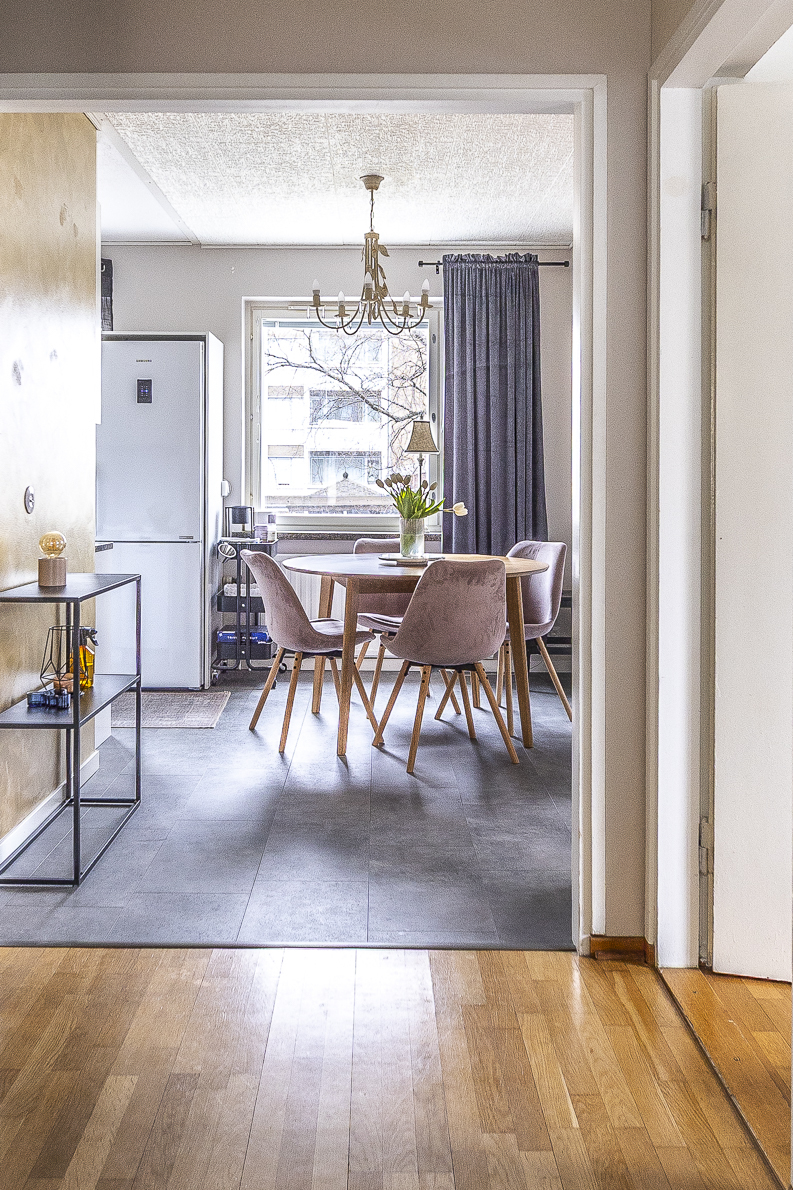 | Olohuoneen kuvaus | Seinät (maali ja tapetti), lattiat (parketti), Tilava olohuone, johon mahtuu hyvin sekä sohva-alue, että työpiste tai vaikka väliseinä ja alkovi. |