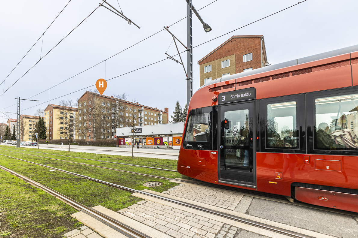 Sijainti on erinomainen erityisesti autottomalle: ratikkapysäkki on muutaman askeleen päässä. Kaikki tarvittava löytyy kävelyetäisyydeltä ja Tampereen keskusta aivan lähellä.