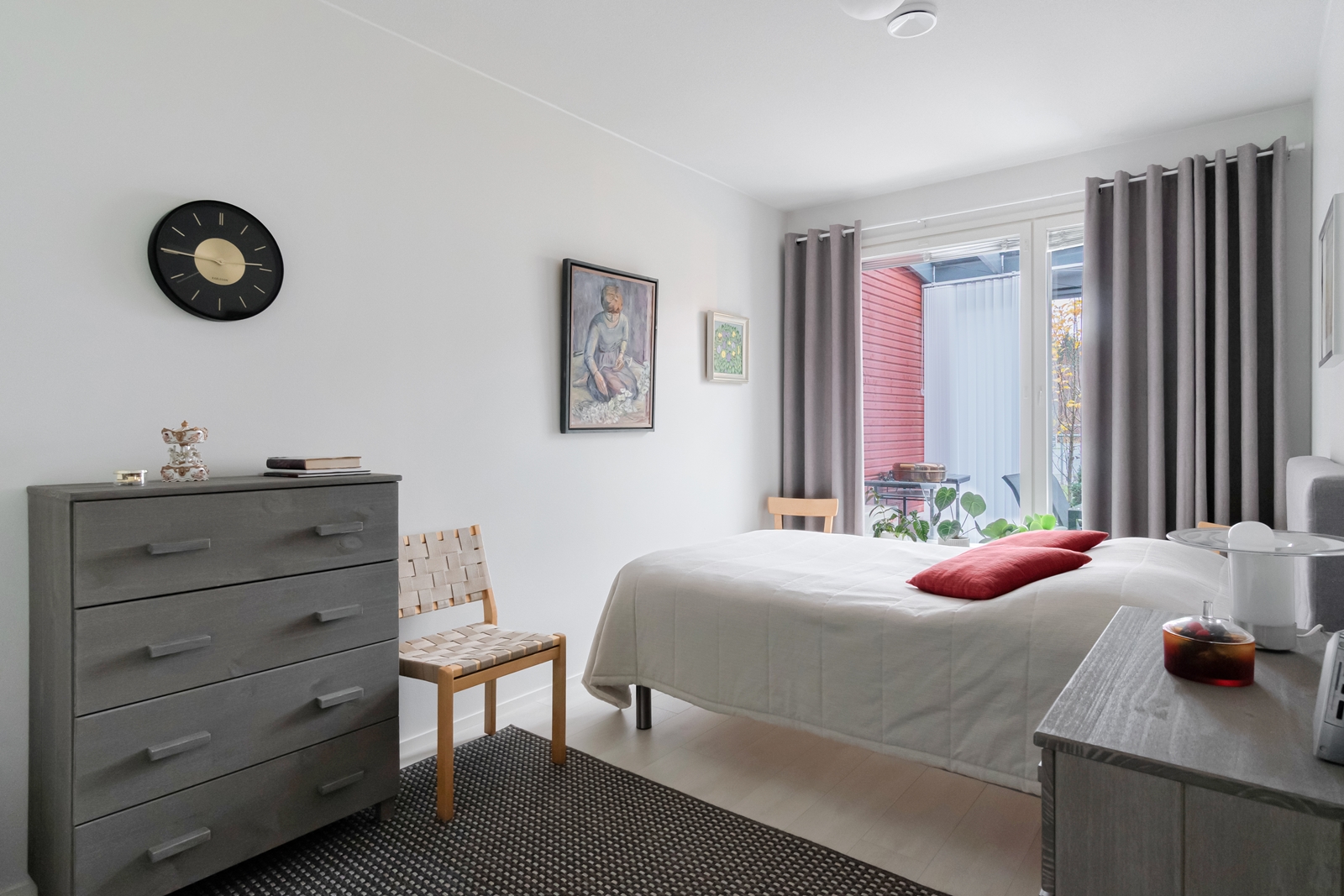 | Makuuhuoneen kuvaus | Lukumäärä: 2, seinät (maali), lattiat (laminaatti), Mh:n kaapistot muutettu huoneen levyiseksi liukuovin varustettuna. Toisessa mh:ssa on tilava vaatehuone. |
