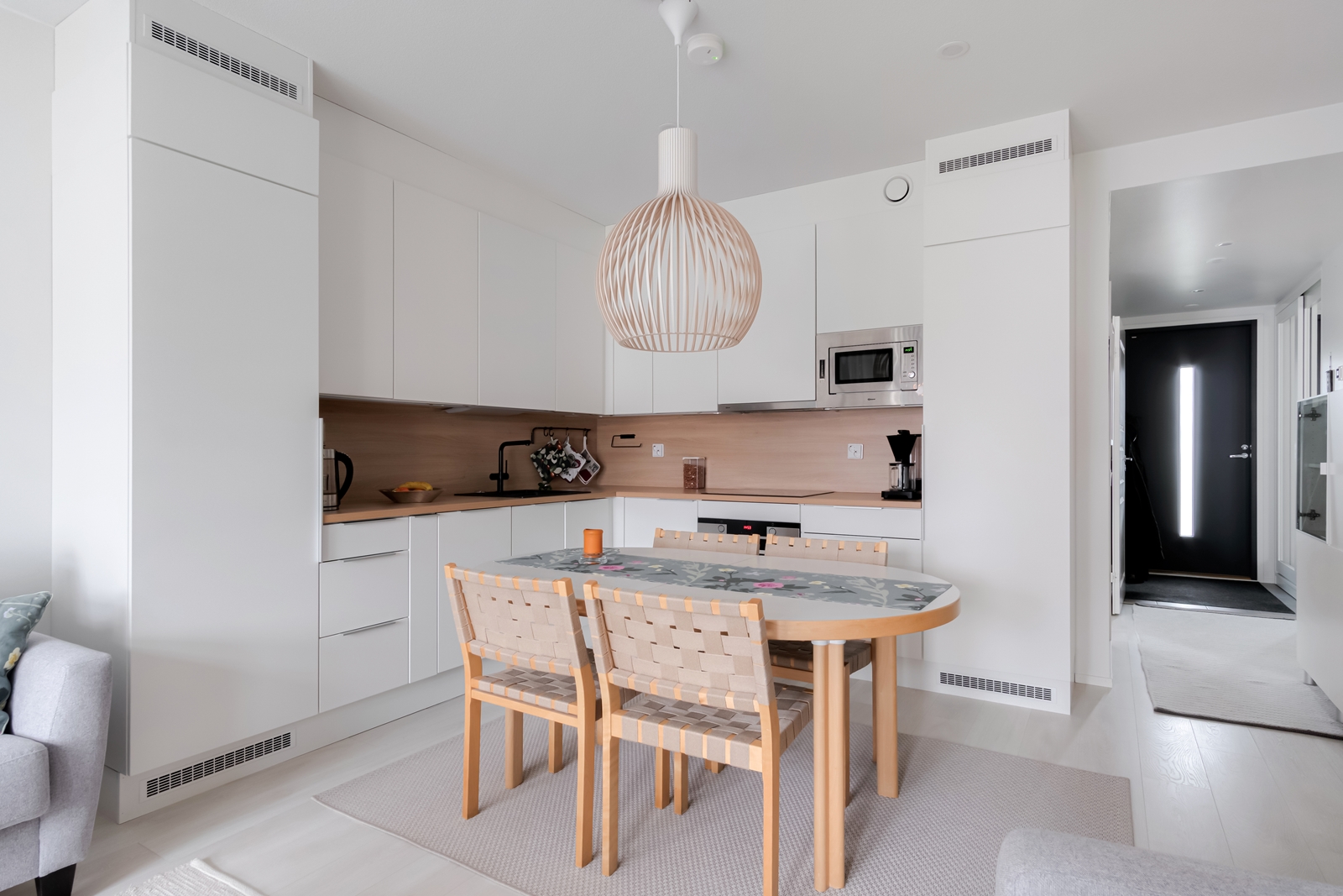 | Keittiön kuvaus | Liesi (Induktioliesi ja 60 cm.kalusteuuni), työtasot (laminaatti), seinät (maali), lattiat (laminaatti), jää-viileäkaappi (integroitu), erillinen pakastin (integroitu), mikroaaltouuni (integroitu) ja astianpesukone (integroitu) |