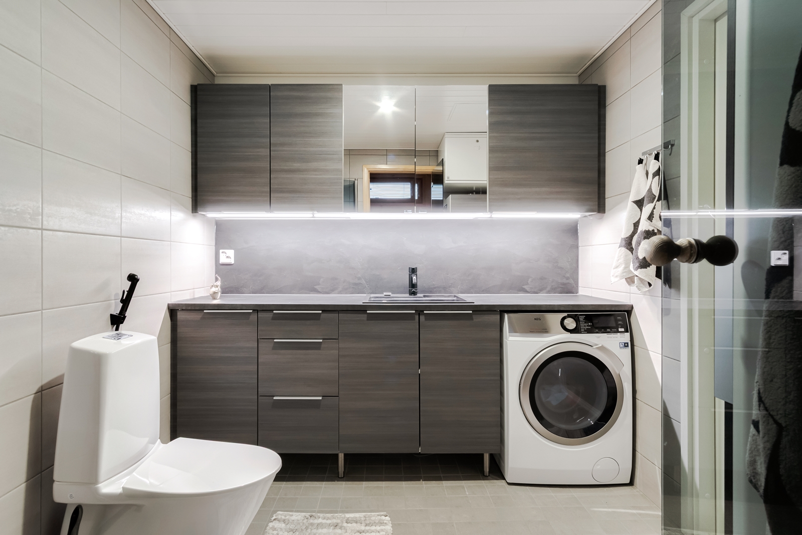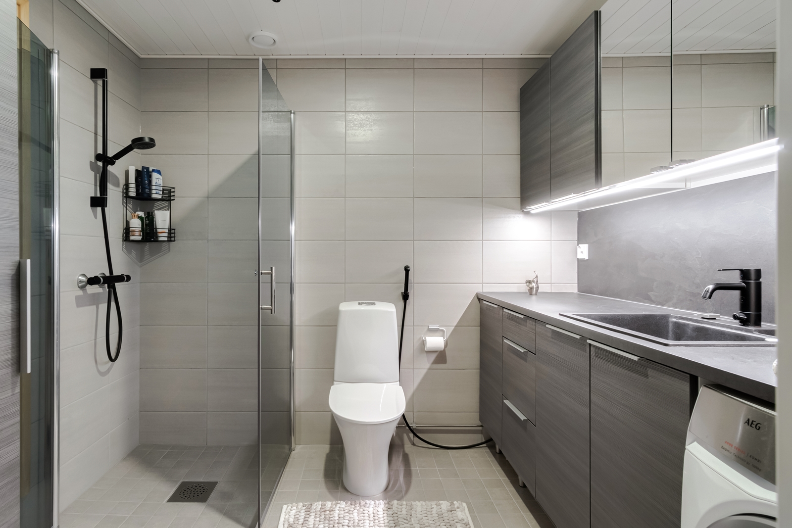 | Kylpyhuoneen kuvaus | WC-istuin, suihku, pesukoneliitäntä, lattialämmitys, peilikaappi, bidee-suihku ja suihkuovet 2 kpl., seinät (kaakeli), lattiat (laatta) |