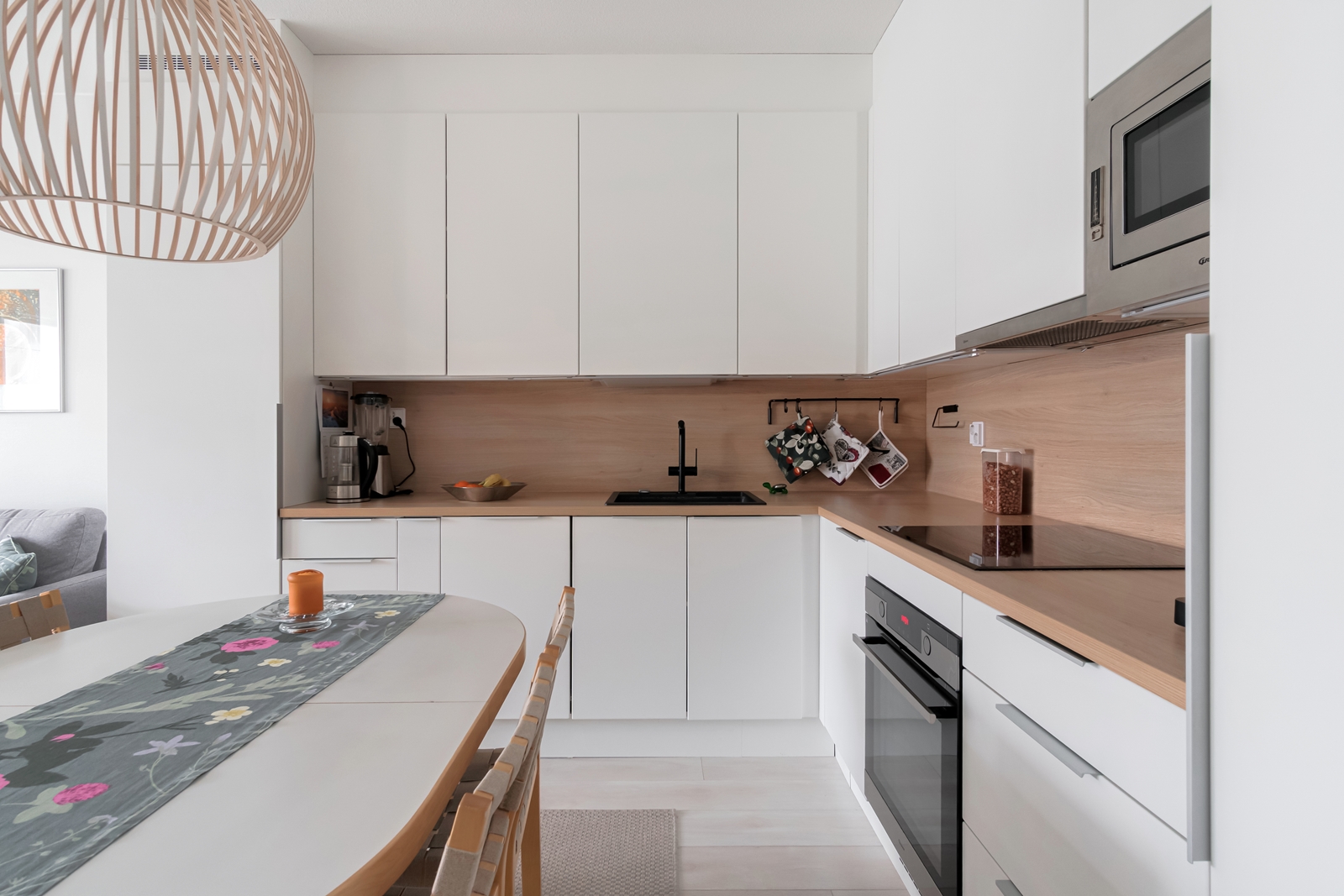 Avarassa olohuoneessa ja keittiössä on laminaattilattiat ja maalatut seinät, ja keittiö on varustettu integroiduilla kodinkoneilla, kuten korkea jääviileäkaappi ja korkea pakastin sekä astianpesukone. Kylpyhuoneessa on lattialämmitys ja kaikki tarvittavat mukavuudet. Oma sauna ikkunalla tarjoaa rentouttavia hetkiä.