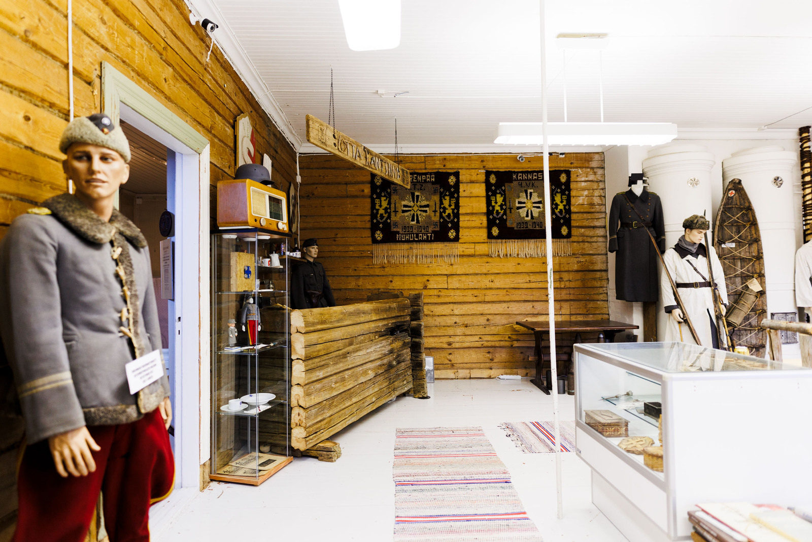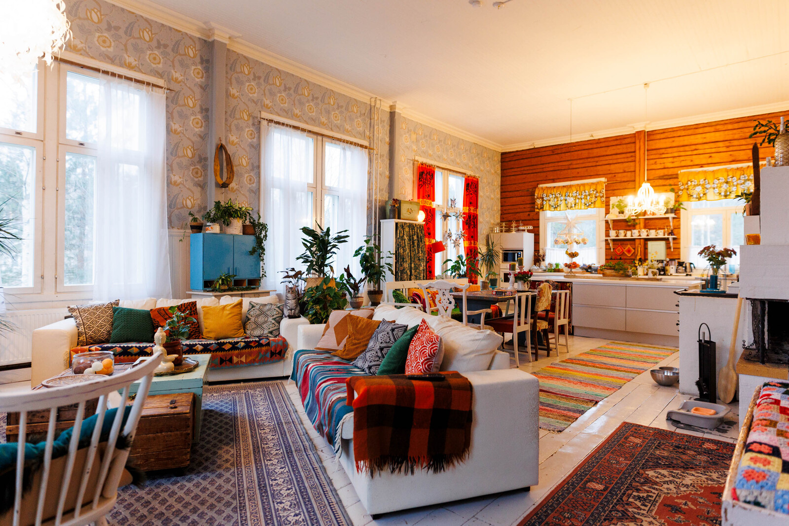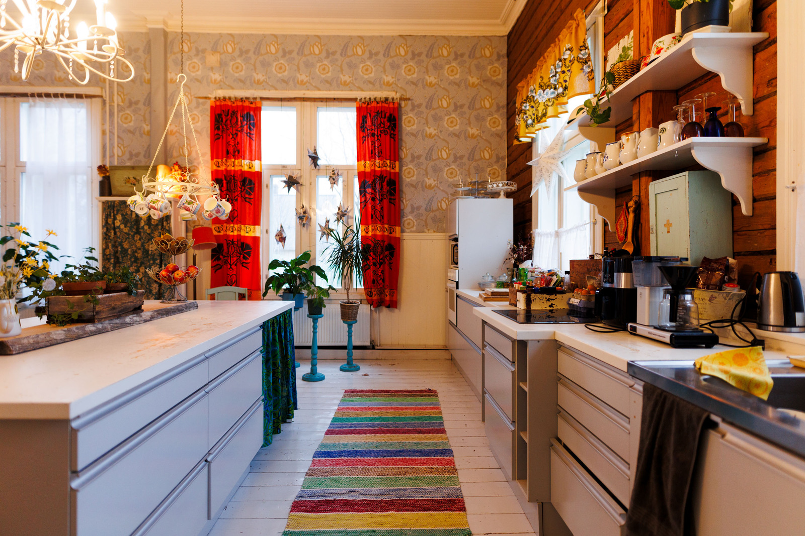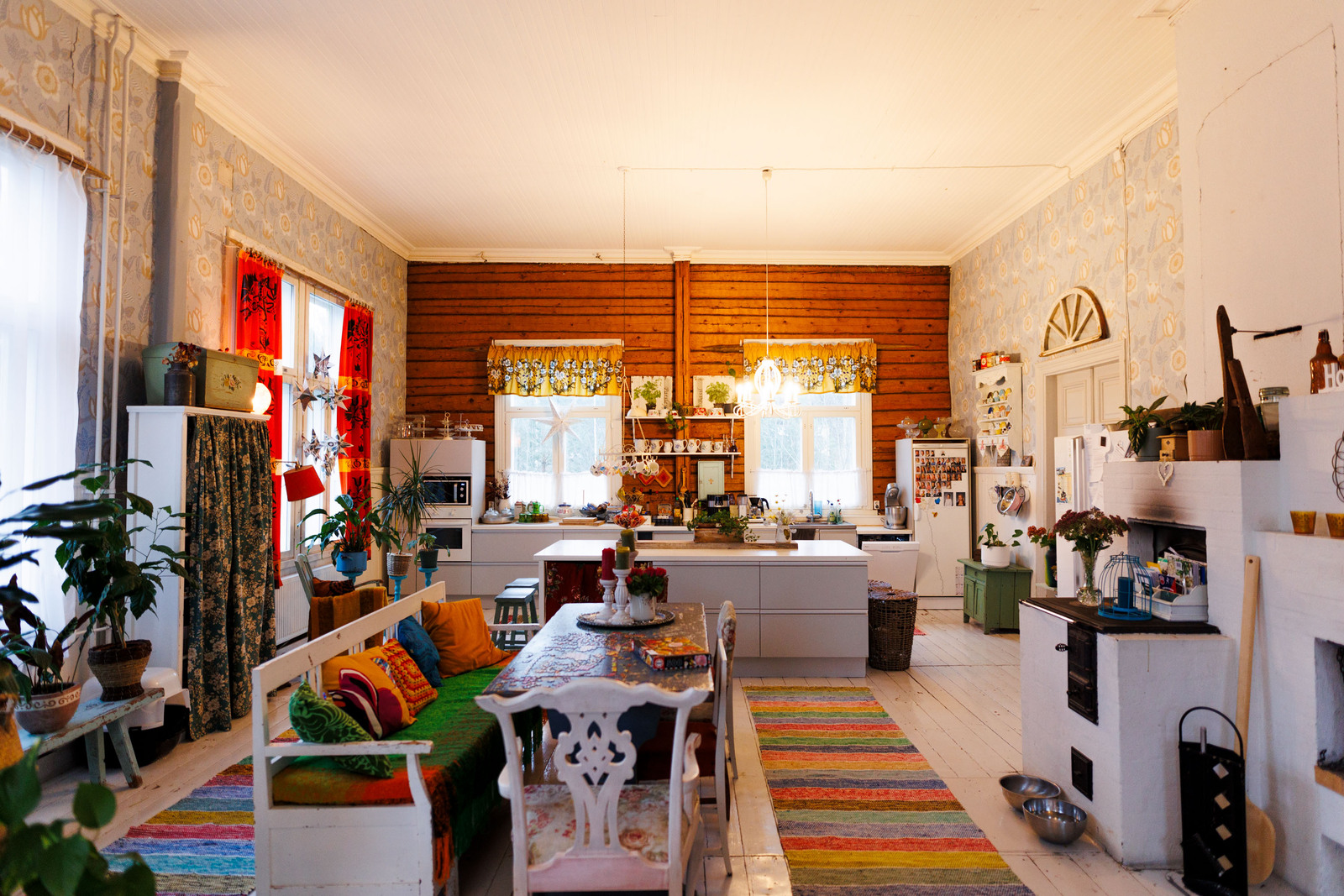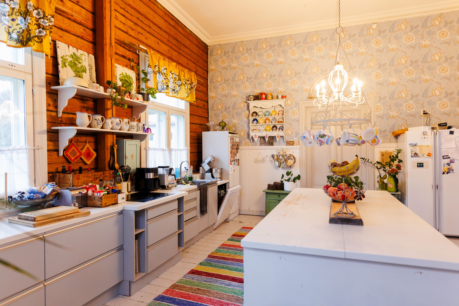 Liesi (Keraaminen liesi ja puuliesi), seinät (puu), lattiat (lauta), liesi, keittiösaareke, astianpesukone, jääkaappi ja pakastekaappi, kiinteät valaisimet, Keitiössä hirsiseinä / pinkopahvi |