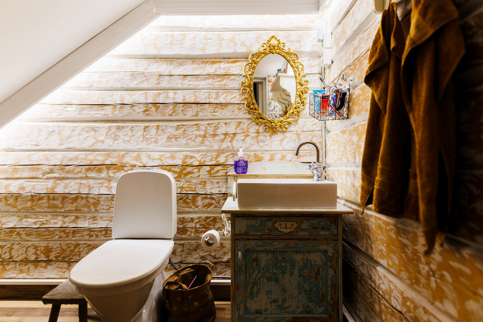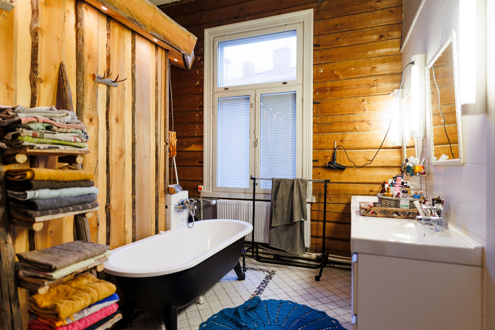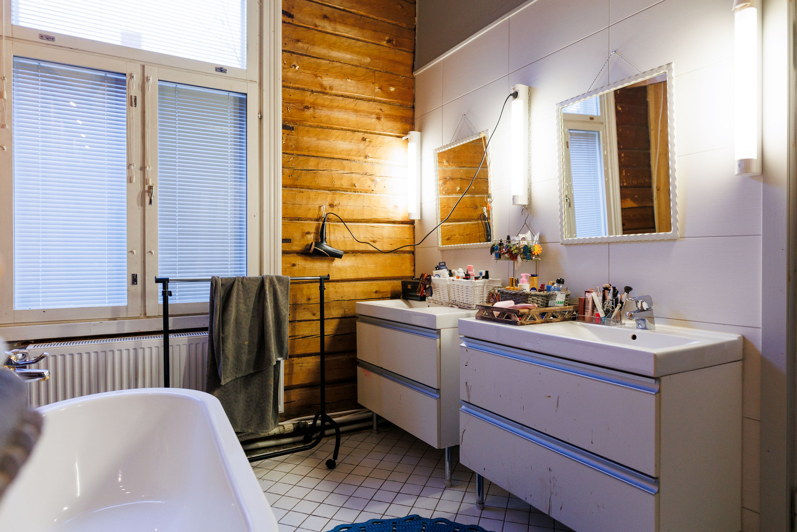 Peili, kylpyamme, suihkukaappi, lattialämmitys, suihku ja kiinteät valaisimet, seinät (puu ja kaakeli), lattiat (laatta), kph osa hirsiseinä |