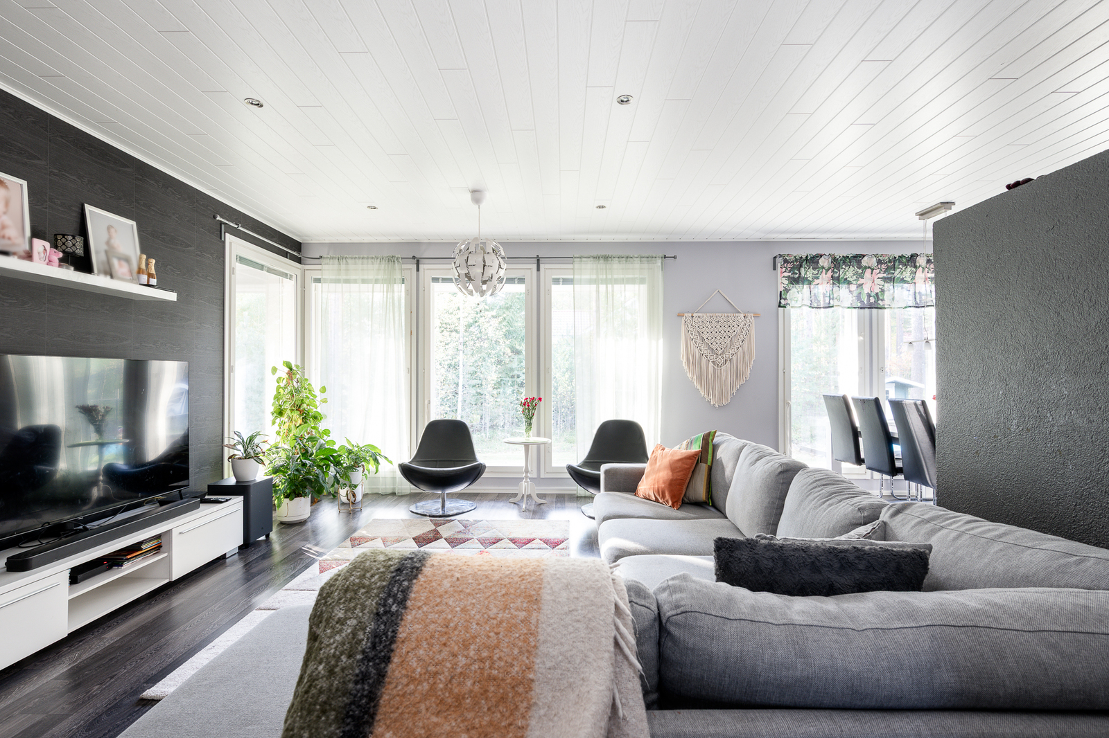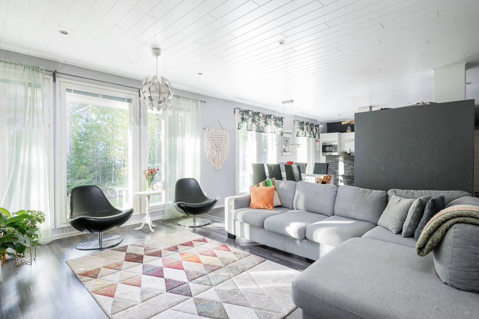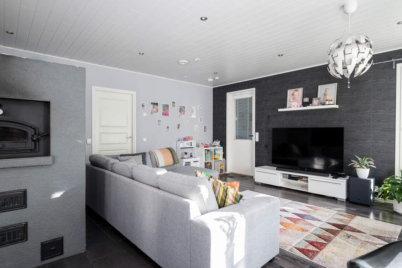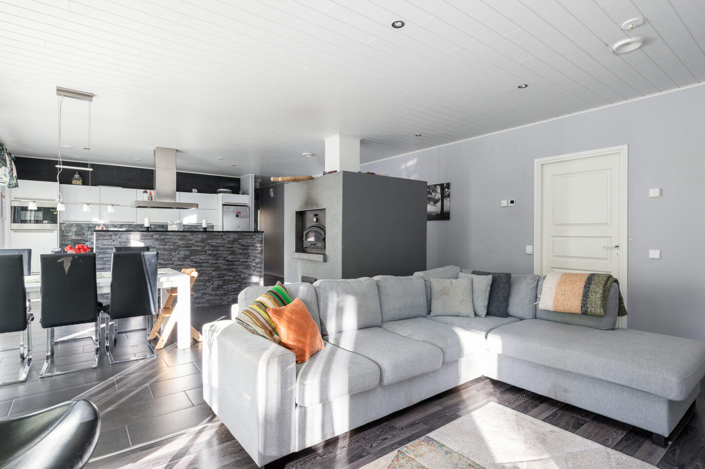 Tämä koti yhdistää käytännöllisyyden ja kodikkuuden, tarjoten kolme makuuhuonetta, avaran ja valoisaan olohuone- sekä keittiötilan, jossa on leivinuuni ja kivitasot.