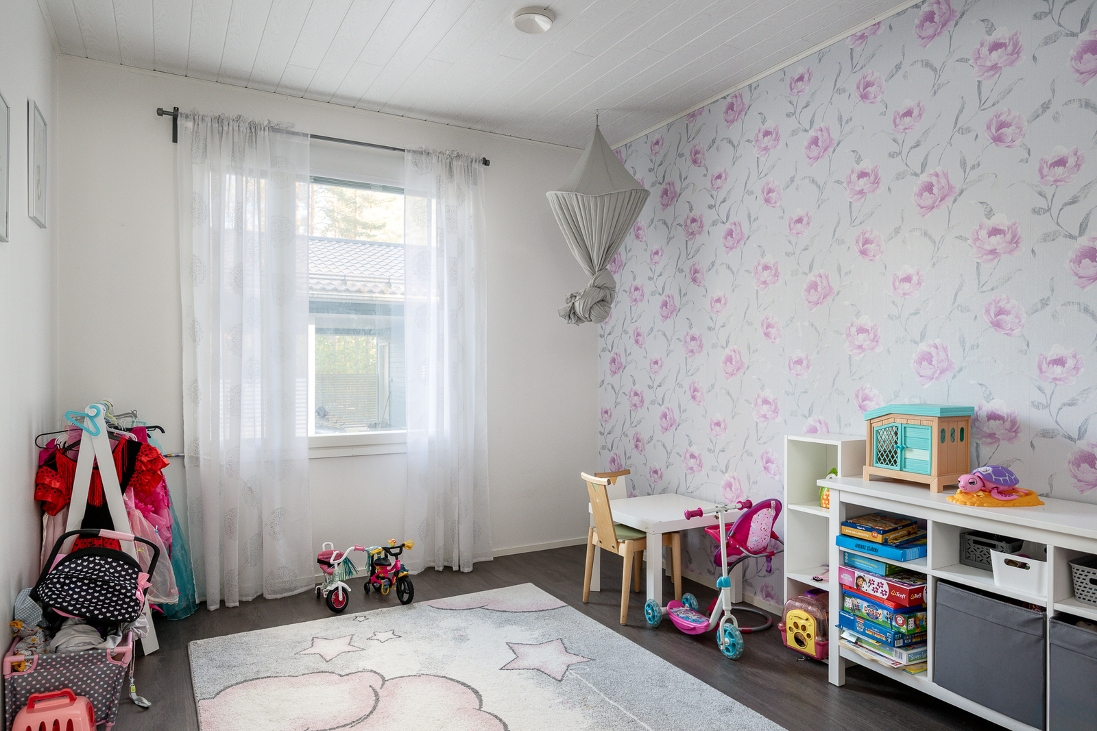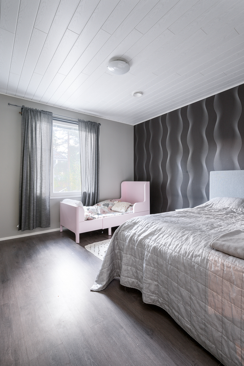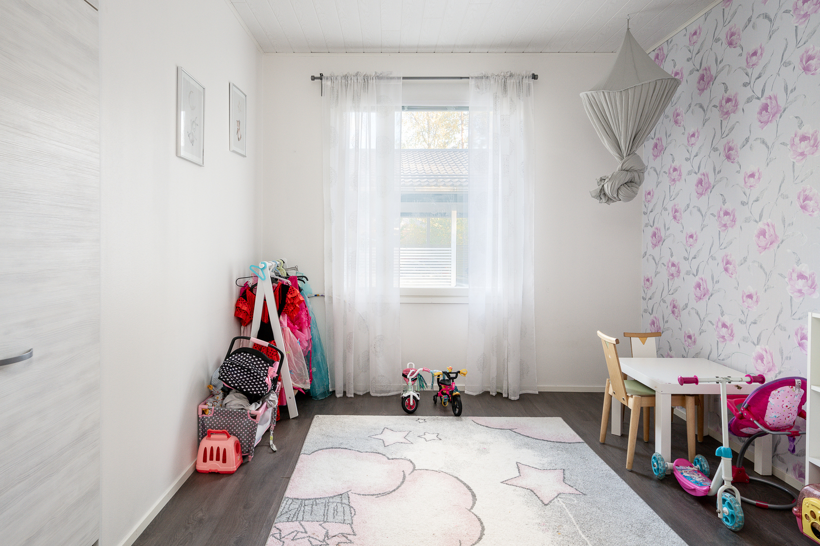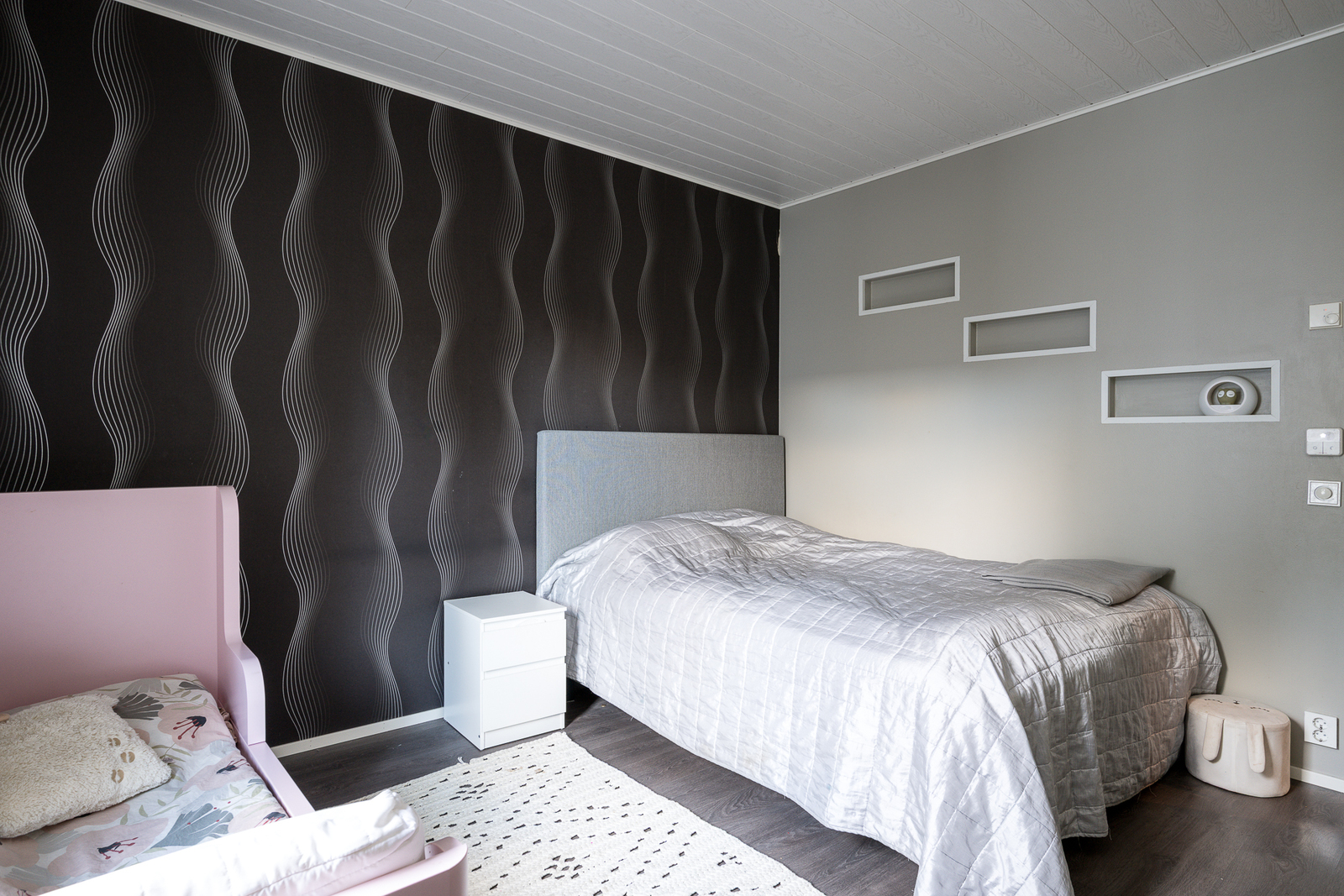 | Makuuhuoneen kuvaus | Lukumäärä: 3, seinät (tapetti ja maali), lattiat (laminaatti) |