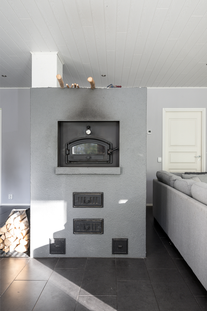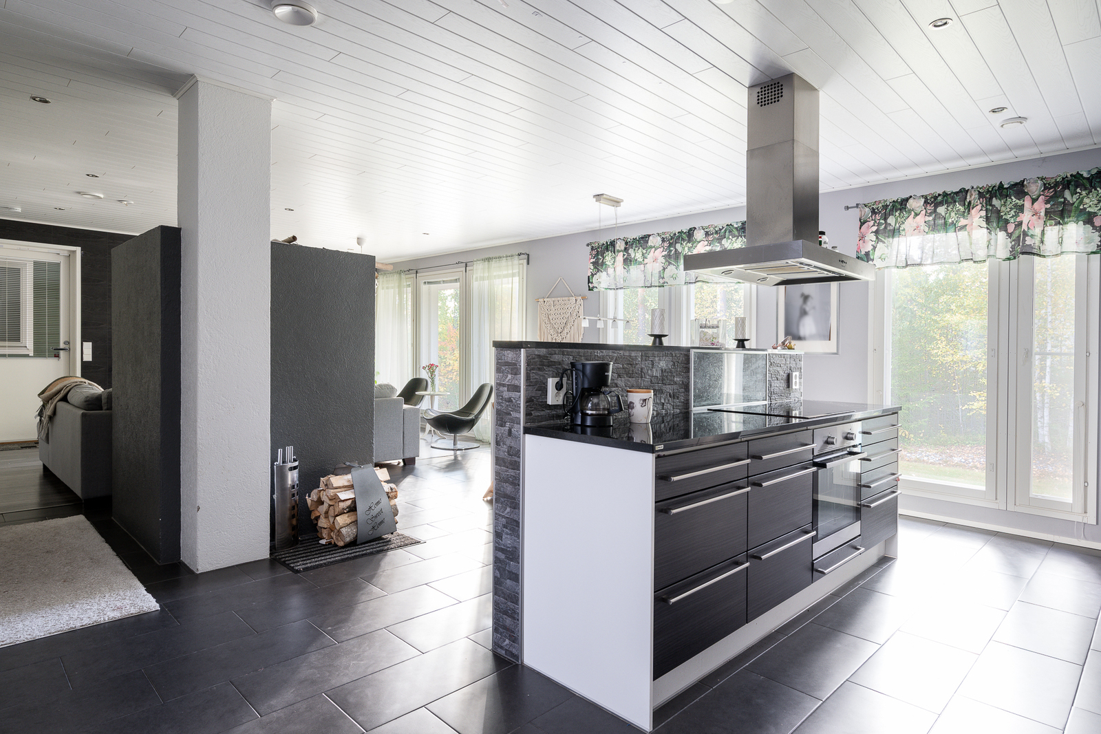 Avara, yhtenäinen olohuone- ja keittiötila, jossa leivinuuni ja runsaasti laskutilaa kivitasoineen