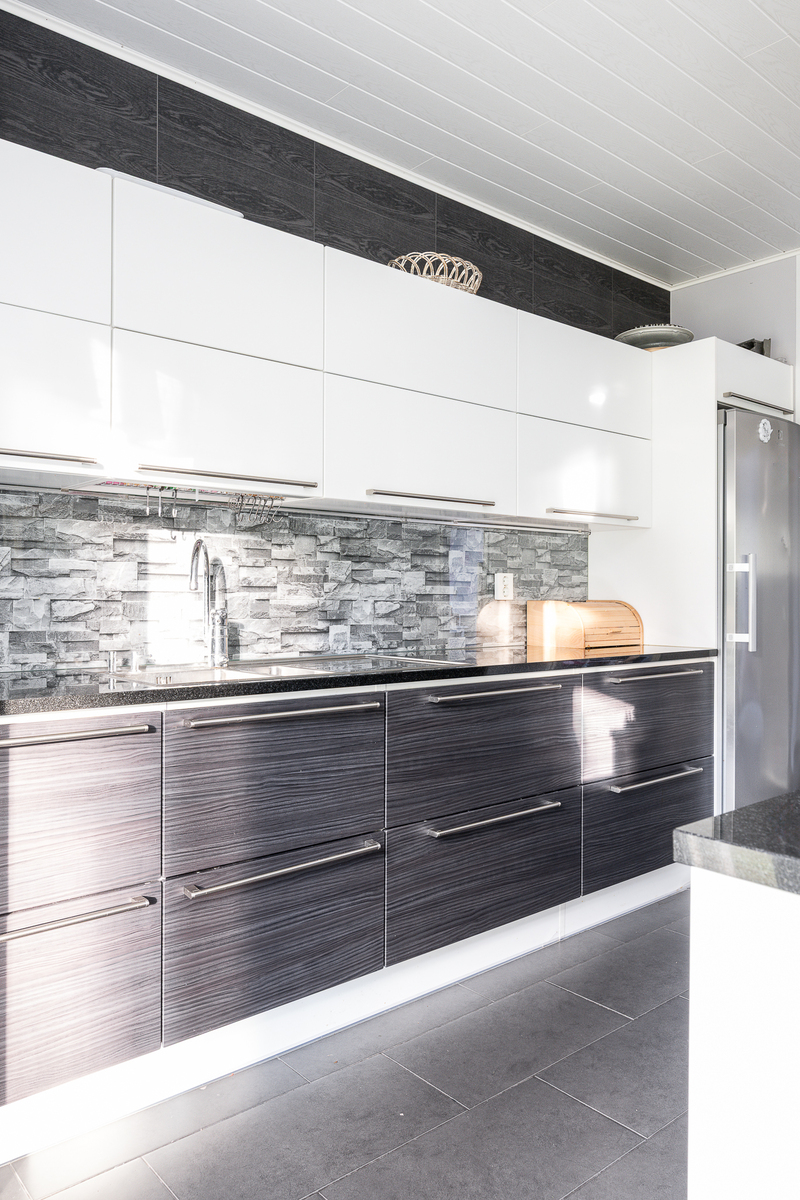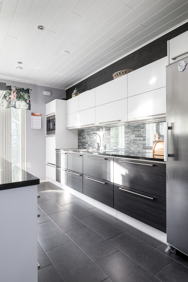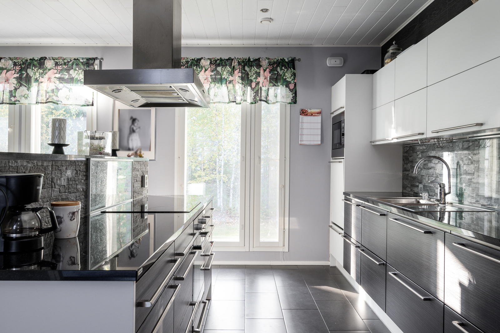 | Keittiön kuvaus | Liesi (integroitu, leivinuuni), työtasot (kivi), seinät (maali), lattiat (laatta), mikroaaltouuni, uuni, erillinen pakastin, astianpesukone, jääkaappi ja liesituuletin / hormi, kiinteät valaisimet |