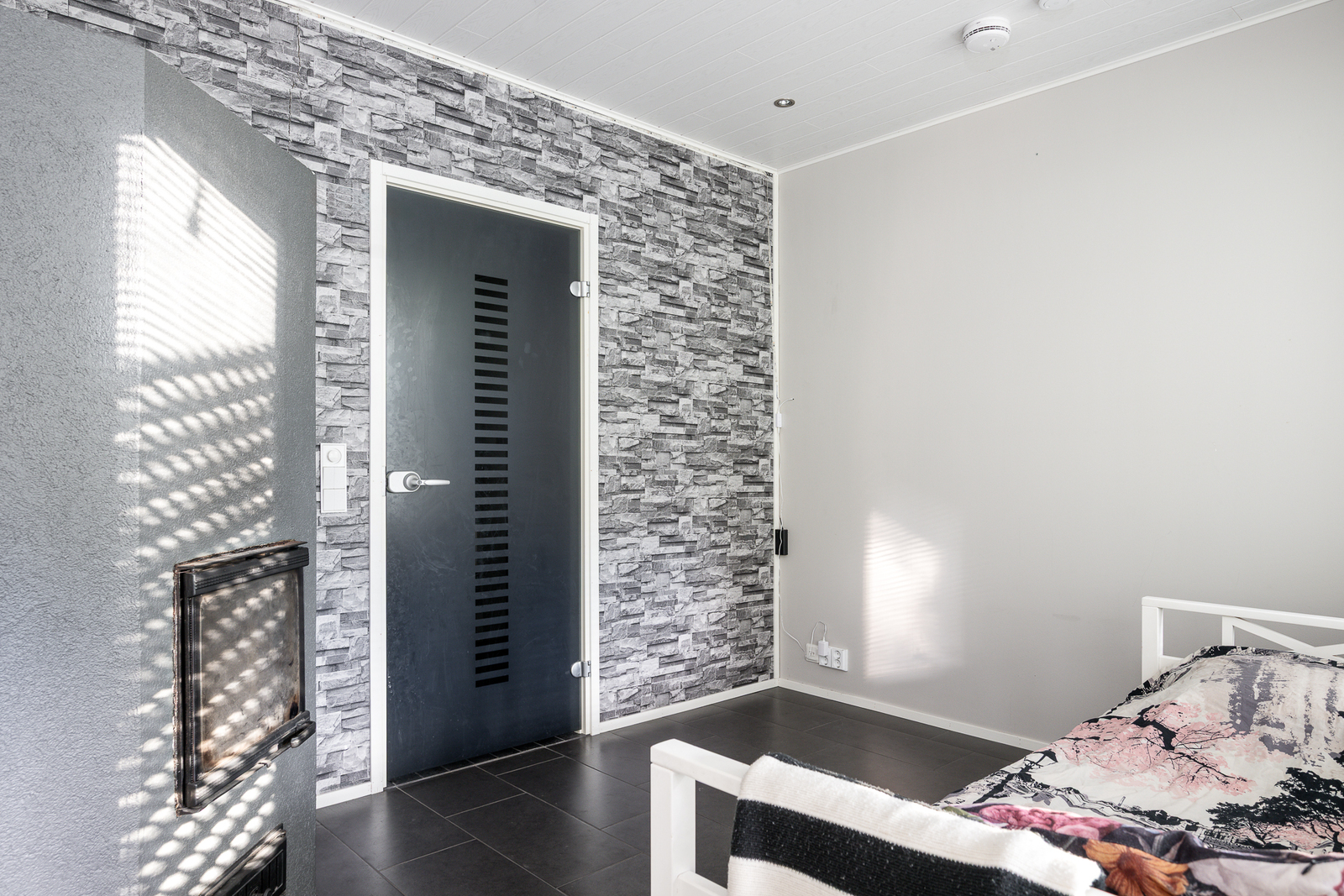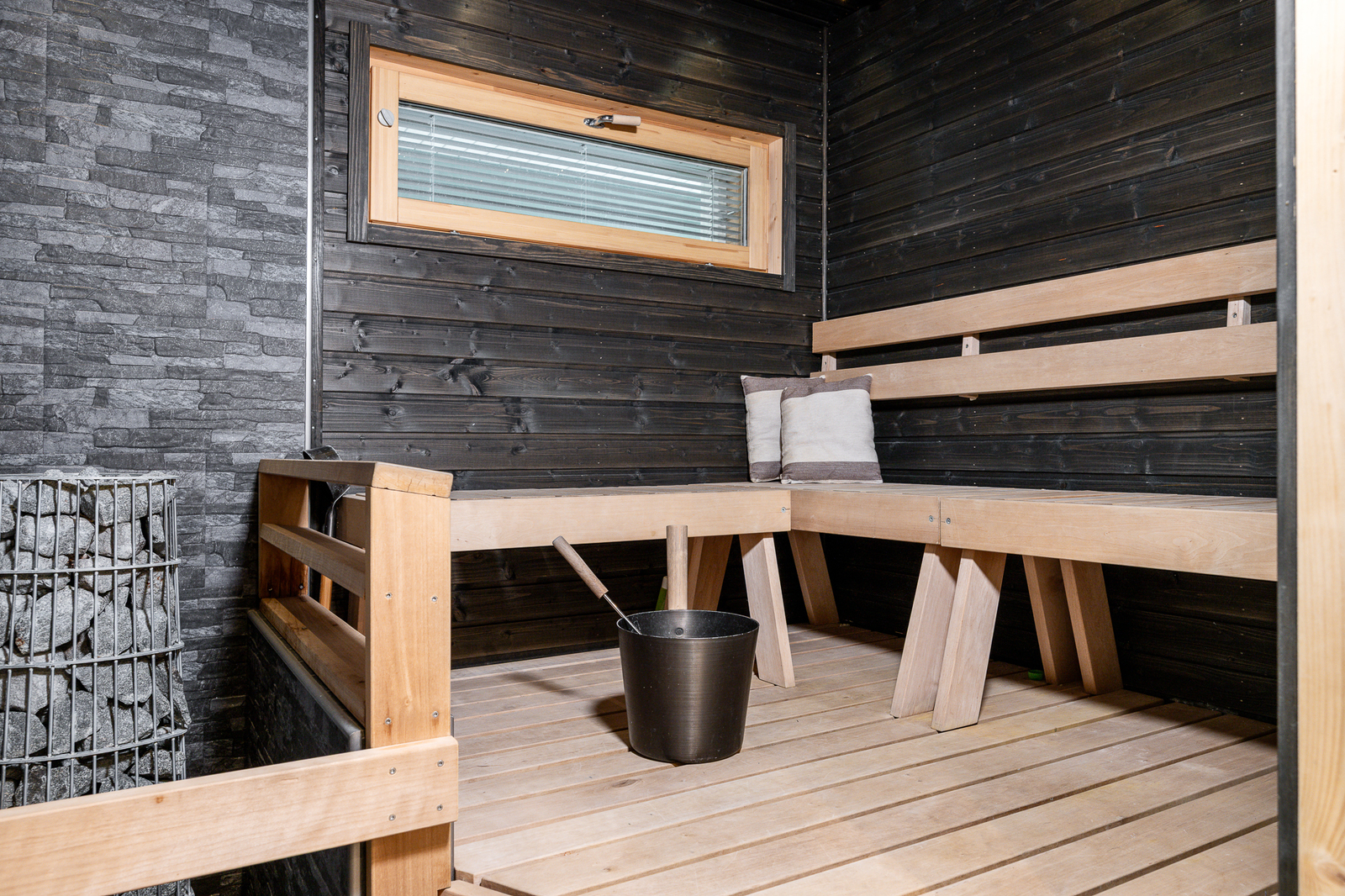 | Saunan kuvaus | Seinät (puu), lattiat (laatta), Sähkökiuas |