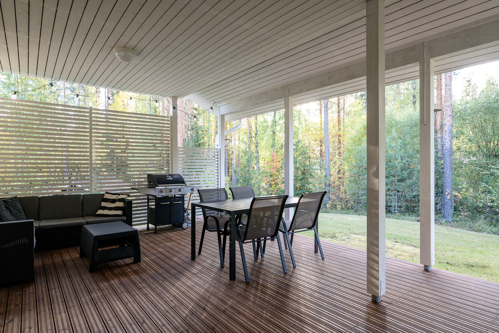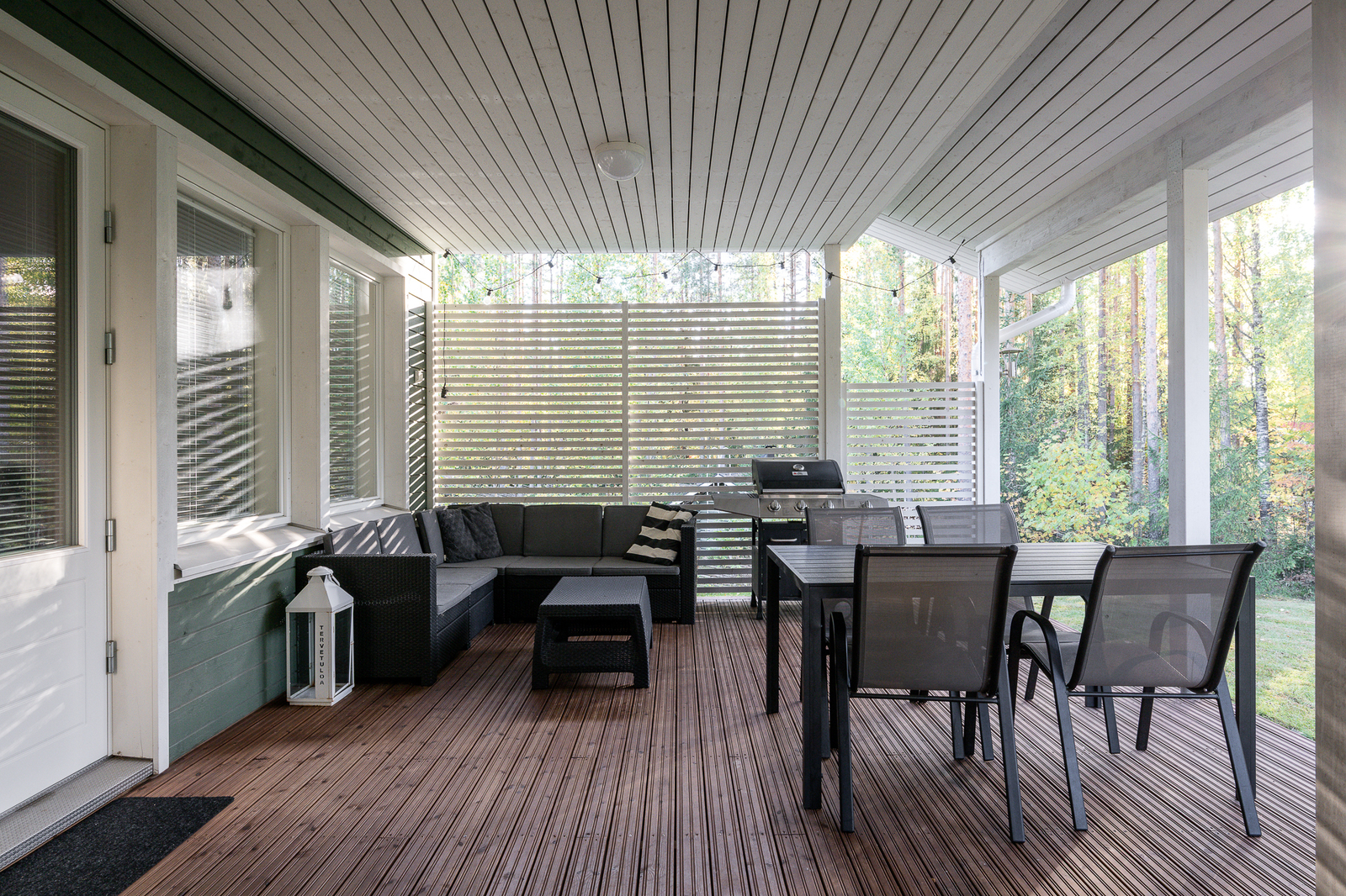 Katettu sekä tilava terassi, joka yhdistää talon ja saunatuvan