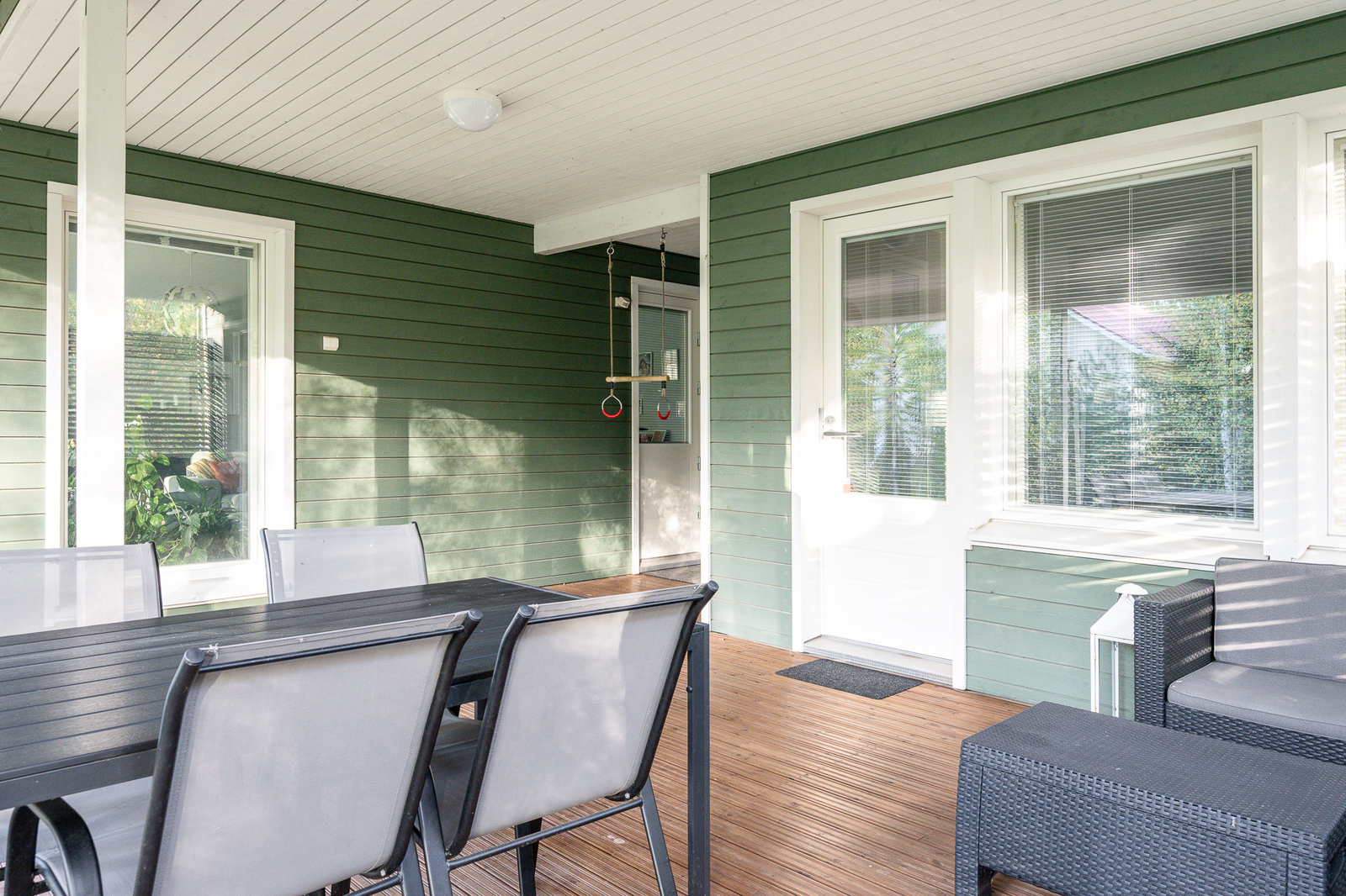 Talo hurmaa erityisesti omalla erillisellä saunalla ja saunatuvalla takkoineen. Katettu, tilava terassi liittää talon ja saunatuvan saumattomasti yhteen, luoden erinomaiset puitteet ulkoilmaelämälle ja rentoutumiselle ja omalle rauhalle.