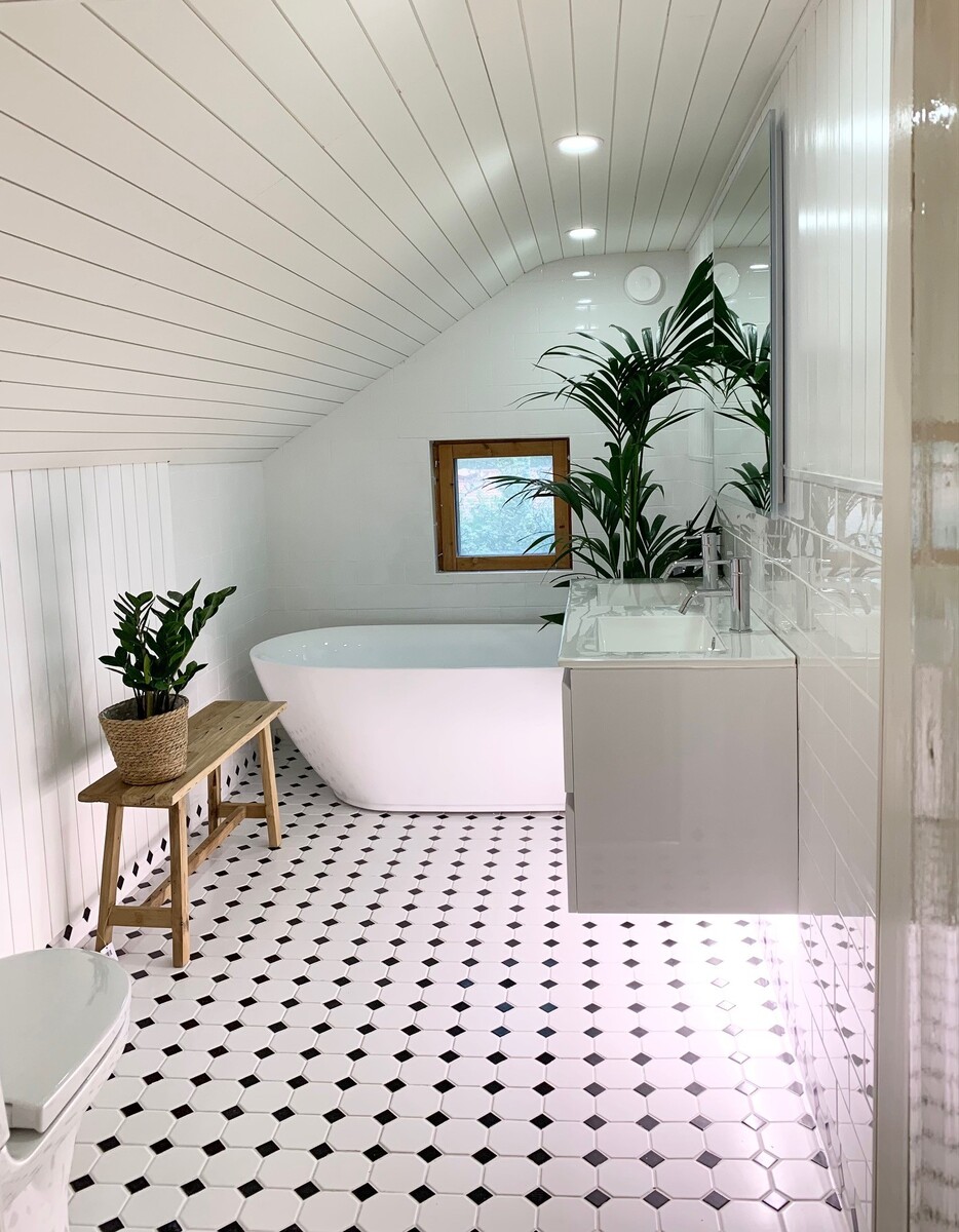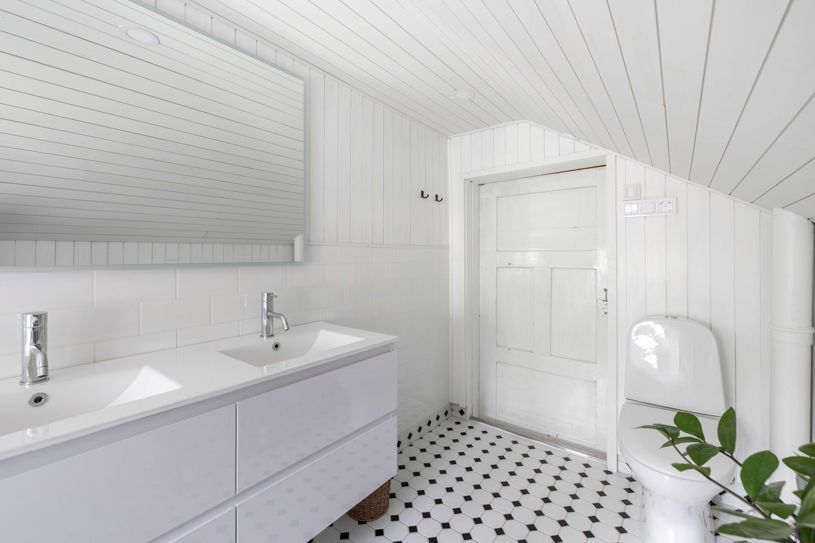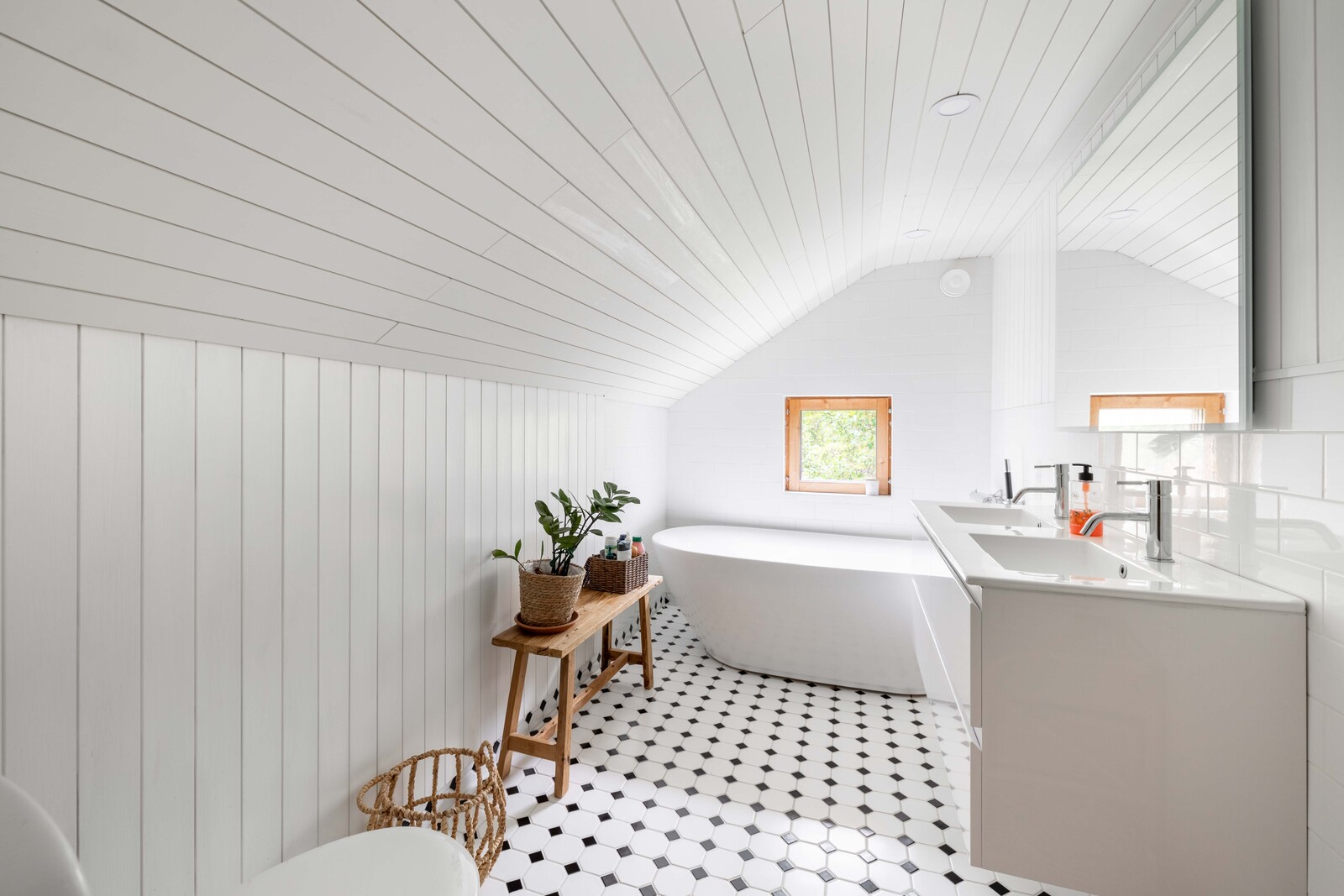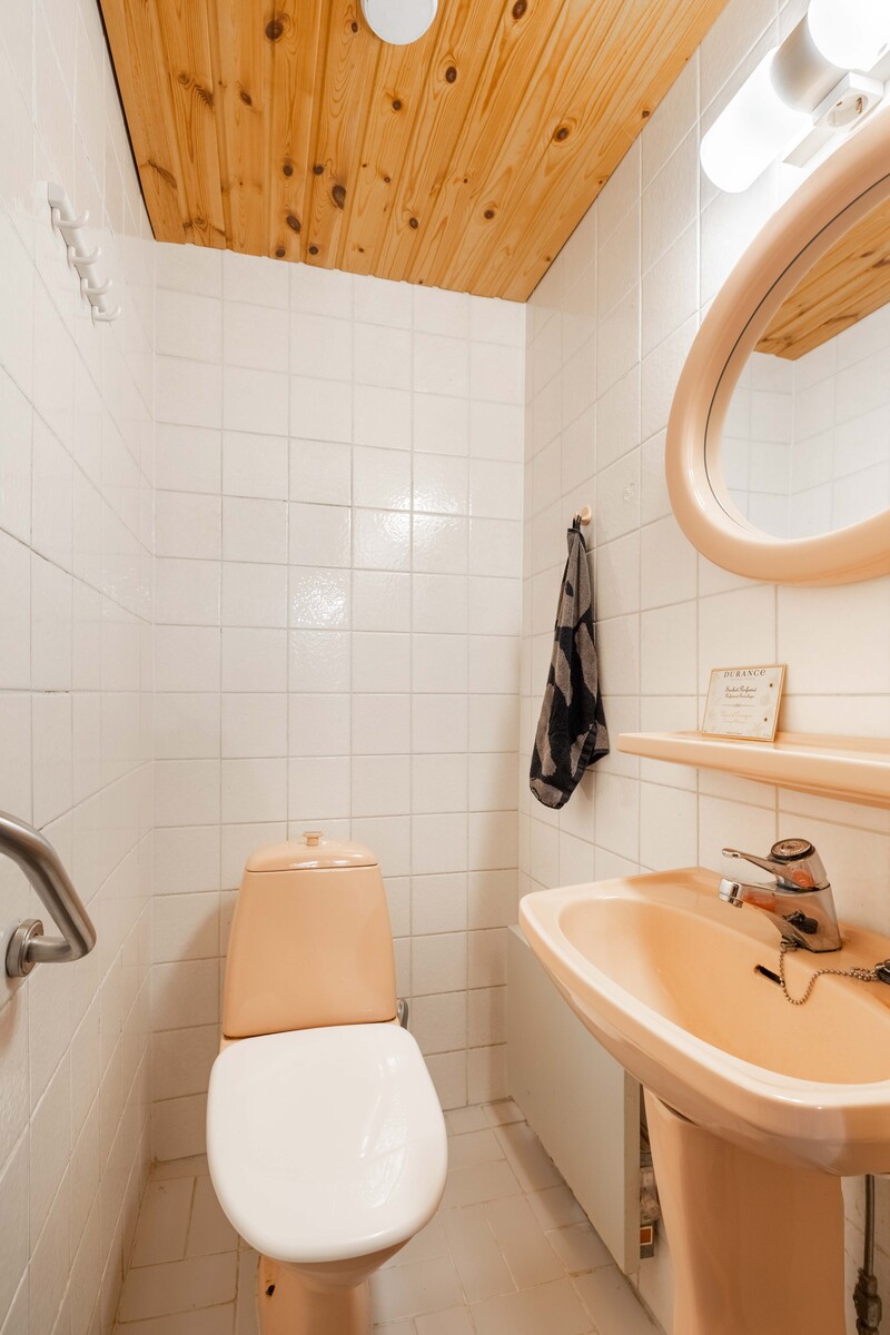Lattialämmitys, suihku, pesukoneliitäntä, peili, kylpyamme ja wc-istuin, seinät (kaakeli), lattiat (laatta) |
