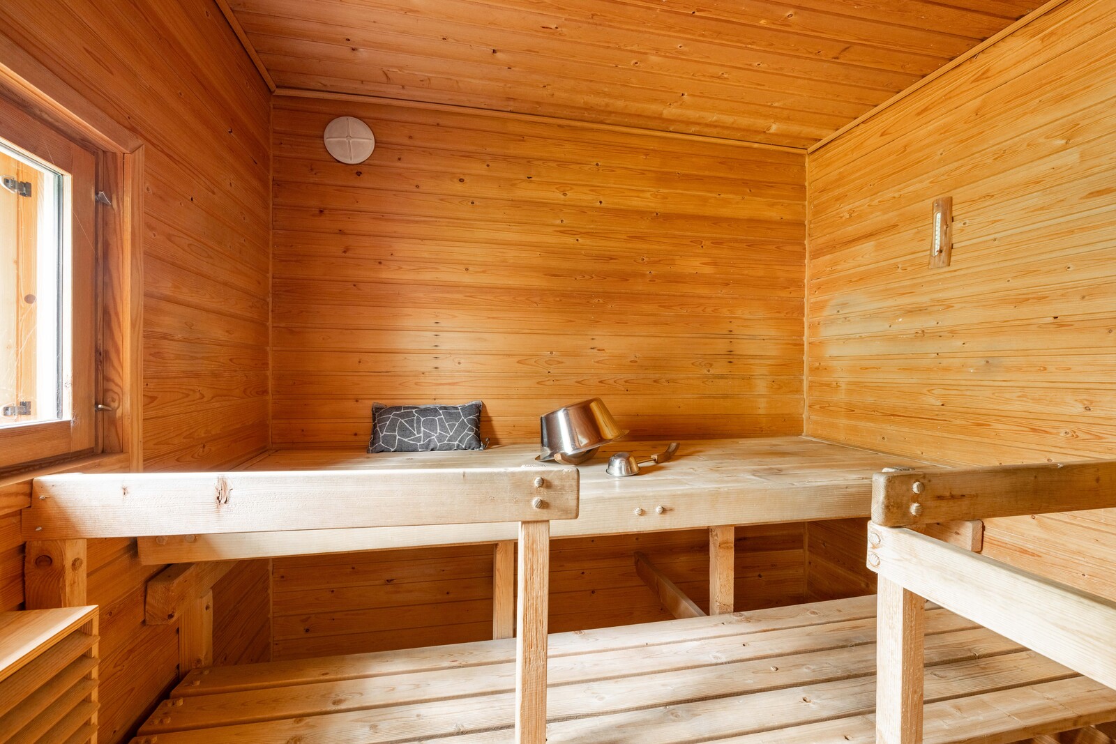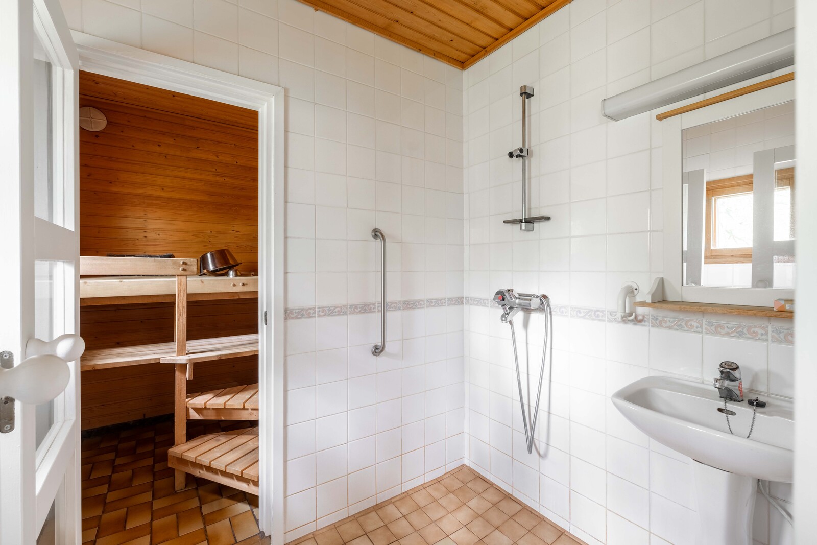 Lattiat (laatta), Sähkökiuas, Ikkunallinen sauna ja kylpyhuone. |