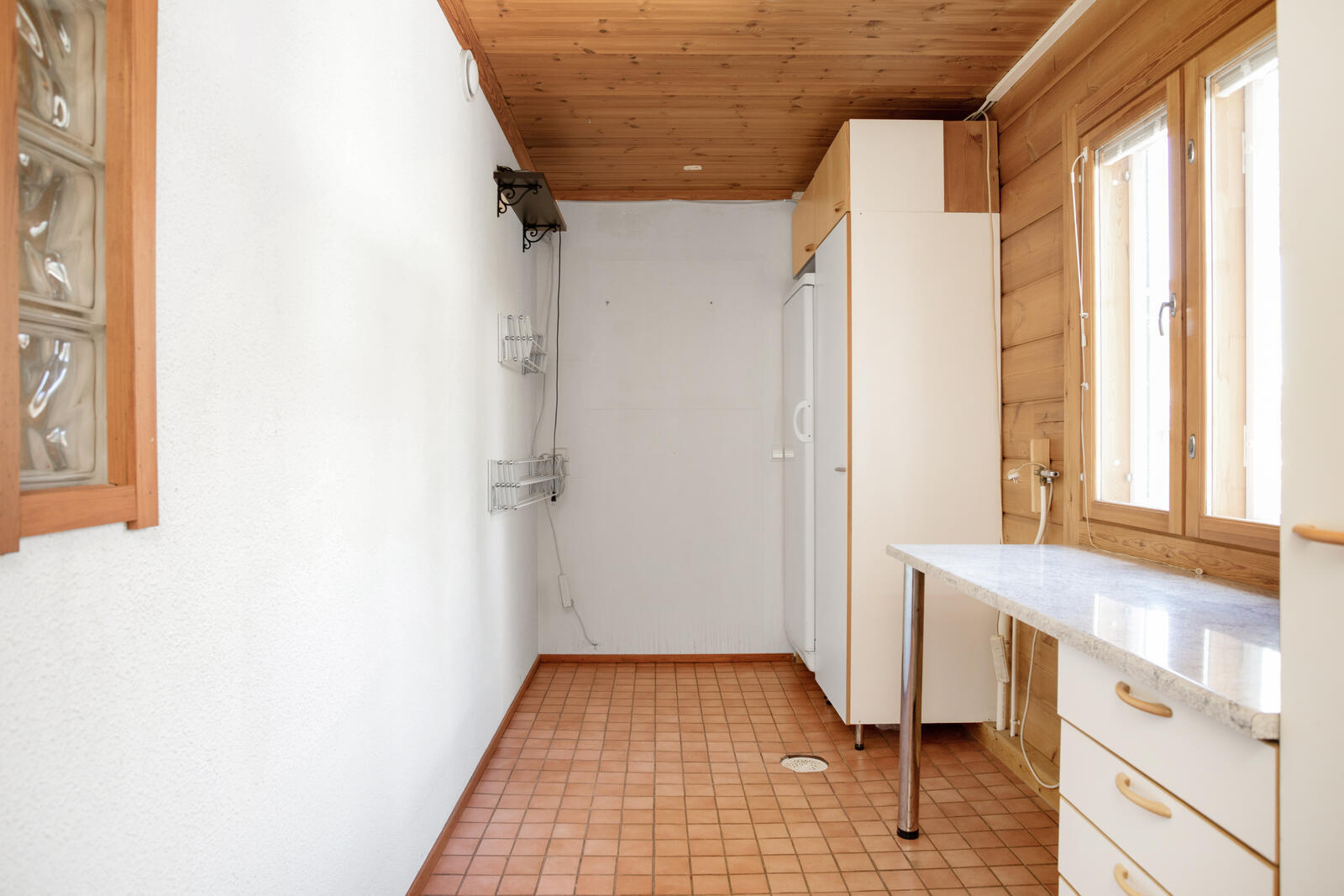Pesukoneliitäntä, lattiakaivo, pöytätaso, lattialämmitys ja pyykkikaapit, lattiat (laatta), seinät (kaakeli) |