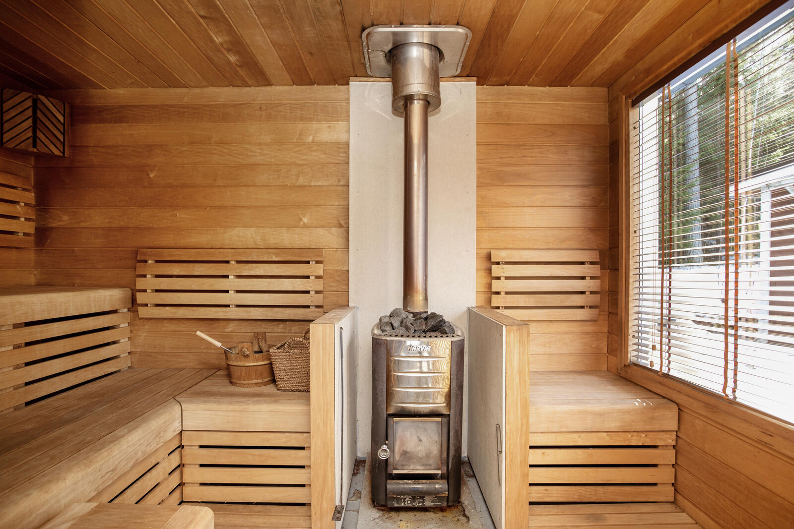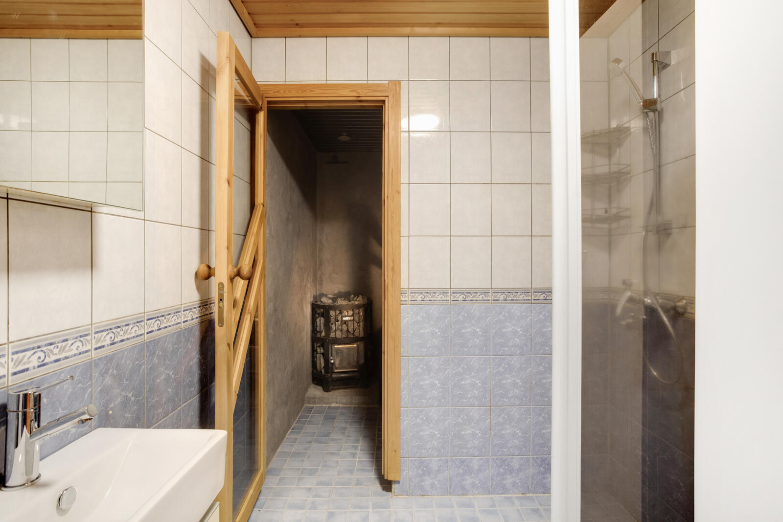 Seinät (puu), lattiat (laatta), Puukiuas, Talossa on sauna.