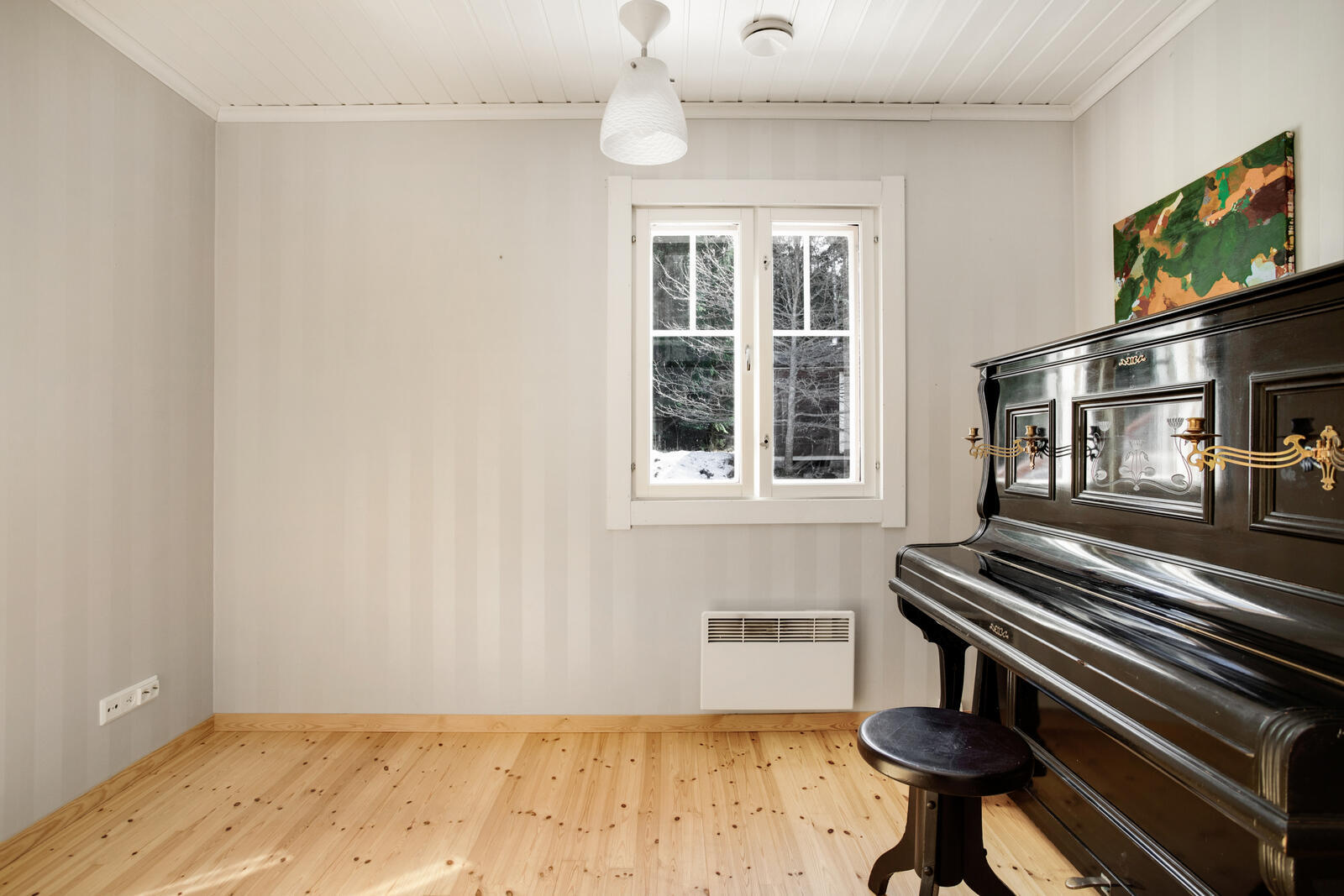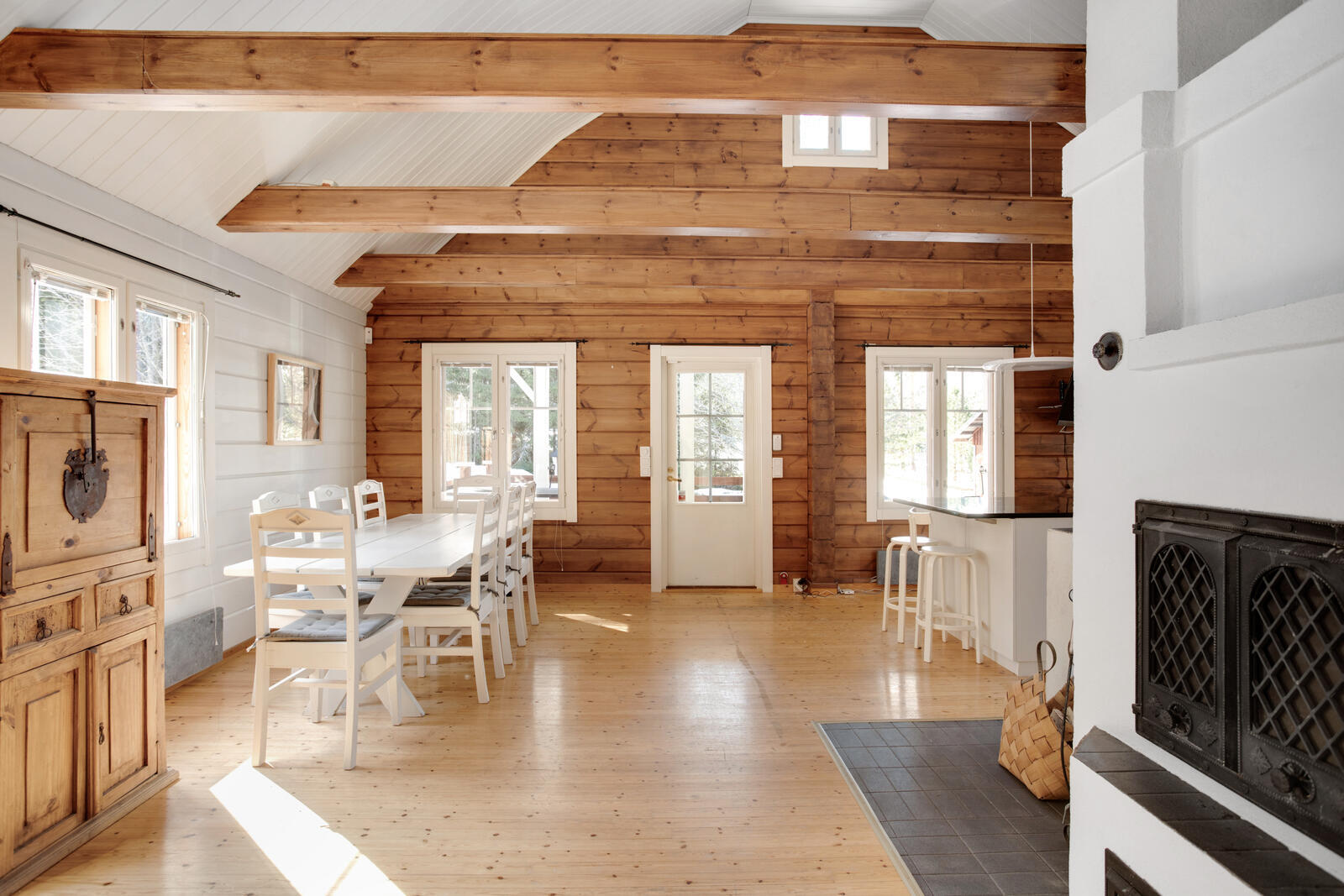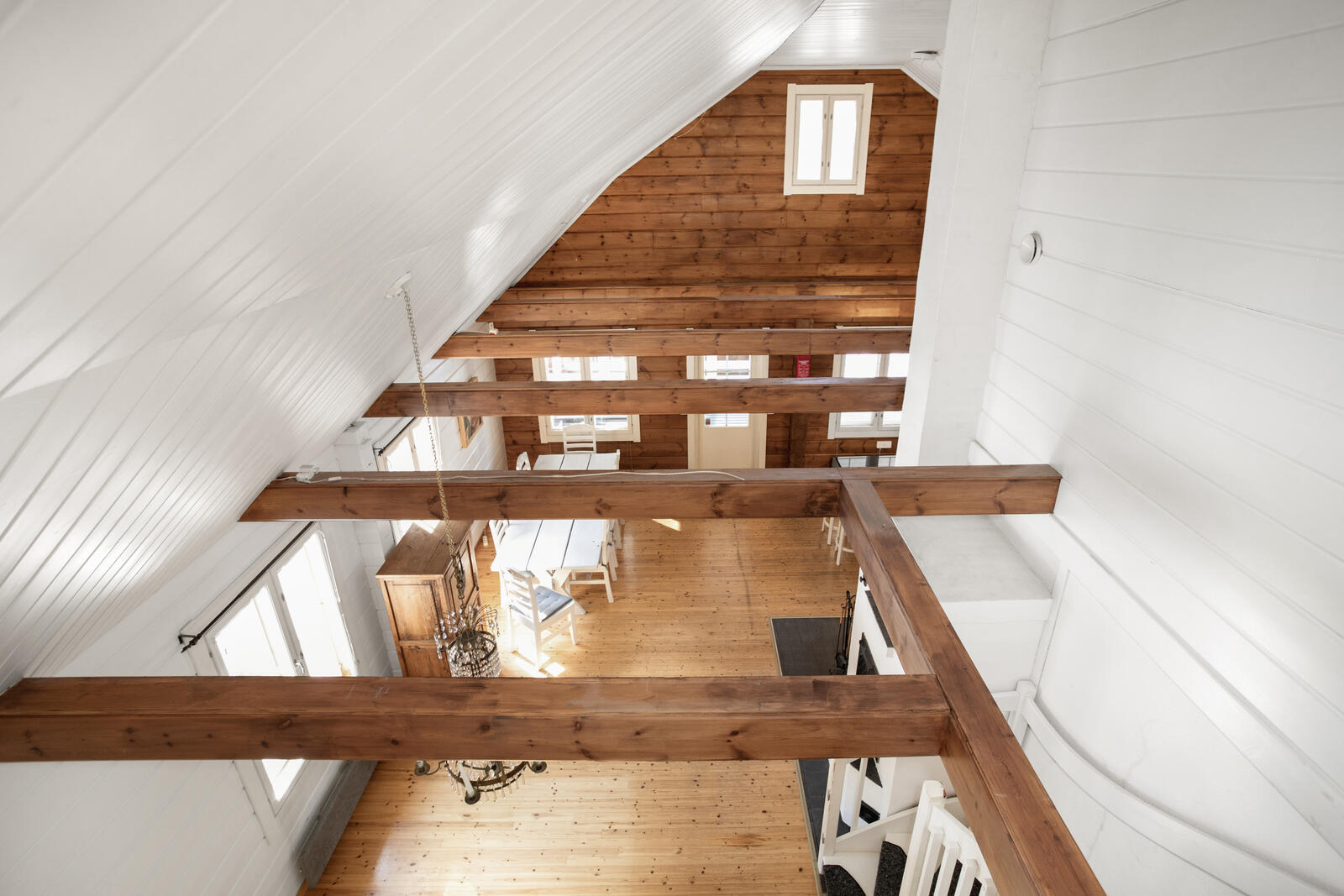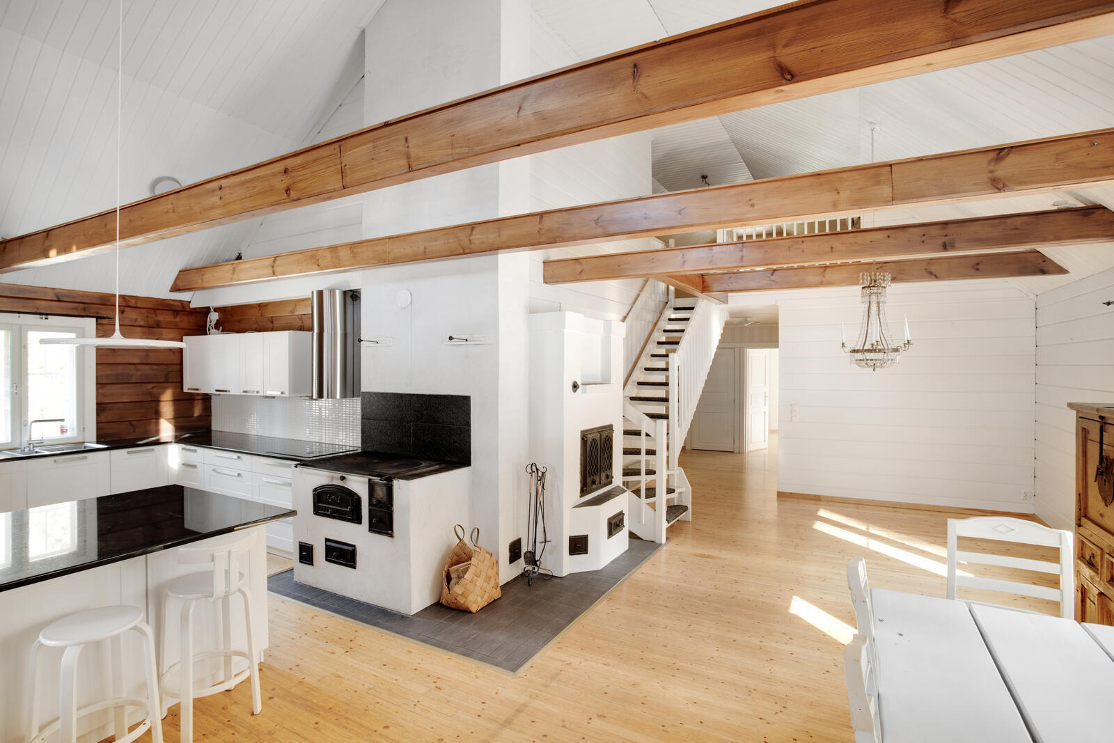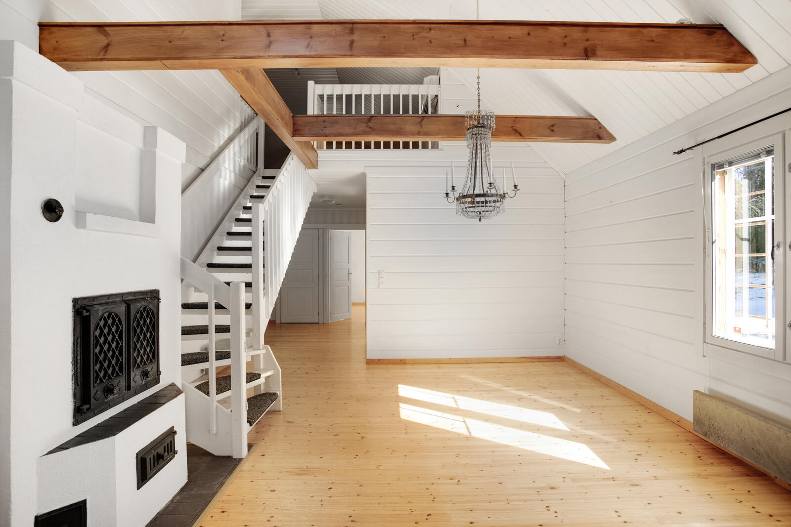 Talossa on useita makuuhuoneita sekä yläkerrassa iso aula. Olohuoneessa on kattokorkeus lähes 4 m.