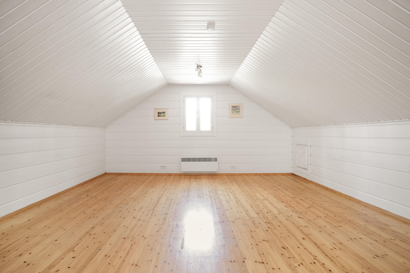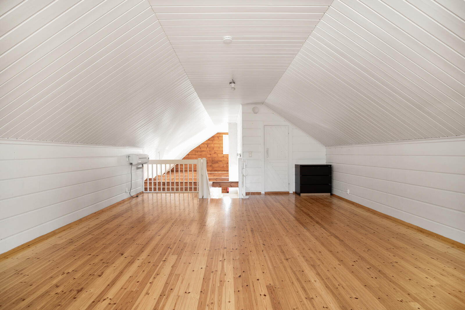Yläkerrassa on iso aulatila, joka soveltuu monenlaiseen oleskelu- ym.käyttöön. Lisäksi sivuvinttitilaa. |