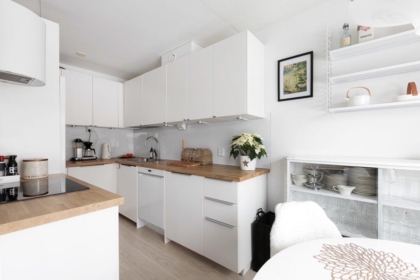 Kodinhoito: Apukeittiöstä on loihdittu erillinen, käytännöllinen kodinhoitotila, joka tekee pyykkihuollosta huomaamatonta ja helppoa.