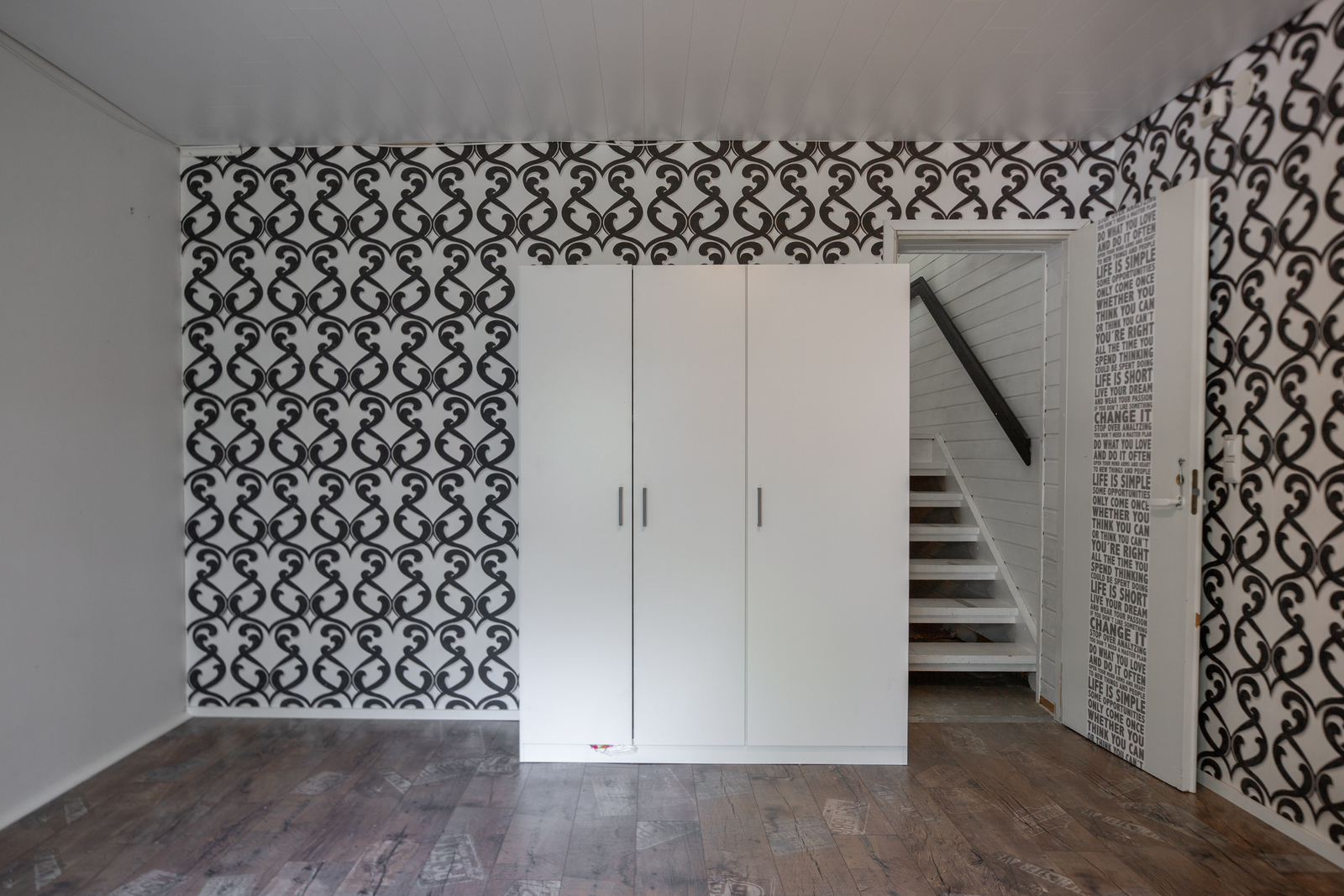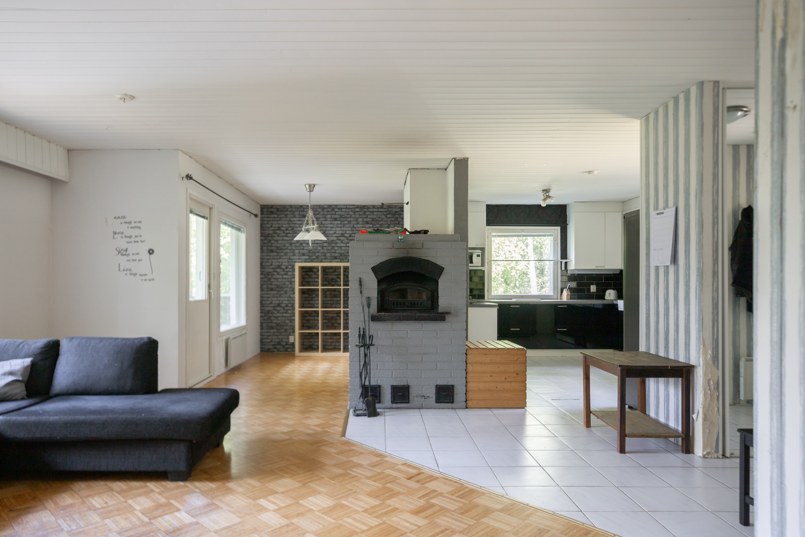 Alakerran huone laminaatti ja seinät tapetti, varastohuone lattia laatta seinät harkko, levy |