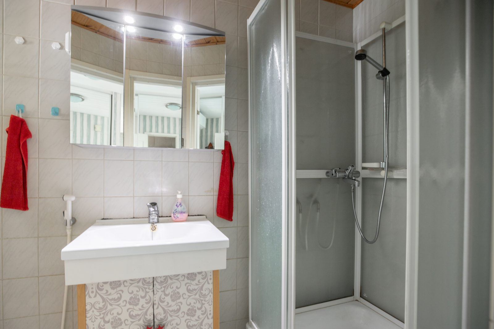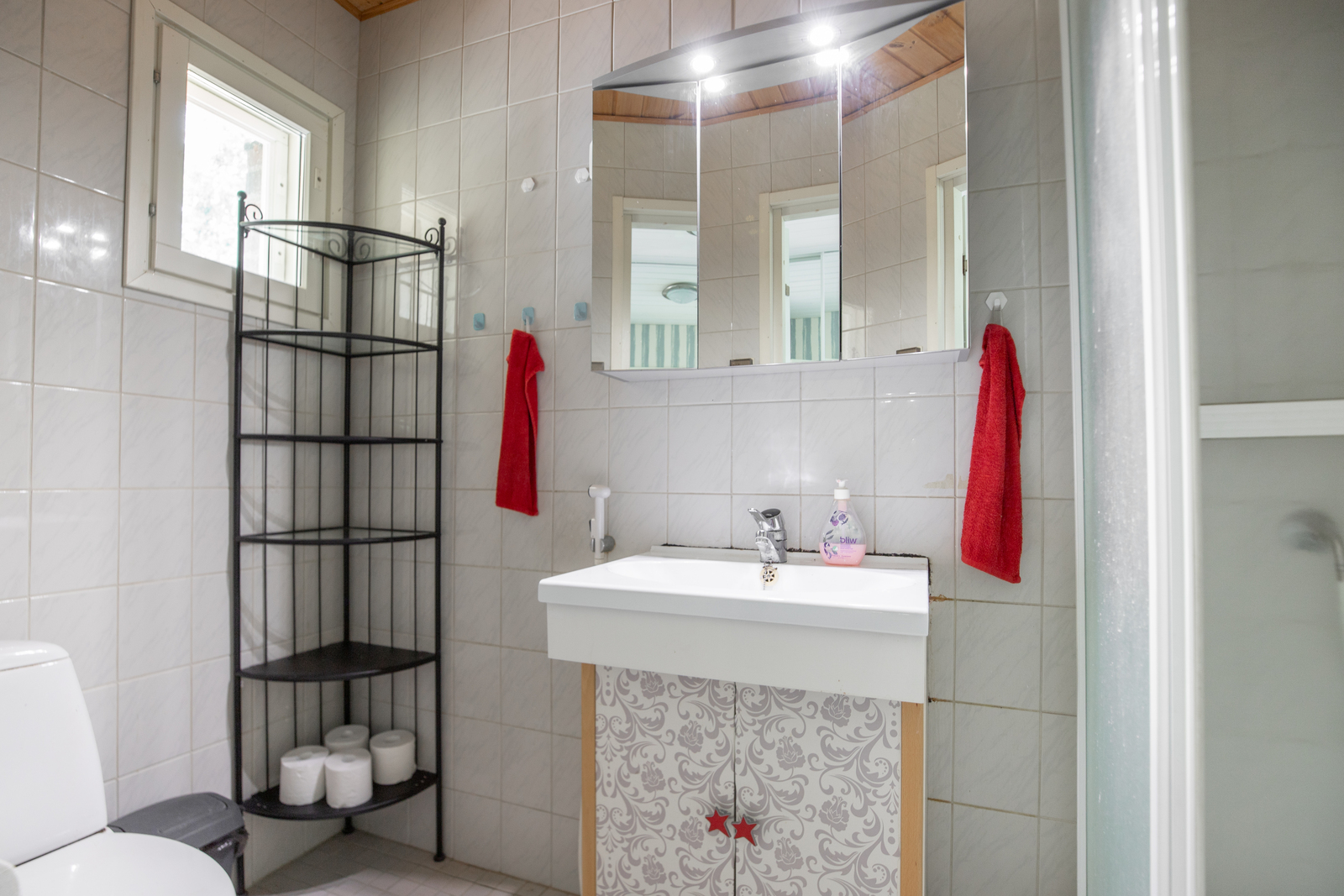 Lukumäärä: 2, Lattialämmitys, suihkukaappi, suihku, peilikaappi ja bidee-suihku, seinät (Kaakeli), lattiat (Laatta) |