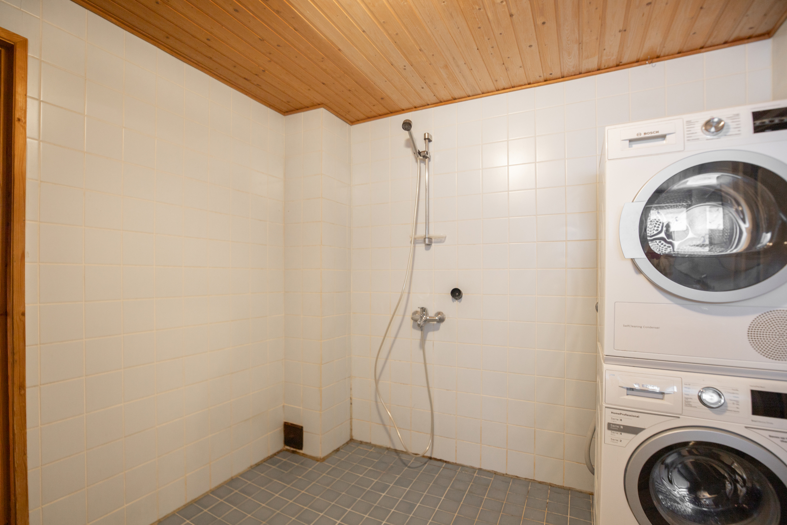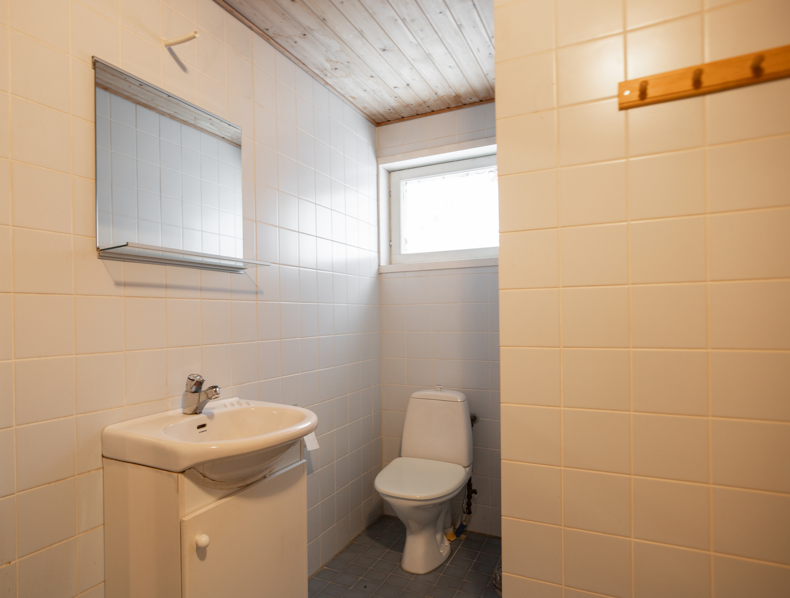 Lattialämmitys, suihku, pesukoneliitäntä ja wc-istuin, seinät (kaakeli), lattiat (laatta), remontoitava |