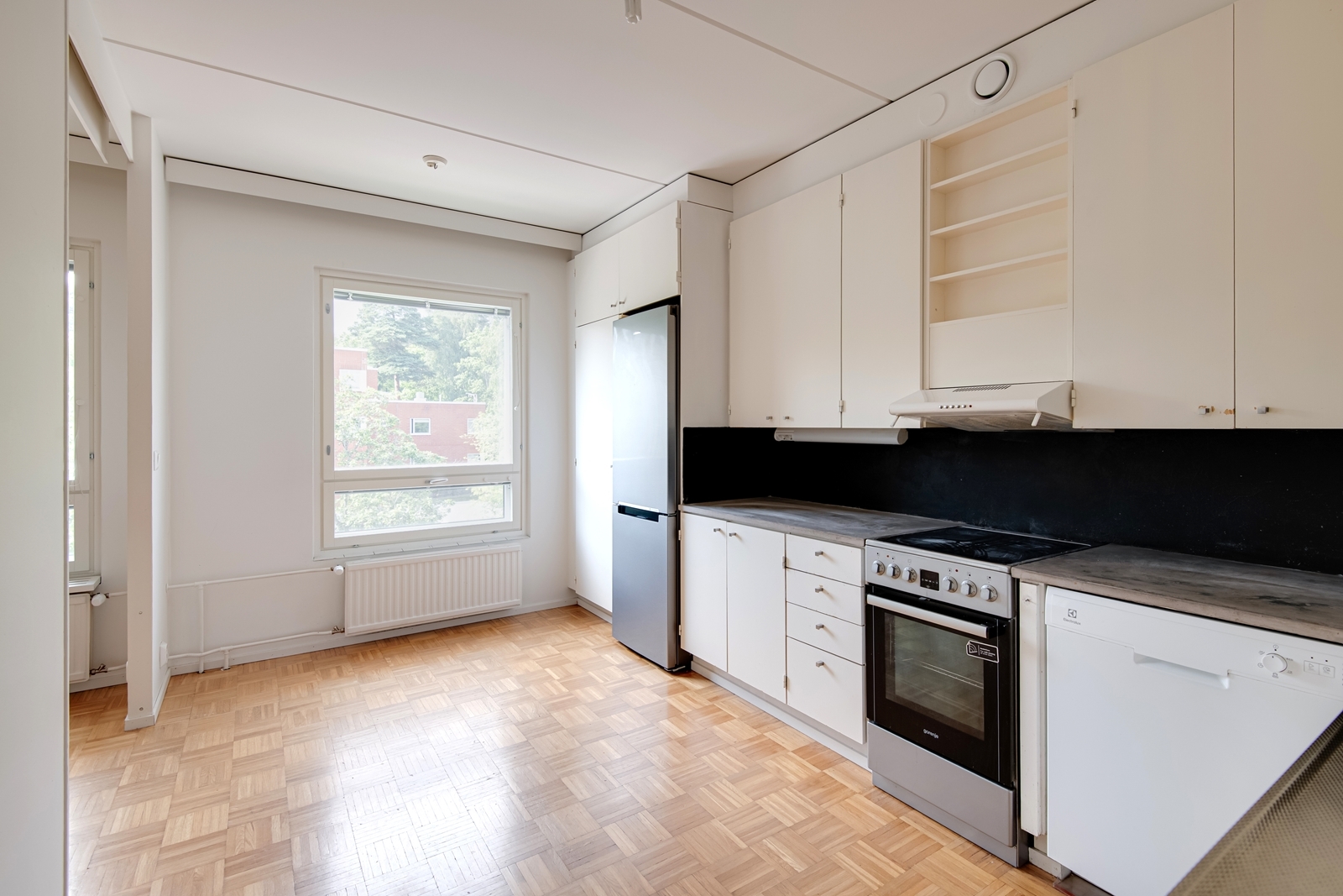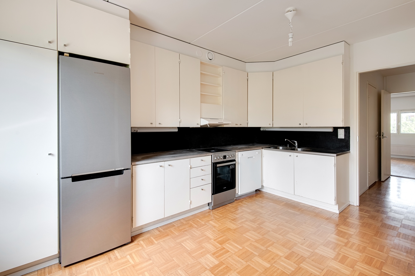 Liesi (Keraaminen liesi ja sähköliesi), lattiat (parketti), liesituuletin, jääkaappipakastin ja liesi |