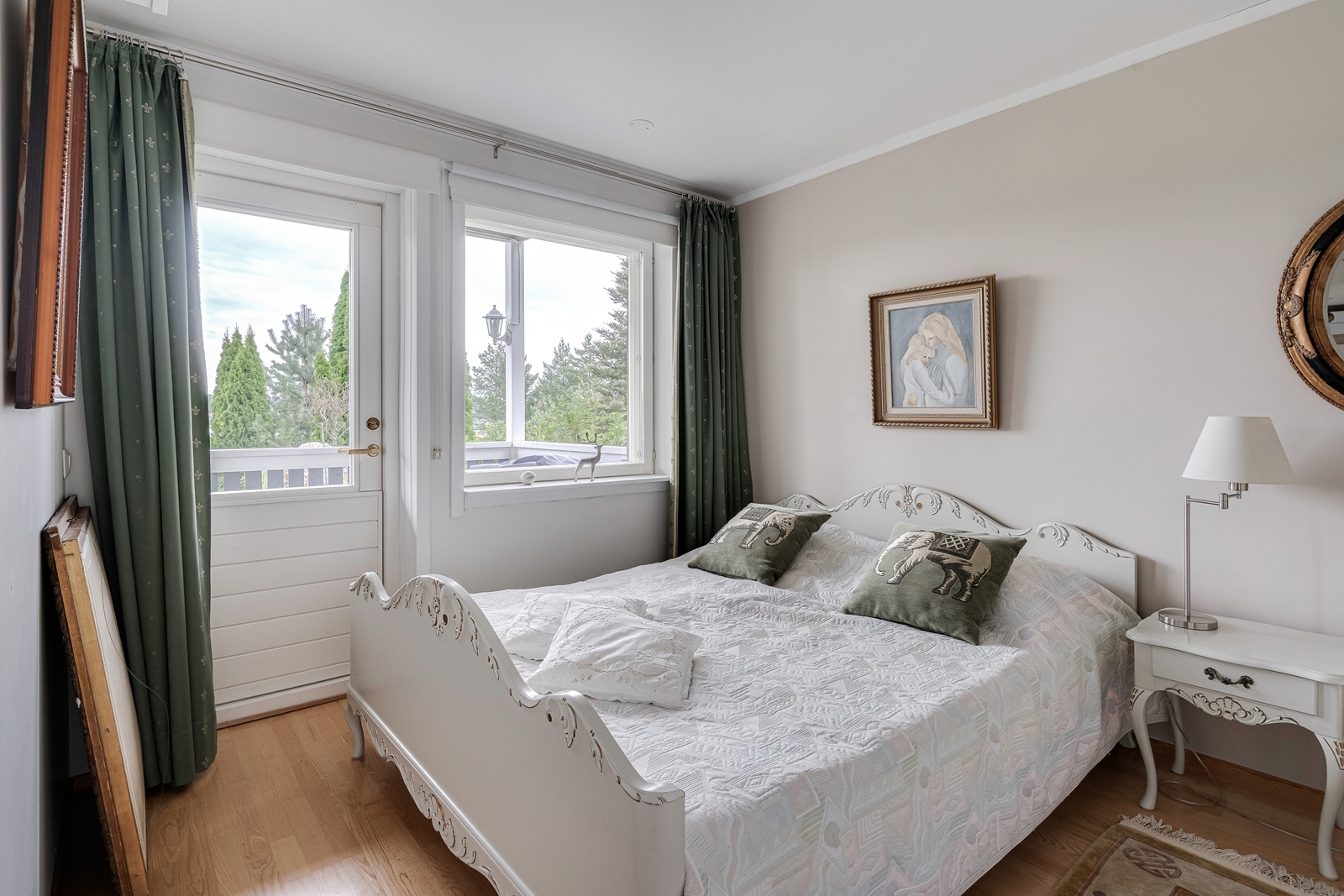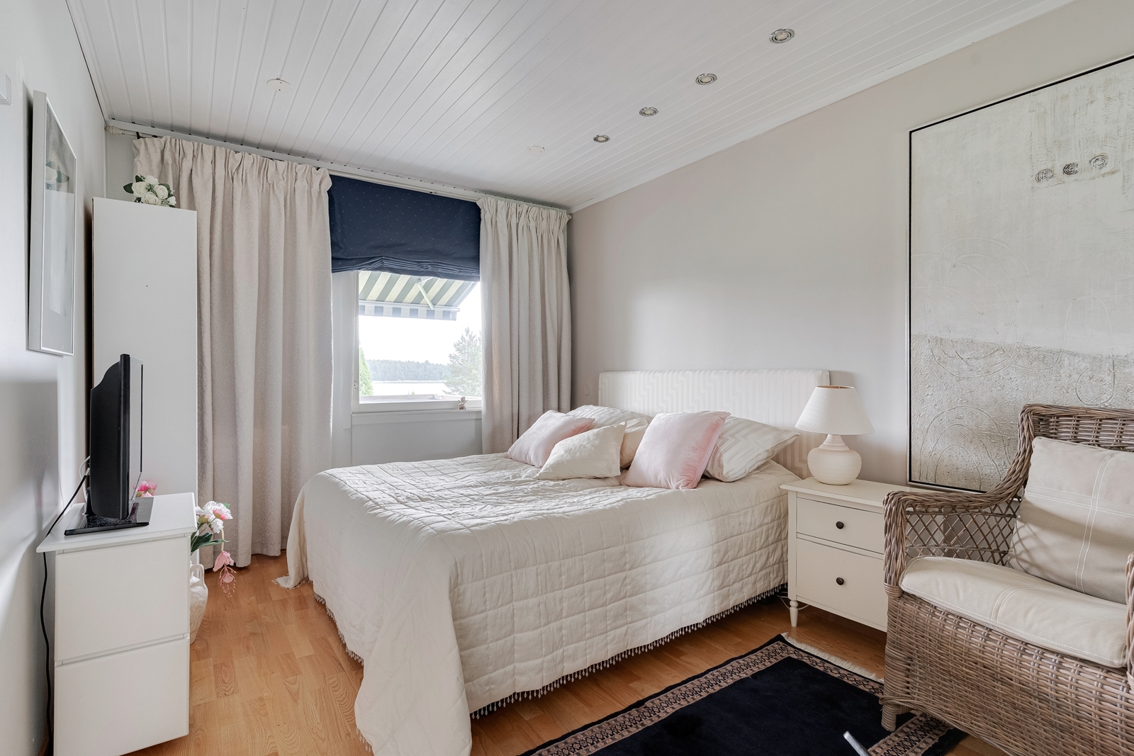 Yläkerrassa yhdistyvät avokeittiö, ruokailutila ja olohuone – kaikki avautuvat suurin ikkunoin kohti merimaisemaa ja viheriöitä. Tilava makuuhuone omalla kylpyhuoneella, poreammeella ja parvekkeella tuo arkeen ripauksen luksusta.