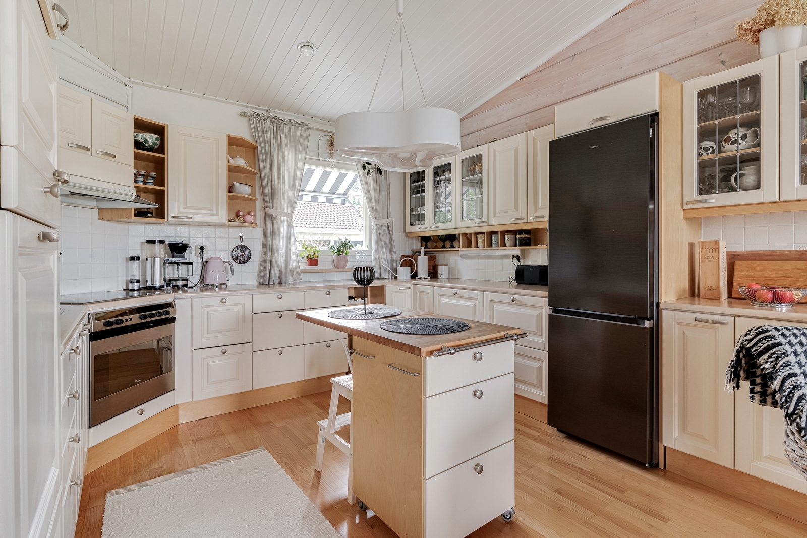 Liesi (Keraaminen liesi ja erillisuuni), työtasot (laminaatti), erillisuuni, jääkaappipakastin, liesituuletin, astianpesukone, keittiösaareke ja kiinteät valaisimet |