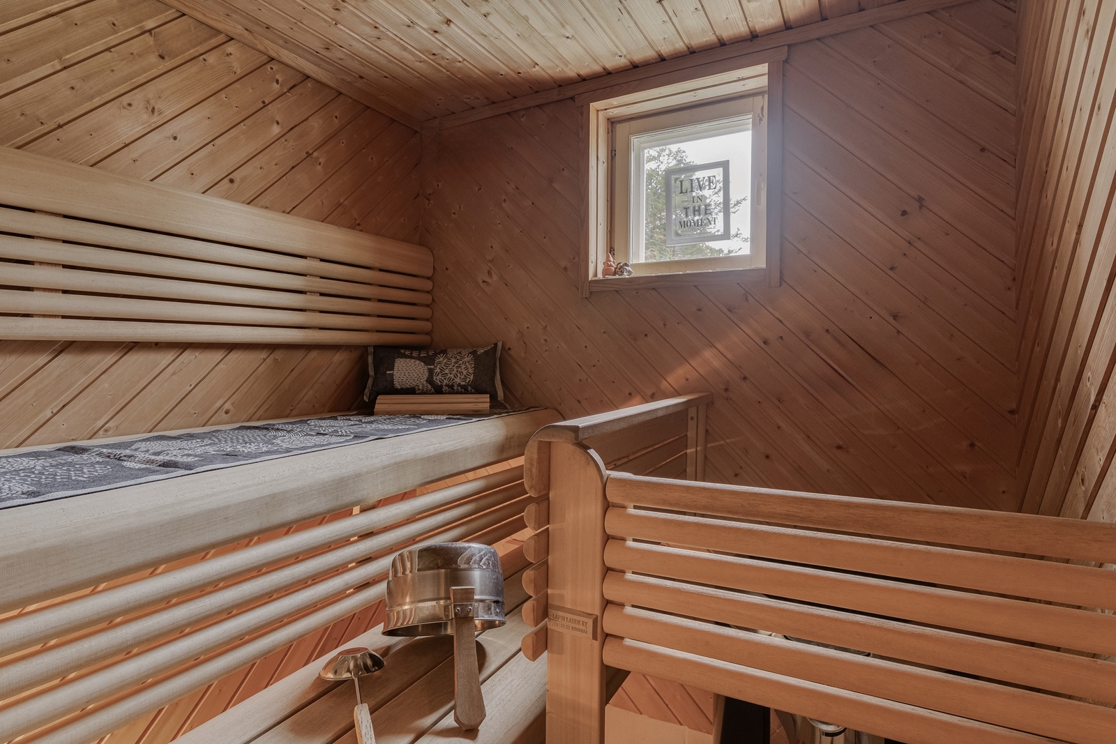 Seinät (puu), lattiat (laatta), Heti valmis -sähkökiuas, Upea sauna, muotoilut lauteet ja ikkuna.