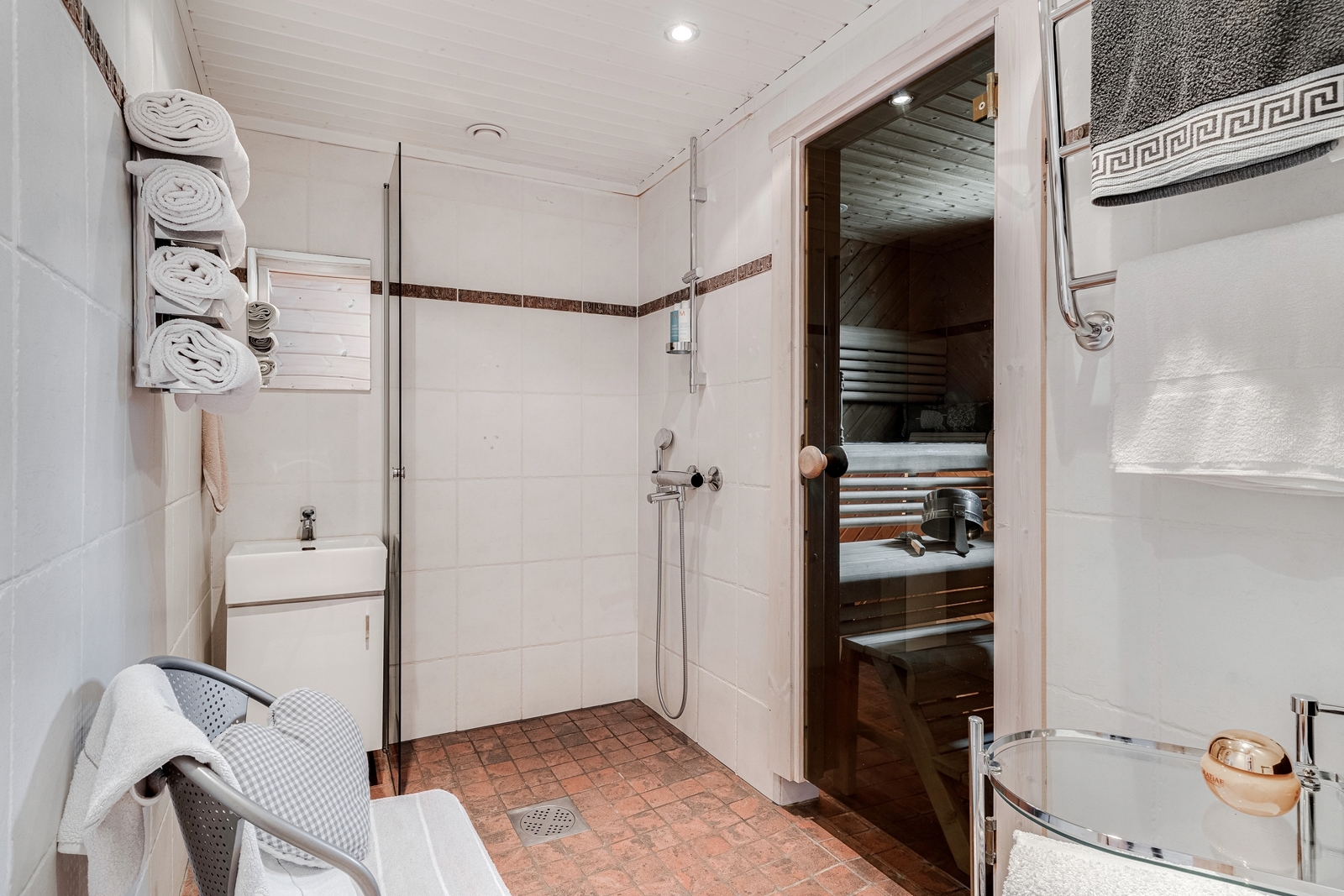 Alakerrassa on tunnelmallinen takkahuone, kaksi huonetta, saunaosasto ja kodinhoitotilat – täydellinen rentoutumiseen ja yhdessäoloon.