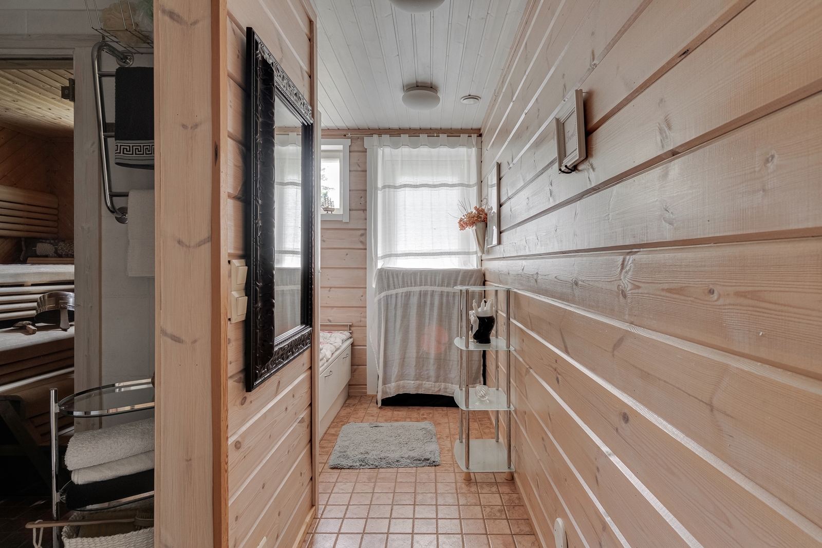 Saunan yhteydessä pukeutumistila josta käynti terassille vilvoittelemaan. |