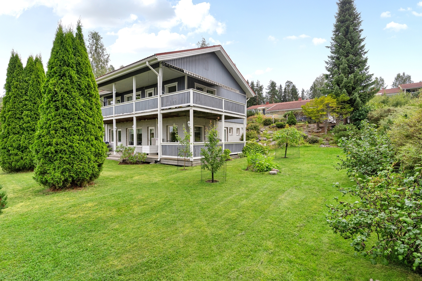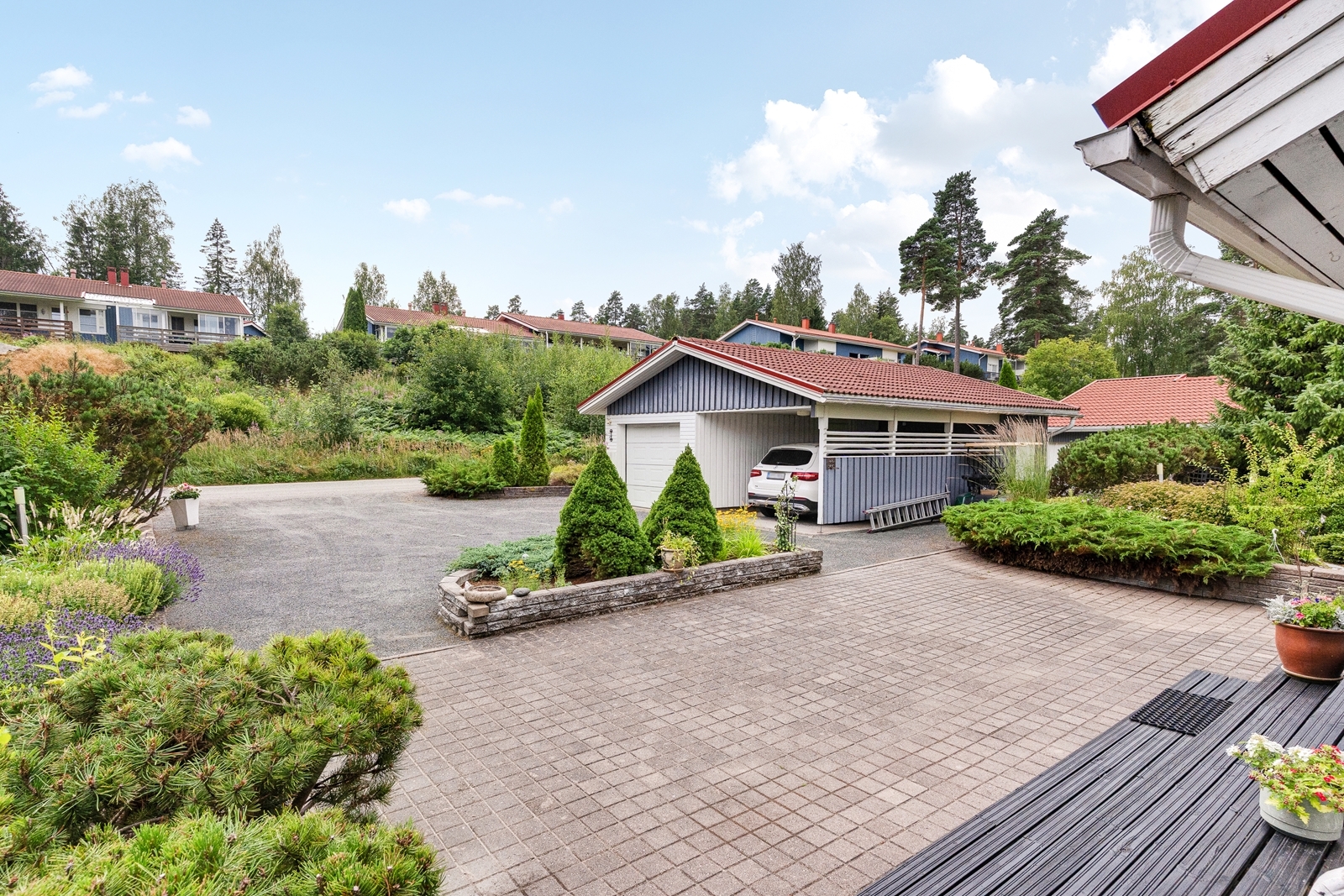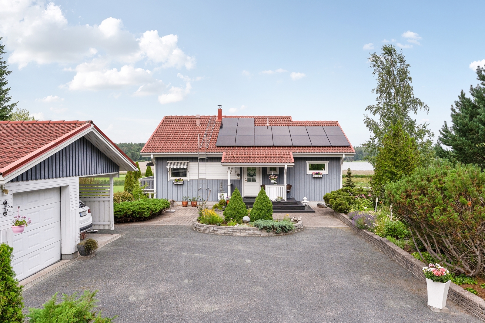 Kauniisti hoidettu piha, autokatos, varasto sekä aurinkopaneelit, ilmalämpöpumput ja avotakka tekevät asumisesta sekä mukavaa että energiatehokasta.