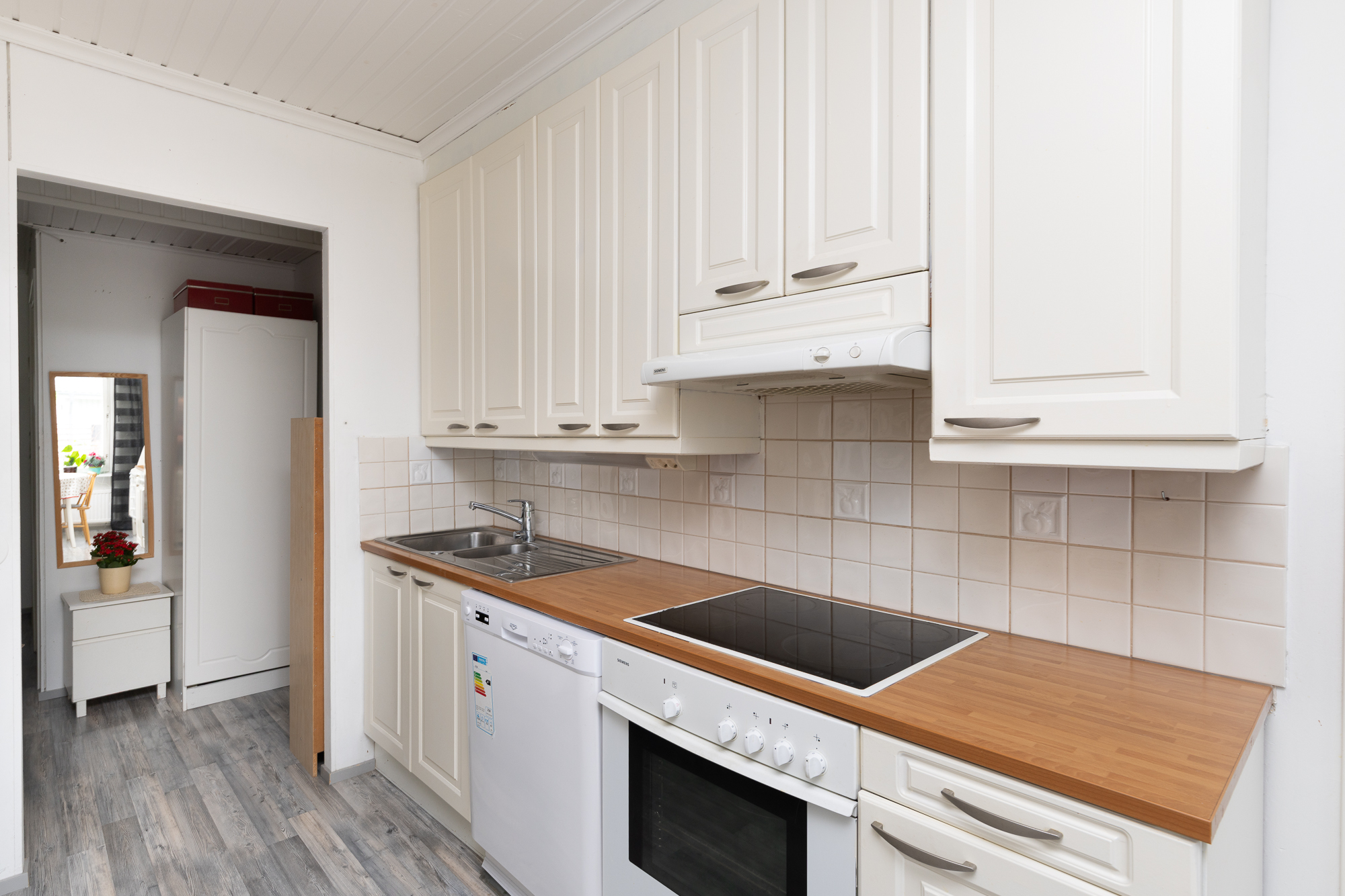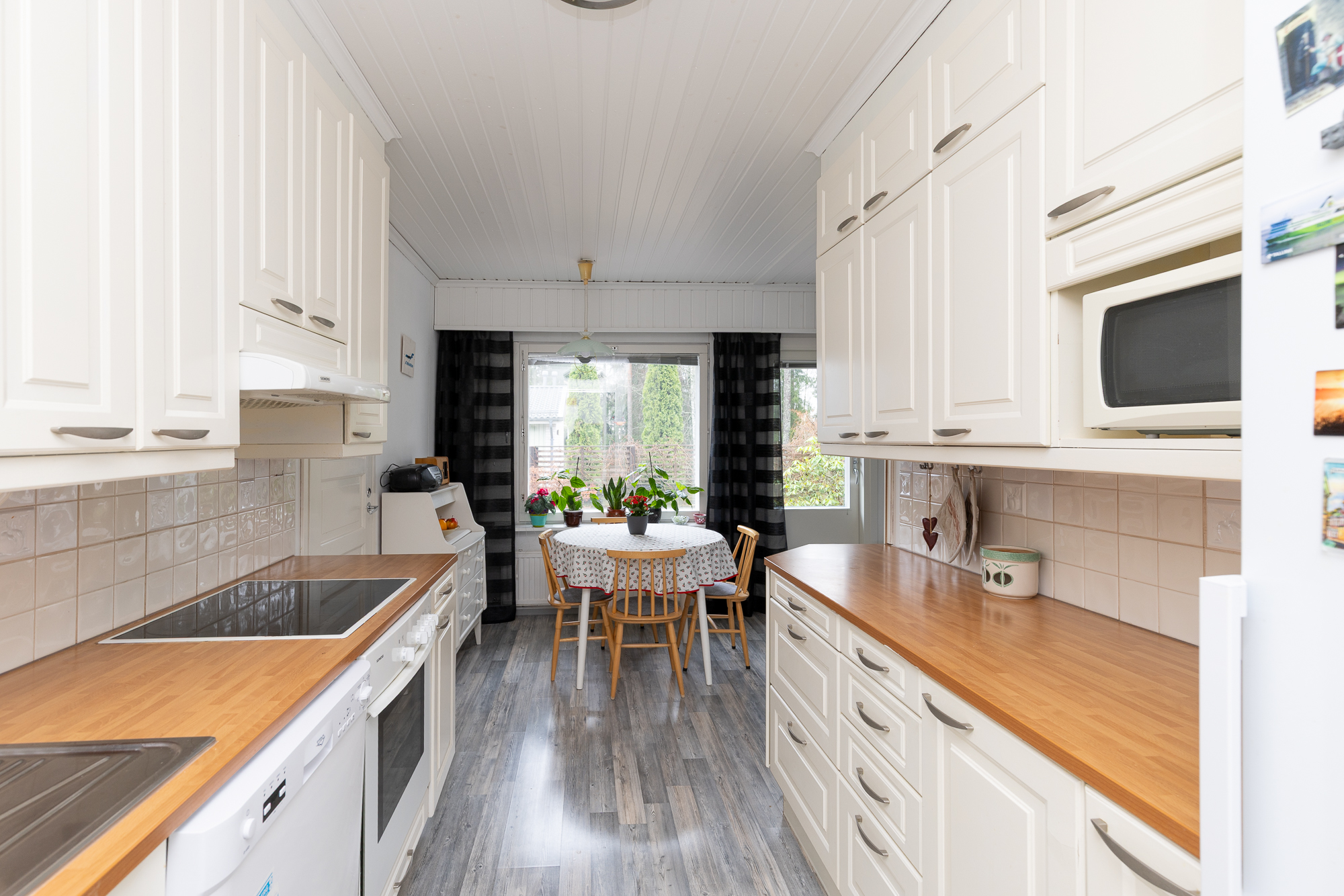 Liesi (Keraaminen liesi), työtasot (laminaatti), seinät (maali), lattiat (laminaatti), jääkaappipakastin (2022), erillisuuni, liesituuletin, liesi ja astianpesukone |