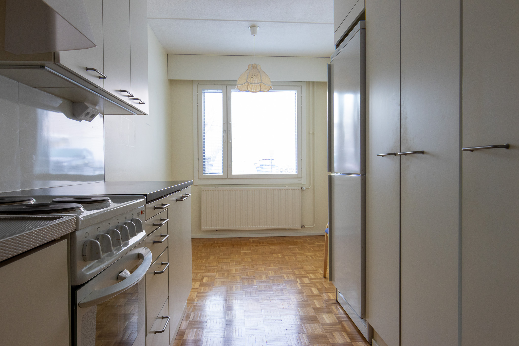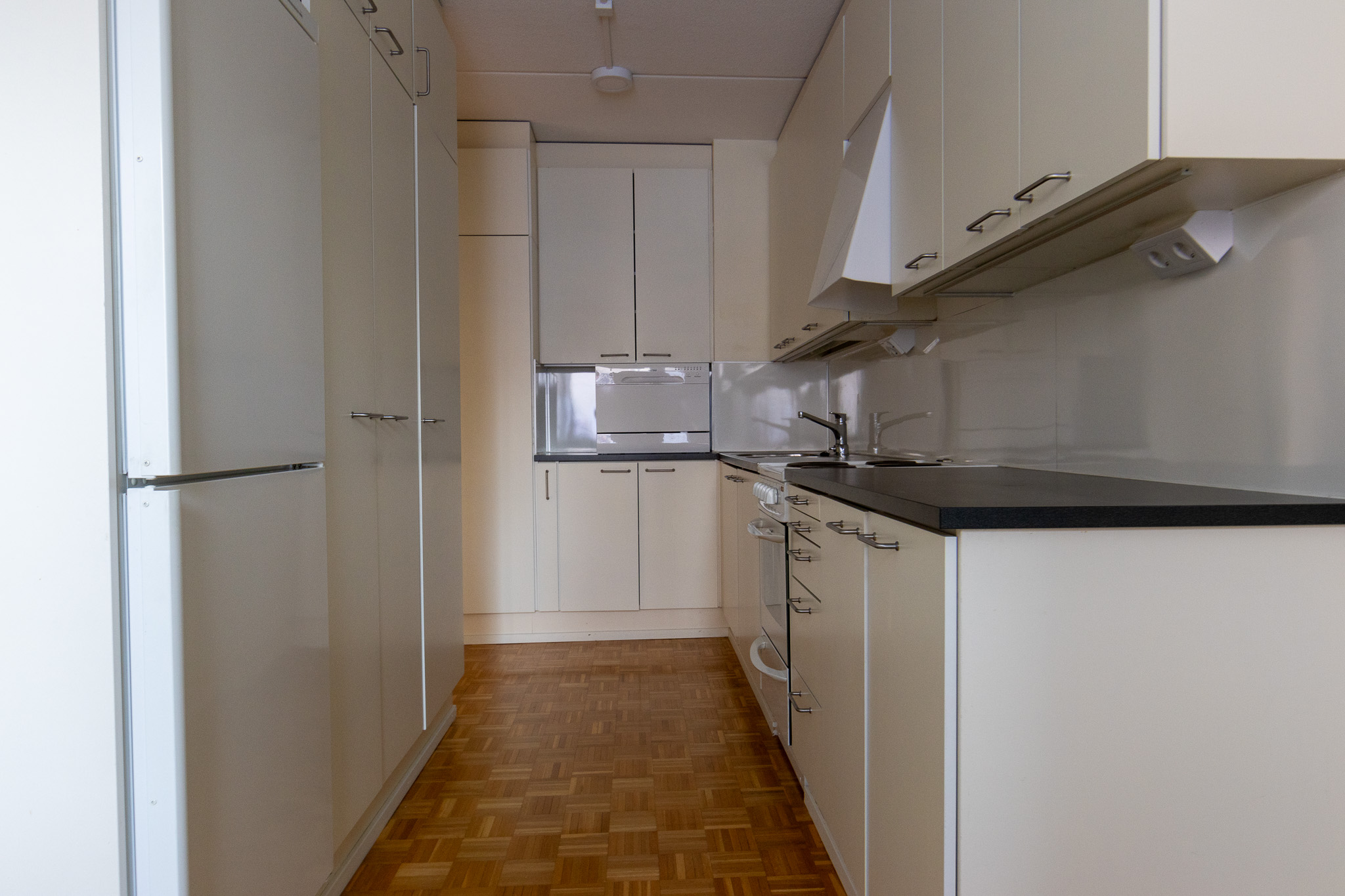 Liesi (Sähköhella), työtasot (laminaatti), seinät (maali), lattiat (parketti), jääkaappipakastin, liesi, astianpesukone ja liesituuletin |