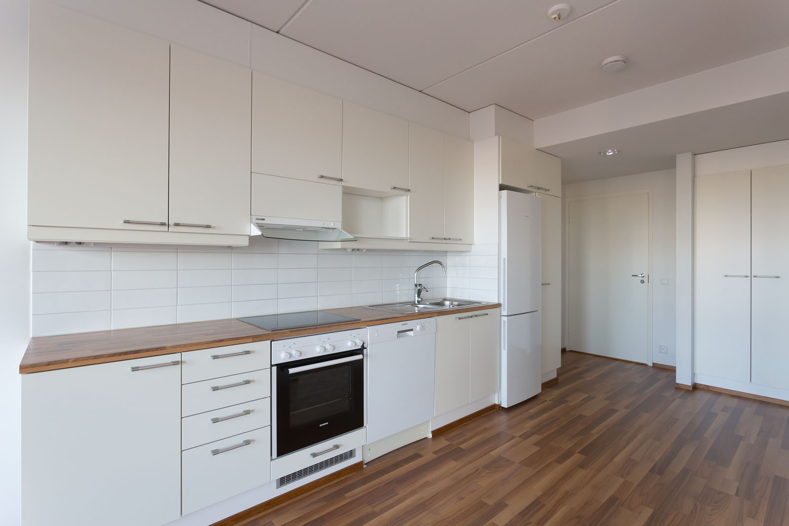 | Keittiön kuvaus | Liesi (liesitaso, erillisuuni), työtasot (laminaatti), seinät (maali), lattiat (laminaatti), astianpesukone, liesituuletin, erillisuuni, jää-viileäkaappi ja kiinteät valaisimet, liesitaso |