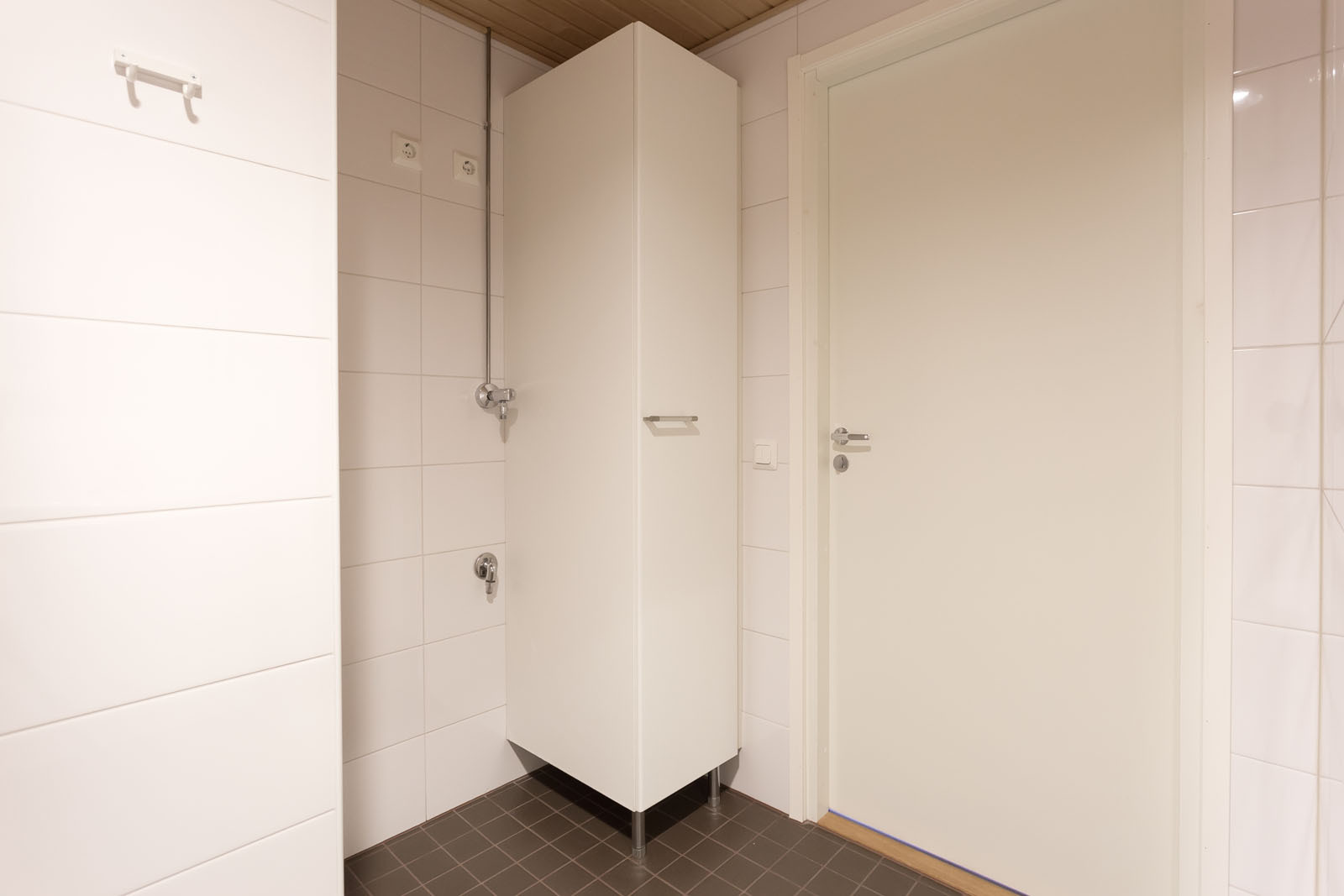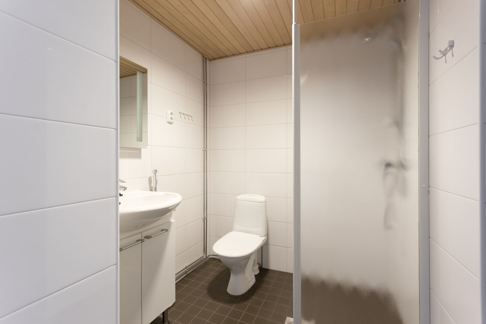 | Kylpyhuoneen kuvaus | Suihkuseinä, peili, allaskaappi, pesukoneliitäntä, lattialämmitys, wc-istuin, suihku ja kiinteät valaisimet, seinät (kaakeli), lattiat (laatta) |