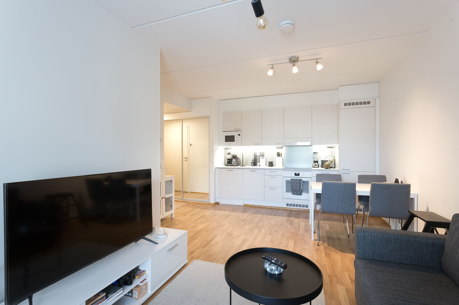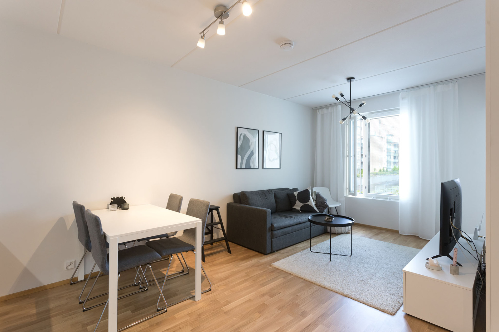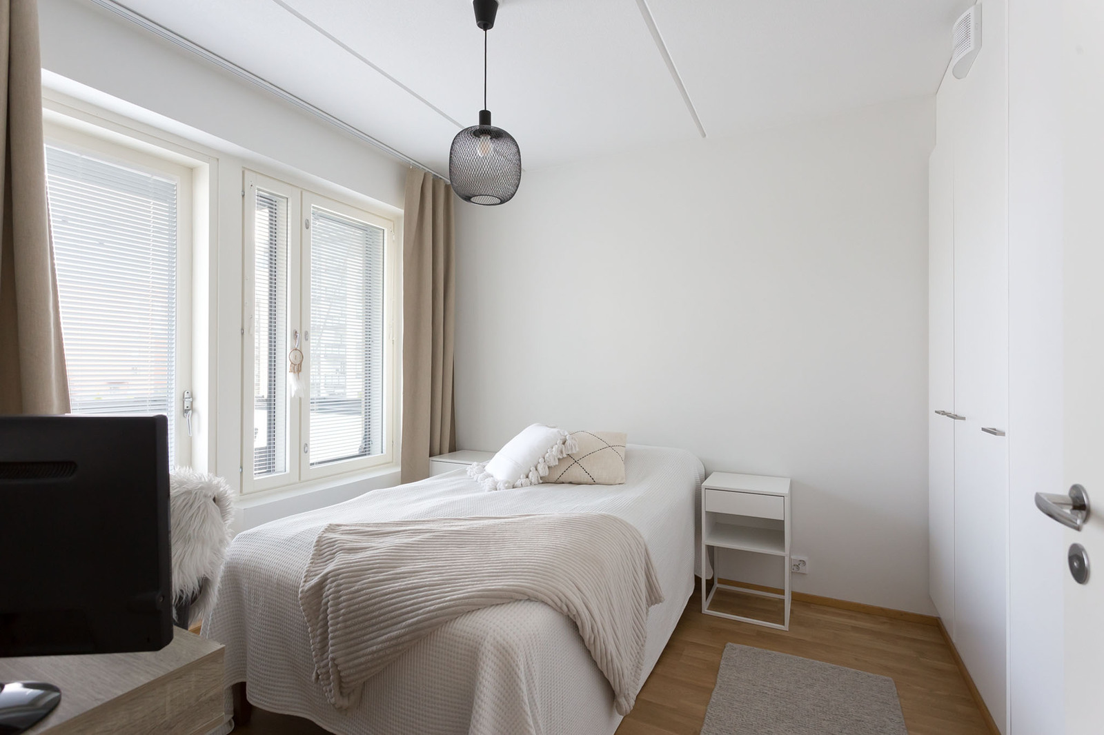Lisätietoja sisältyvistä varusteista: huoneistokohtainen jäähdytyskone, kaapistot, kiinteät valaisimet, sälekaihtimet/rullaverhot, verhotangot |