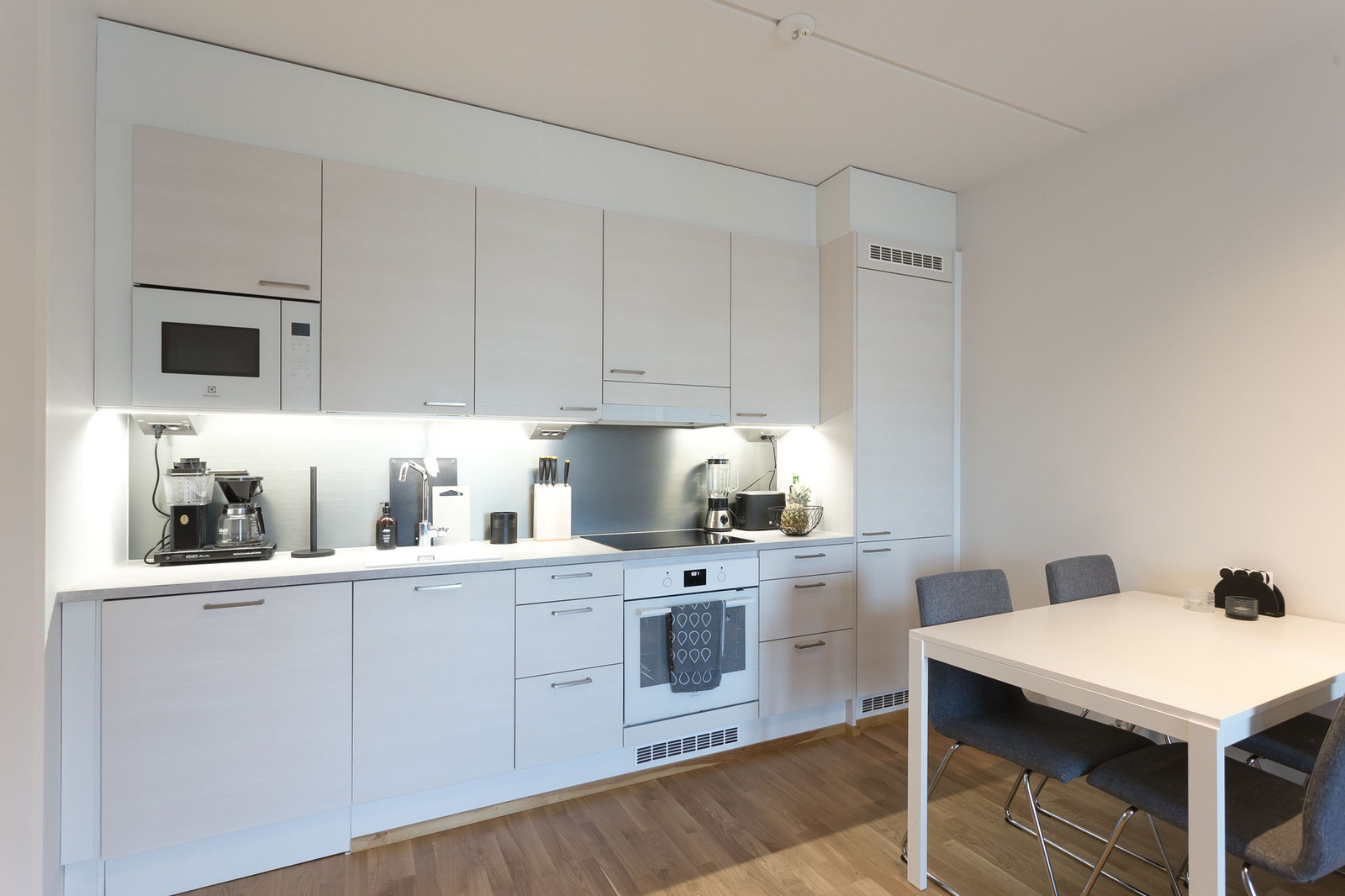 Liesi (Induktioliesi ja erillisuuni, liesitaso), työtasot (laminaatti), seinät (maali), lattiat (parketti), liesi, mikroaaltouuni, jääkaappipakastin, erillisuuni, liesituuletin, astianpesukone ja kiinteät valaisimet, liesitaso |