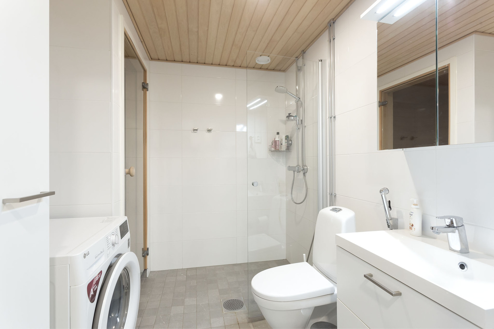 Peilikaappi, suihkuseinä, allaskaappi, suihku, pesukoneliitäntä, lattialämmitys, wc-istuin ja kiinteät valaisimet, seinät (kaakeli), lattiat (laatta) |